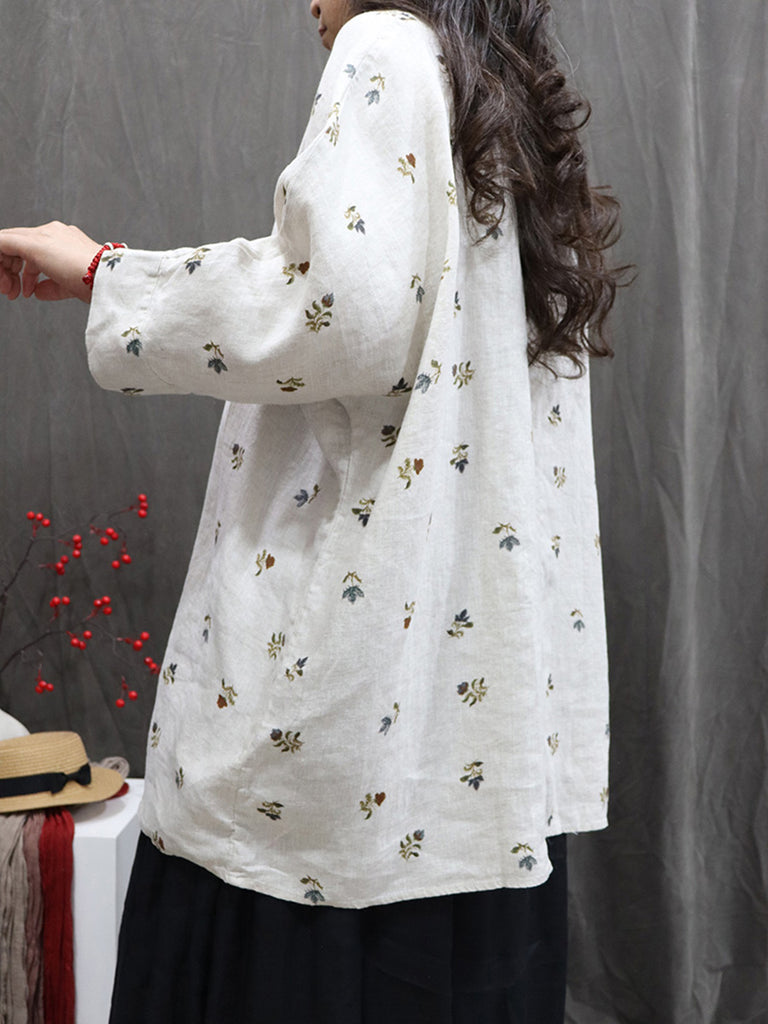 レディース 秋 ヴィンテージフラワー 100%リネン Vネックブラウス