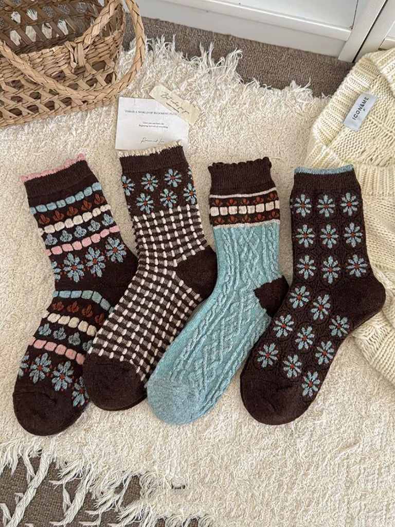 レディース 冬用 ヴィンテージ フラワー チェック柄 ソックス 4足組