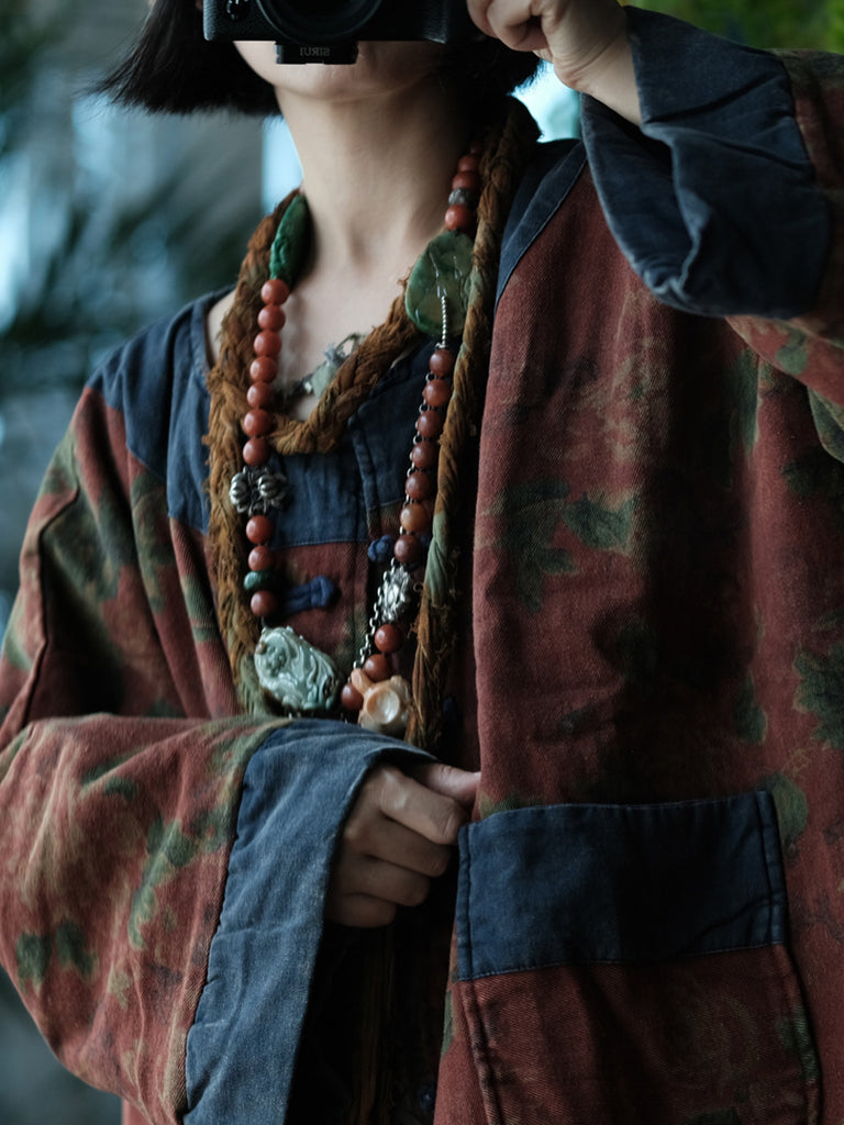 レディース 秋 ヴィンテージ フラワー スプライス Vネック パッド入りコート