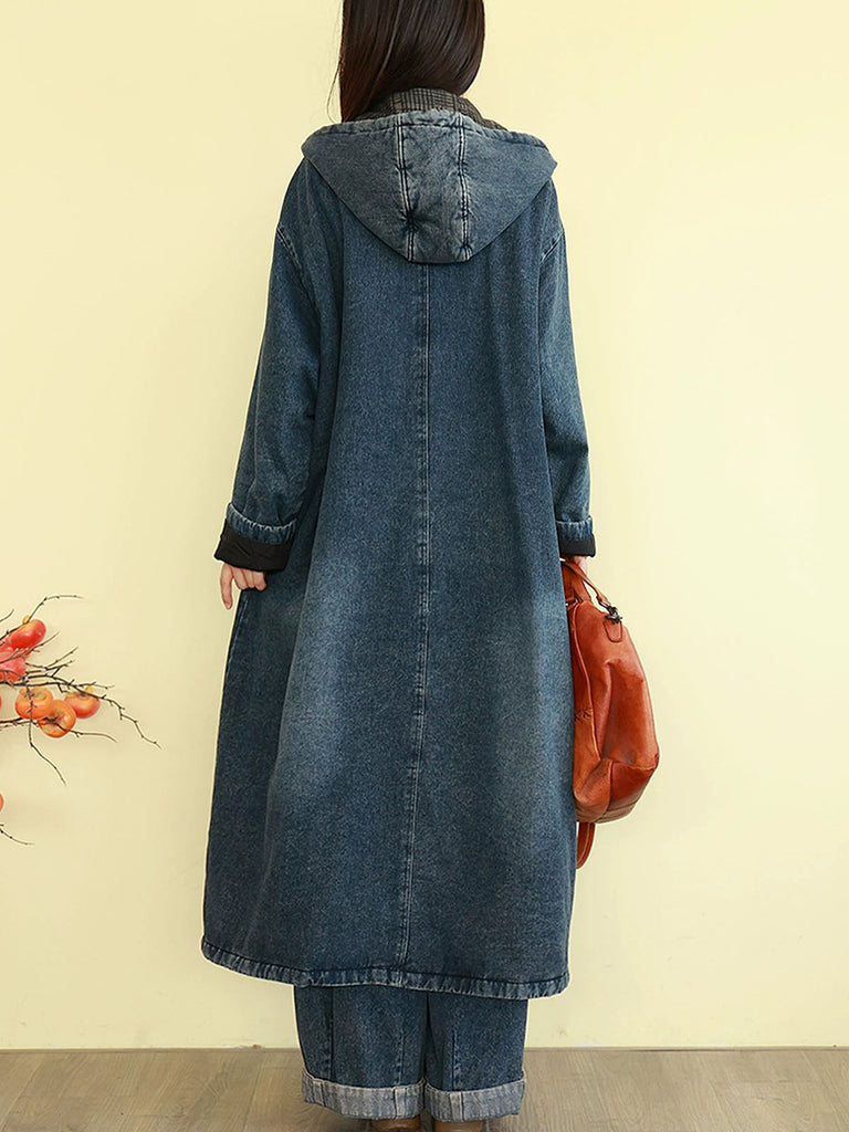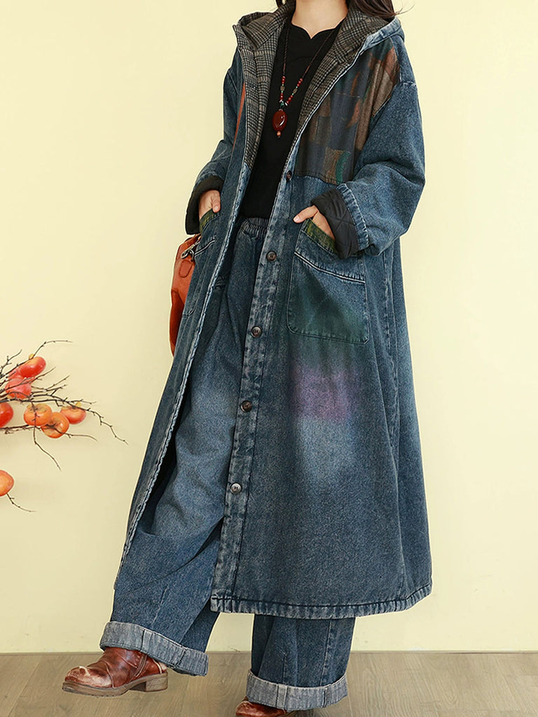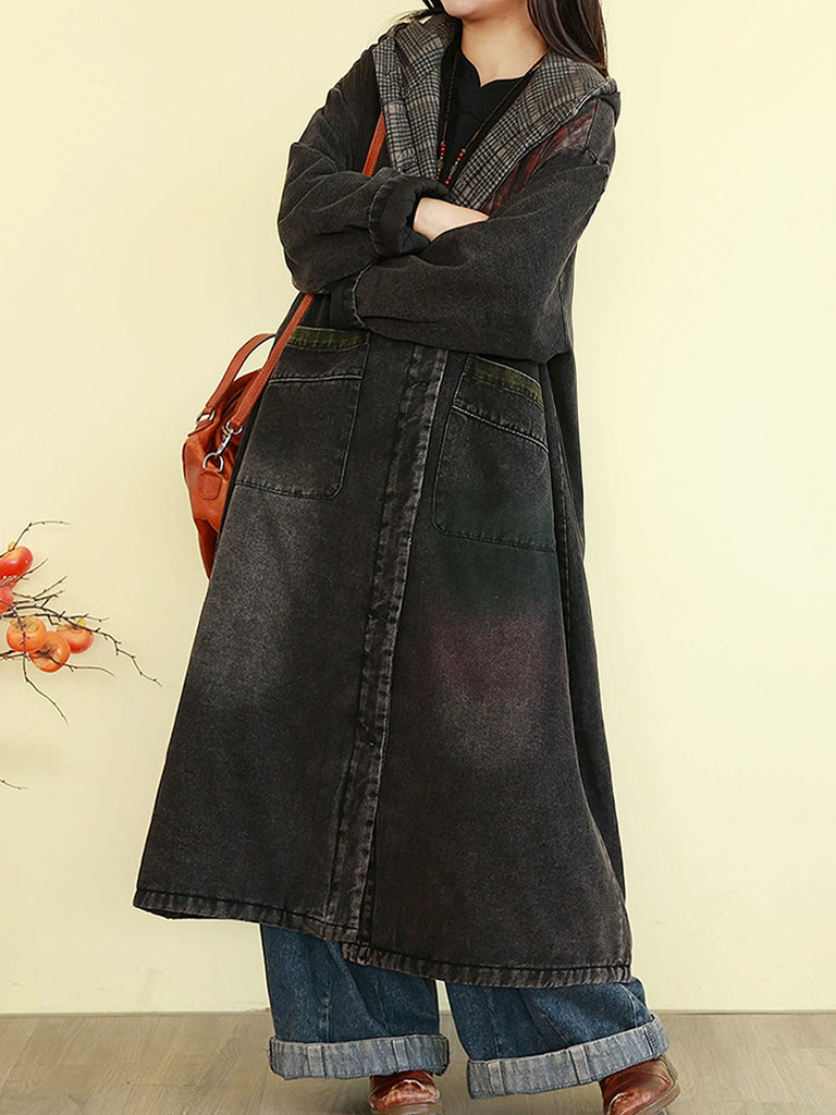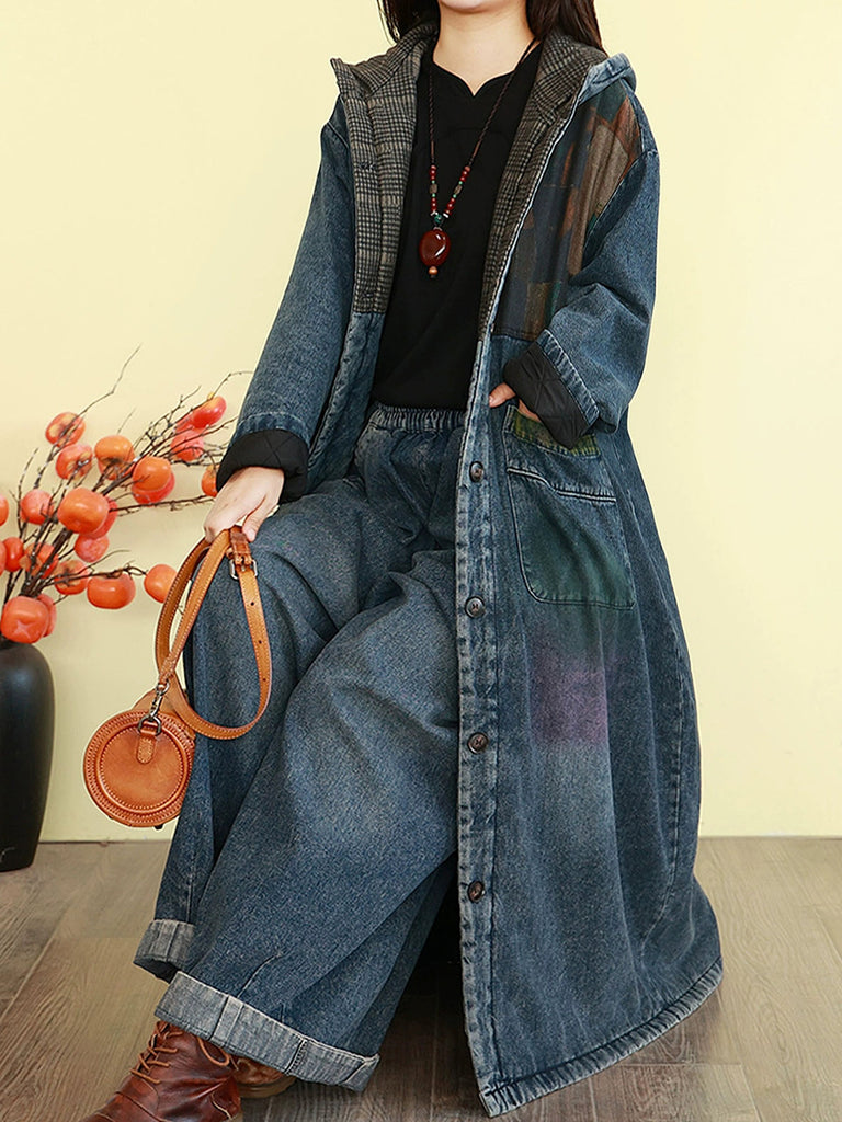 レディース ヴィンテージデニム スプライス パッド入り フード付き ロングコート