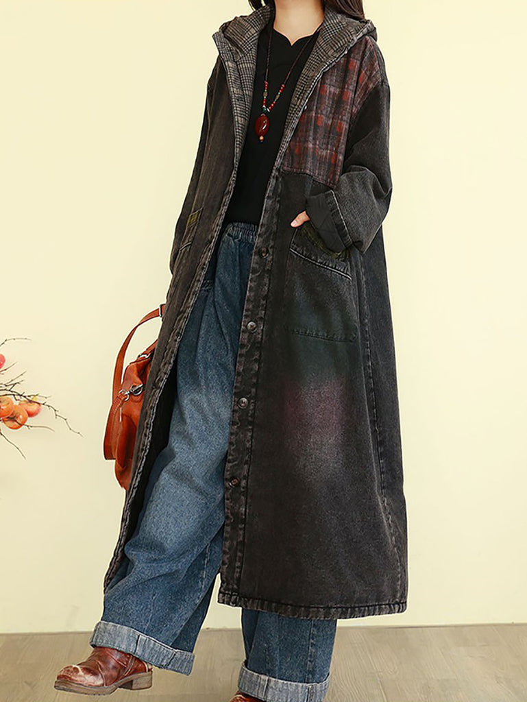 デニム生地を使用したヴィンテージ風のロングコートは、継ぎ接ぎデザインと中綿入りで保温性も抜群。フード付きの襟とラグランスリーブがレトロな雰囲気を醸し出し、秋冬シーズンに最適です。