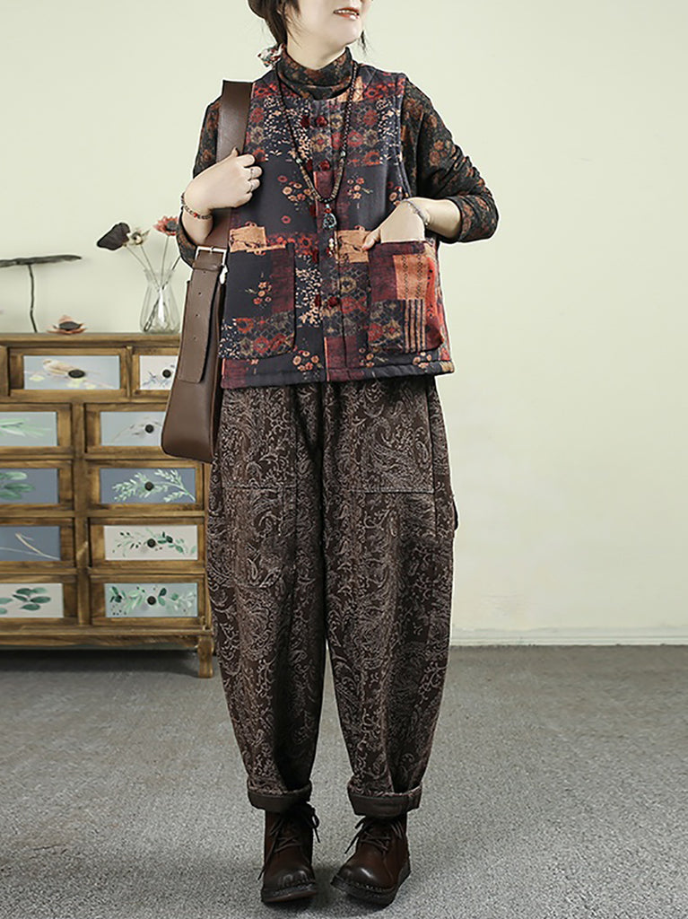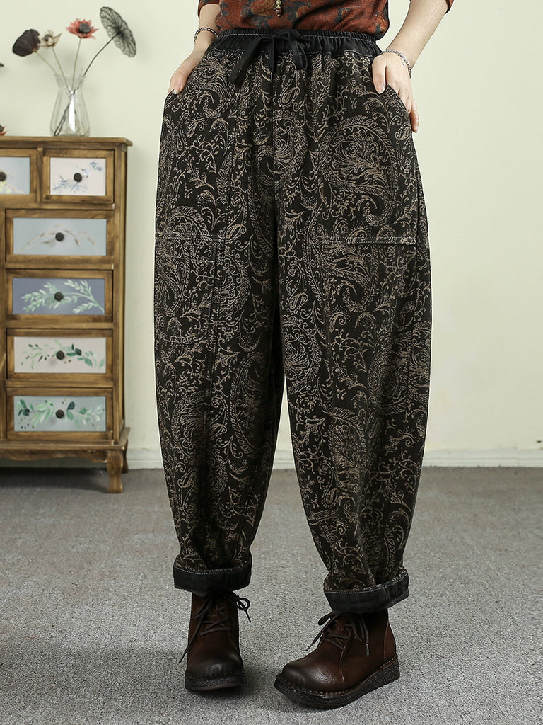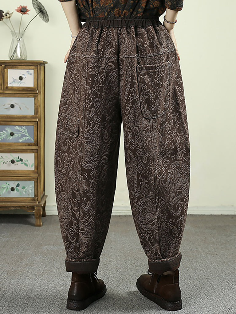 レディース 冬 レトロフラワー ジャカード フリース裏地 ハーレムパンツ