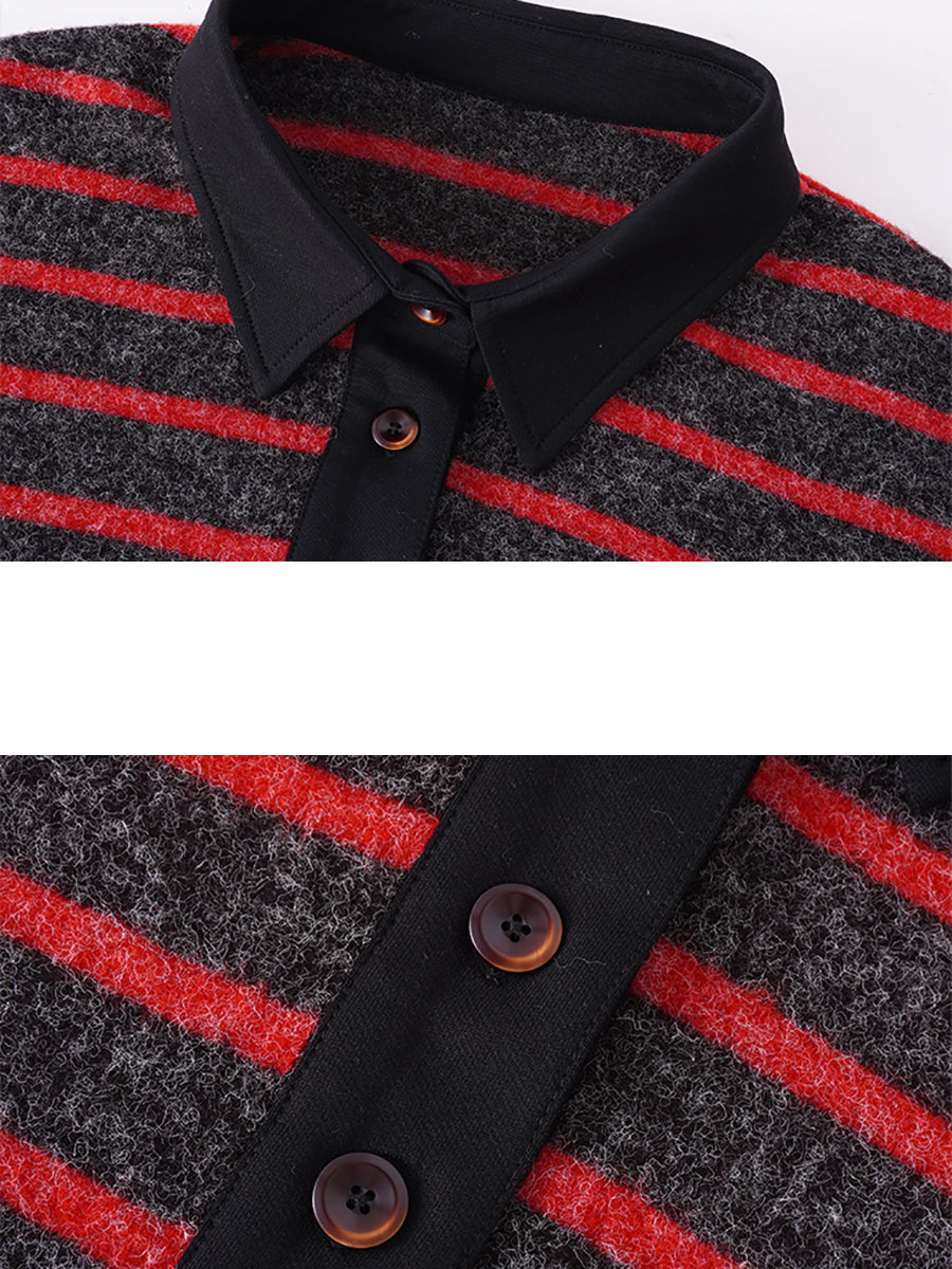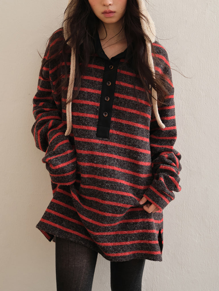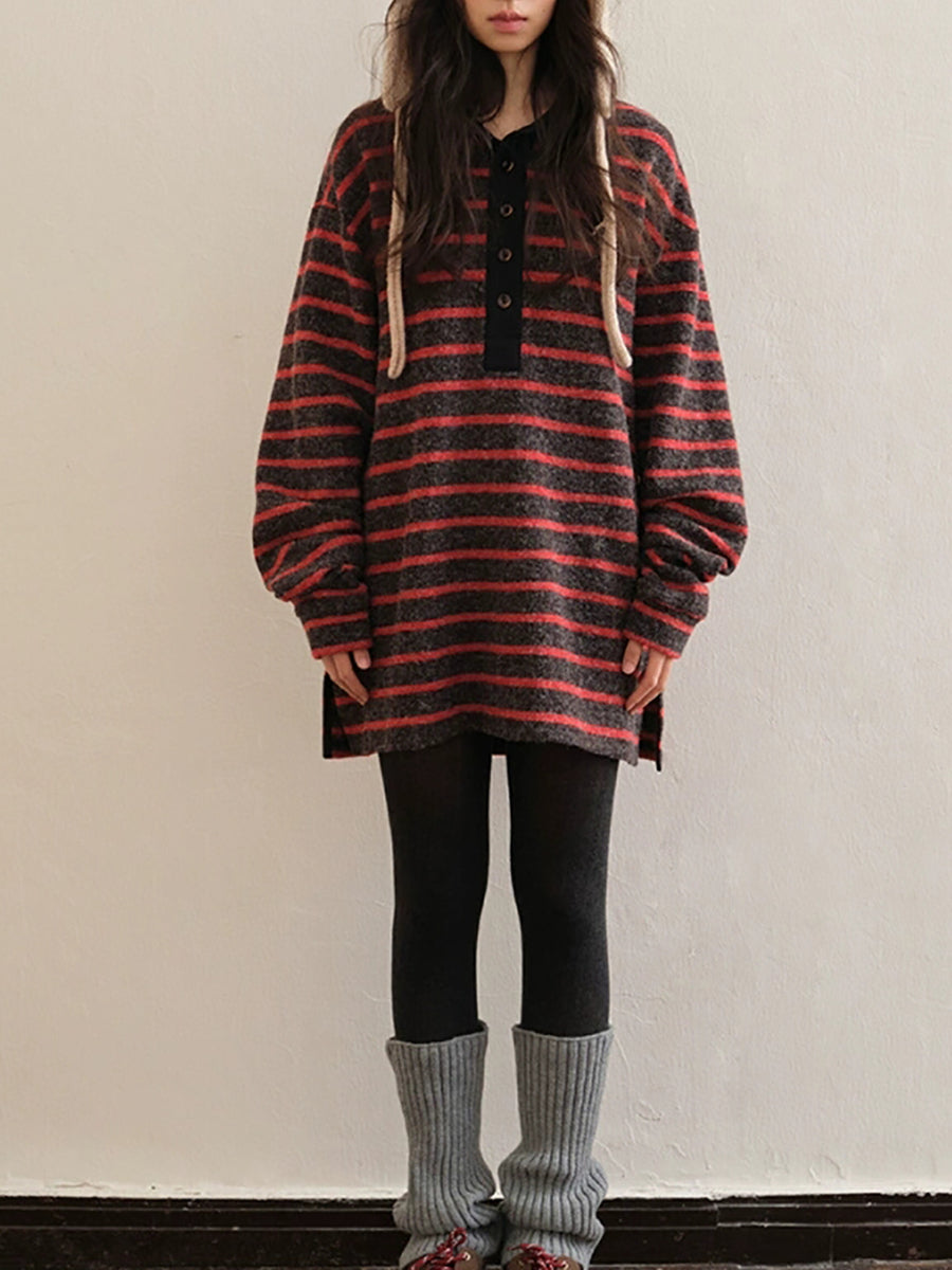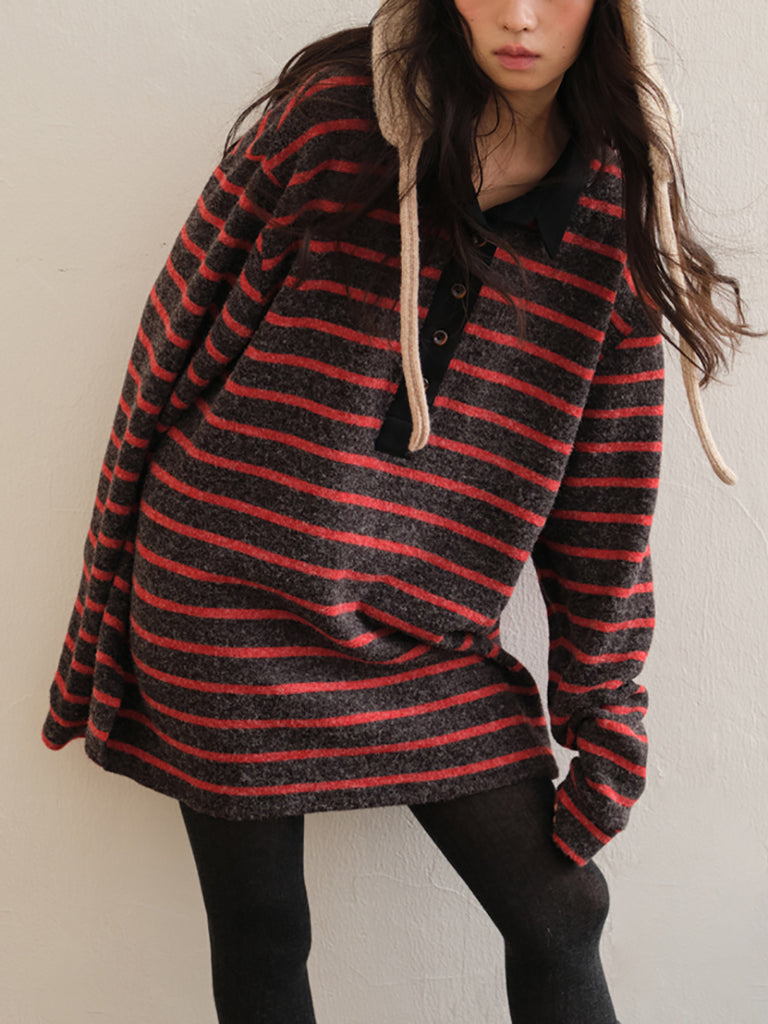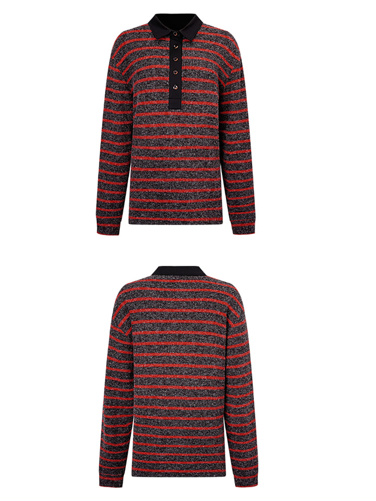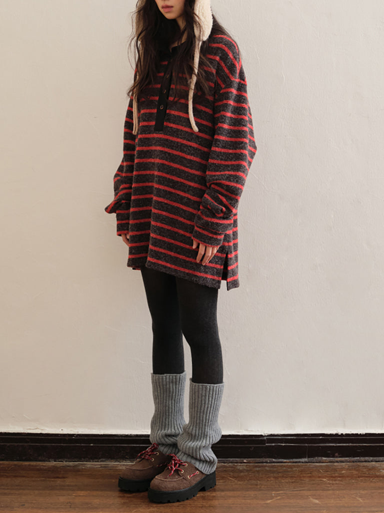 レディース 秋 ヴィンテージ ストライプ ポロカラー ロングセーター