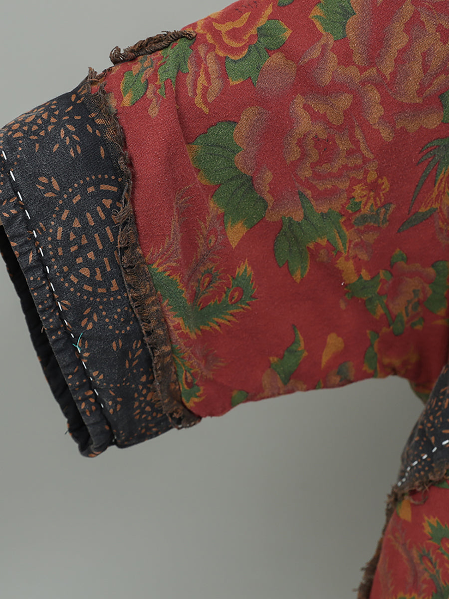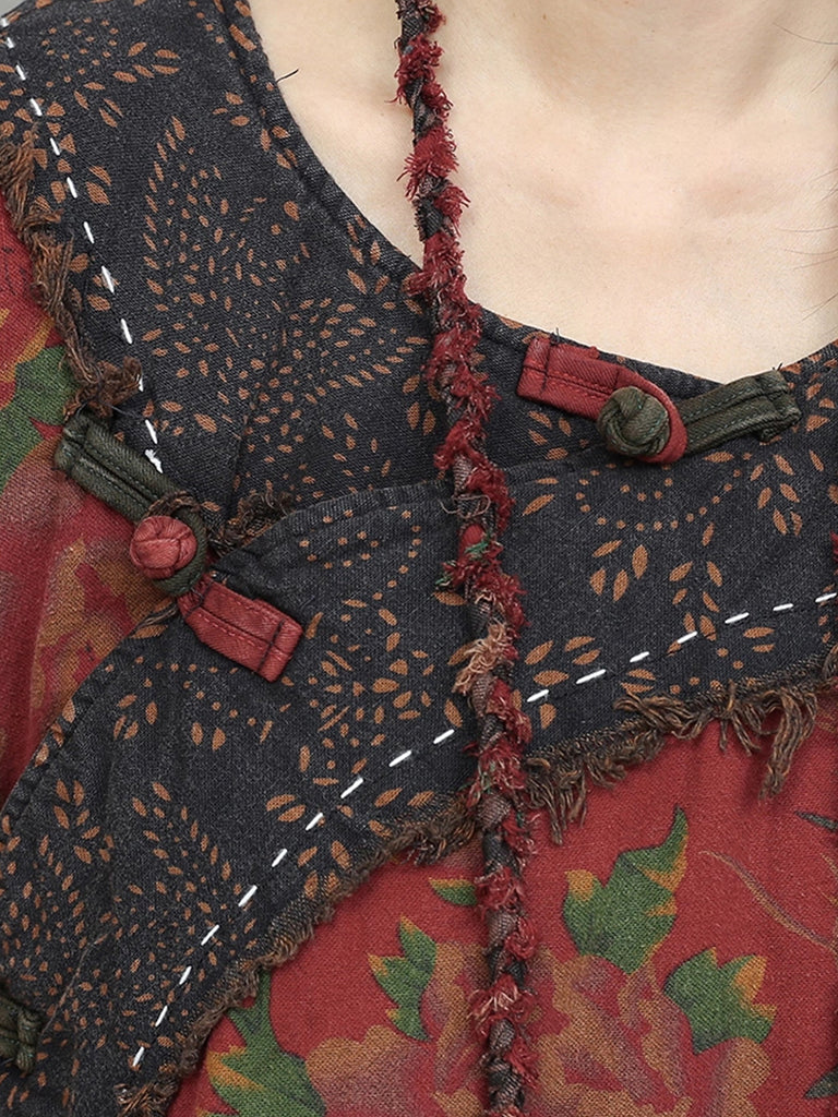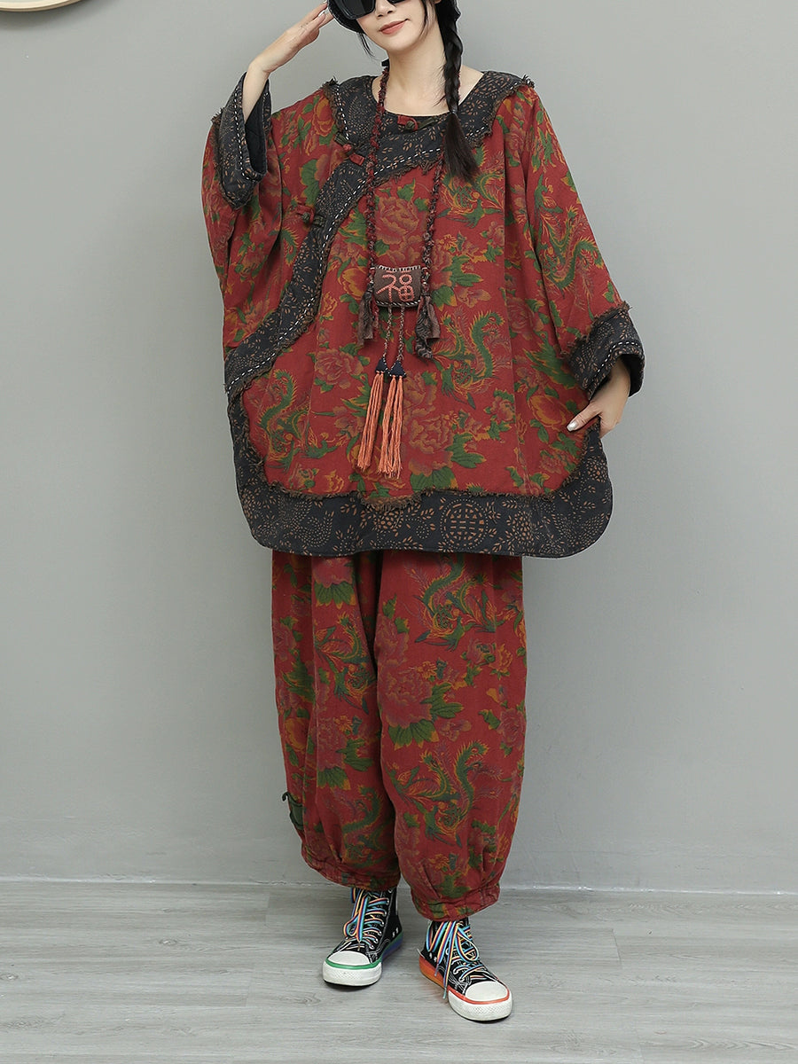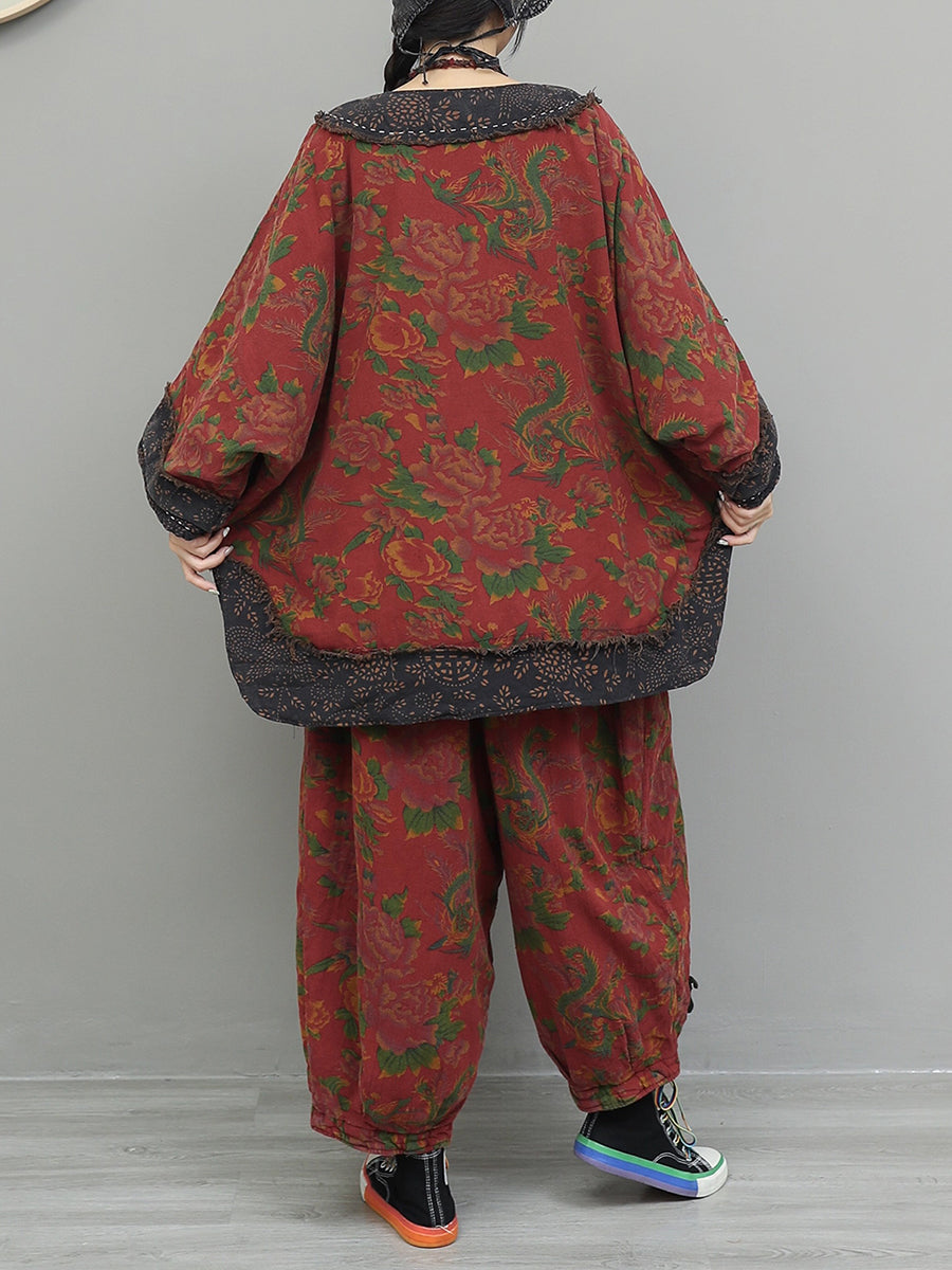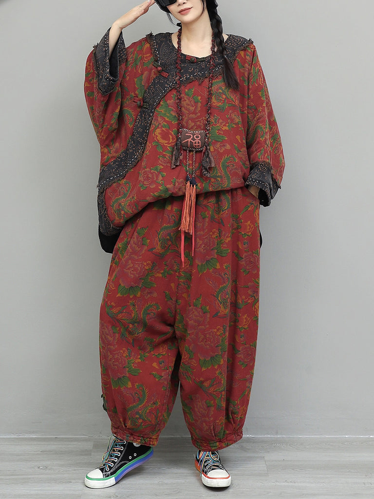 レディース 冬 レトロ フラワー スプライス Oネック スーツ