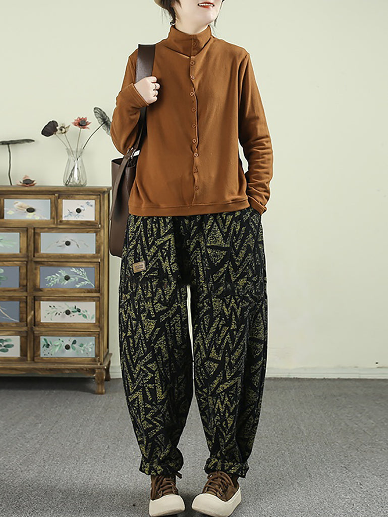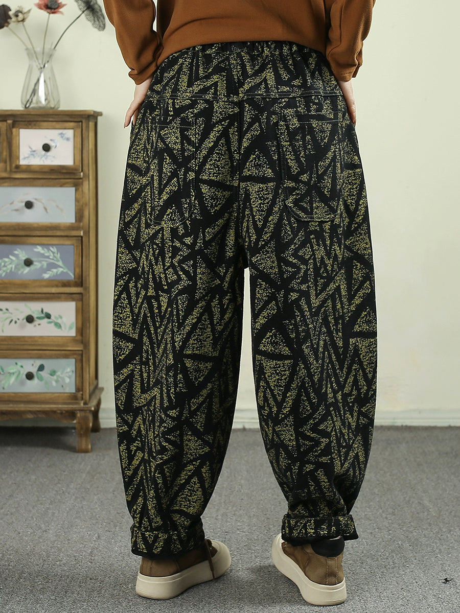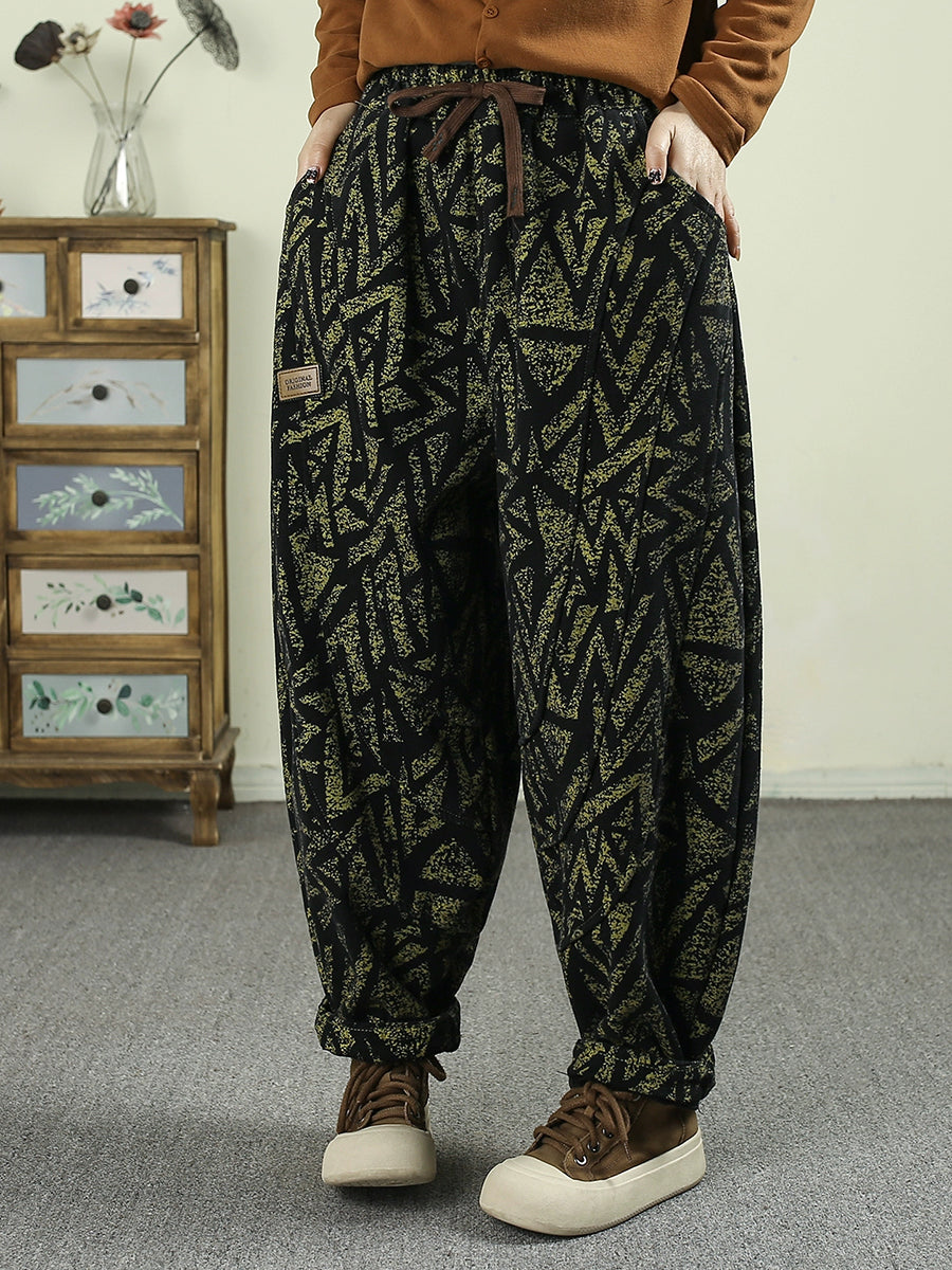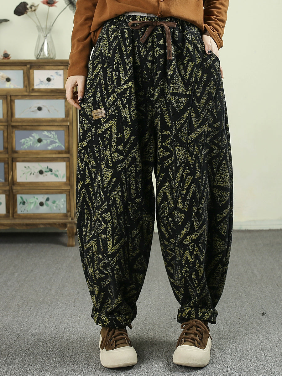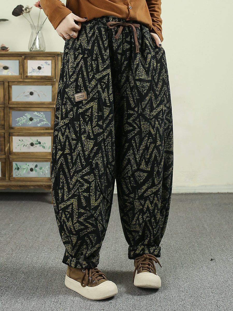 レディース 冬 レトロ 幾何学模様 フリース裏地 ハーレムパンツ