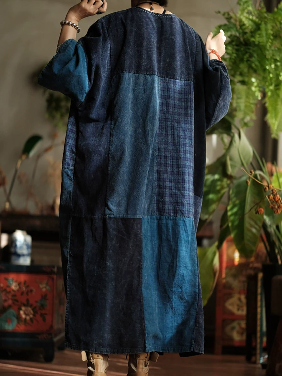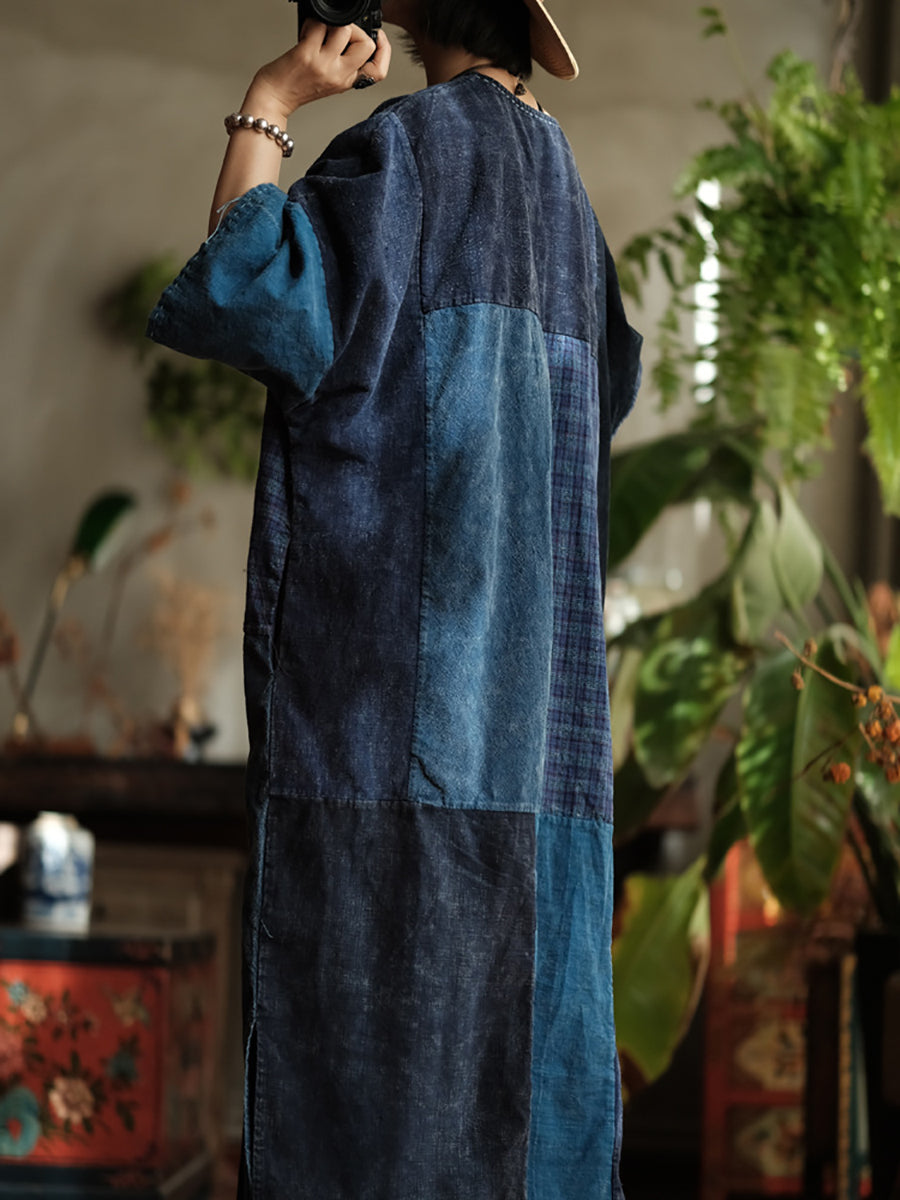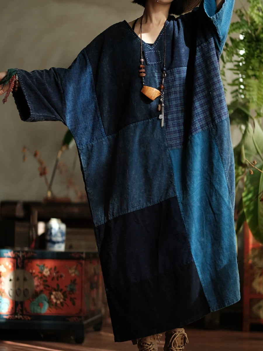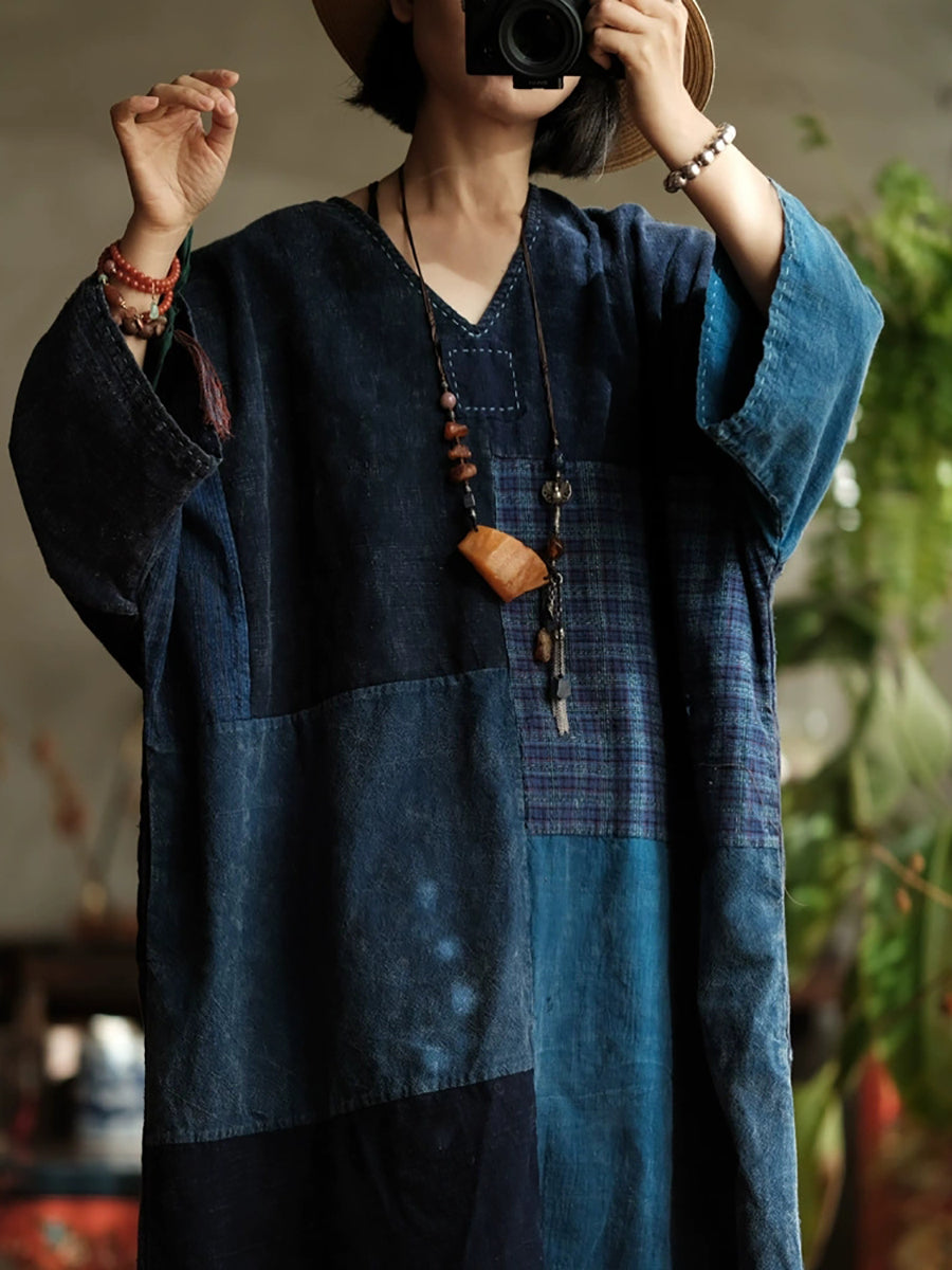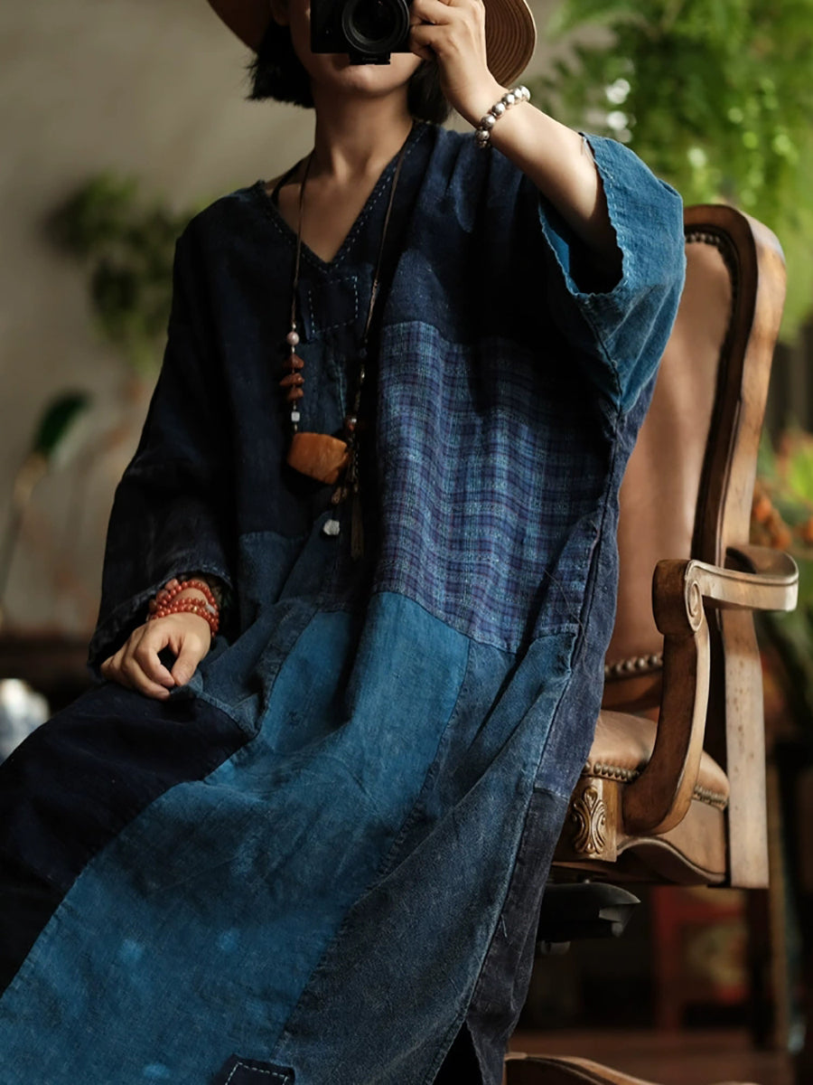 レディース 春 レトロ パッチワーク Vネック コットン ドレス
