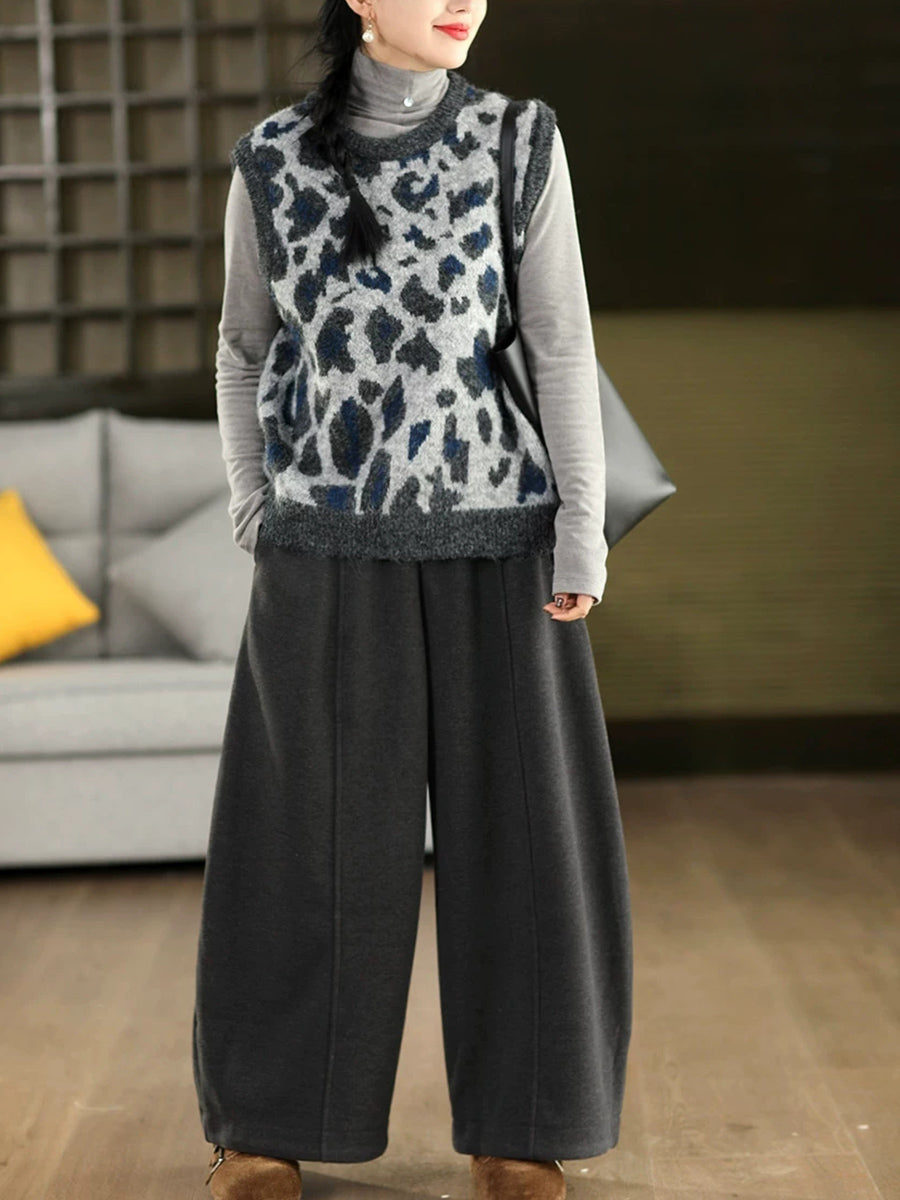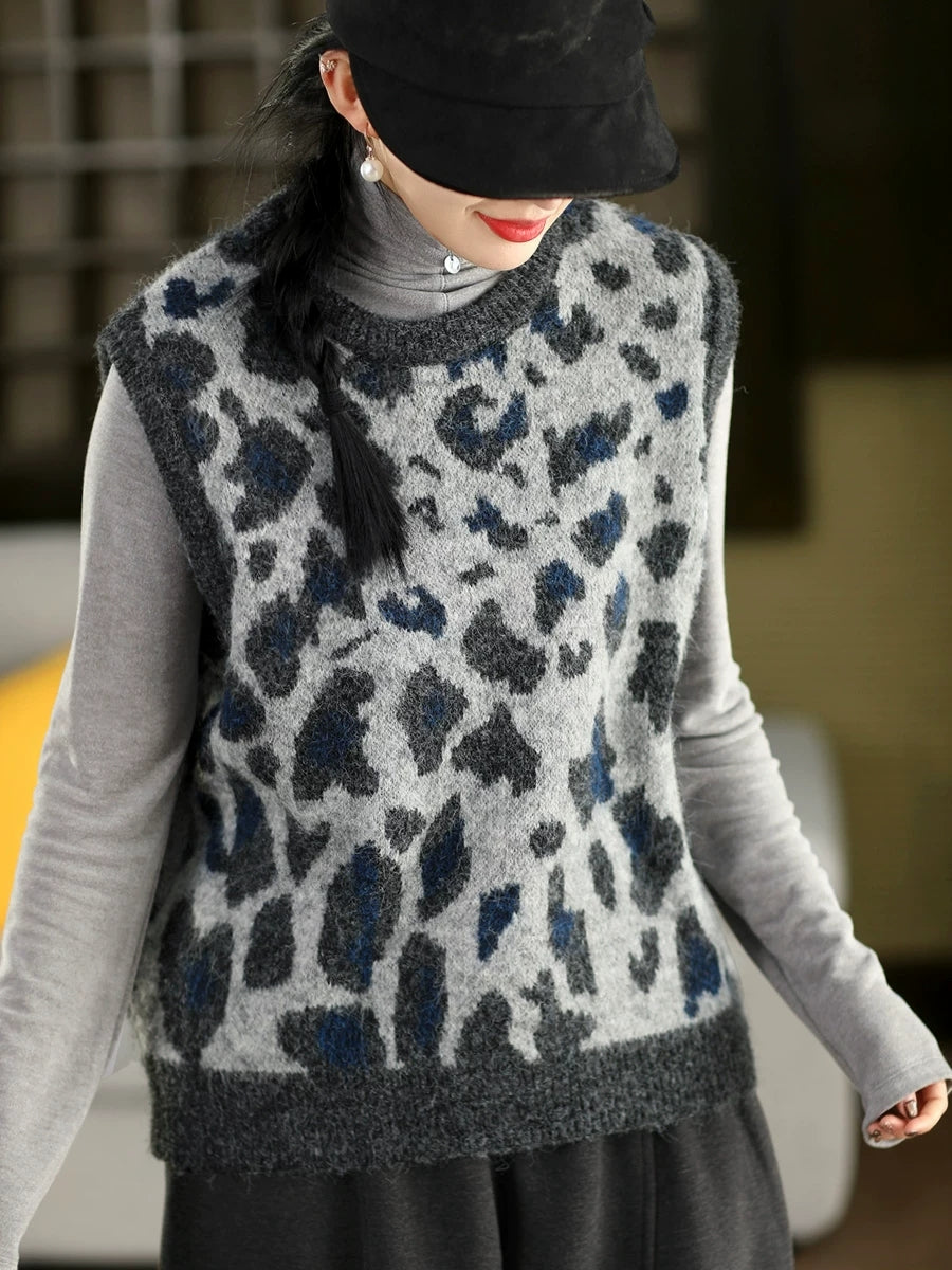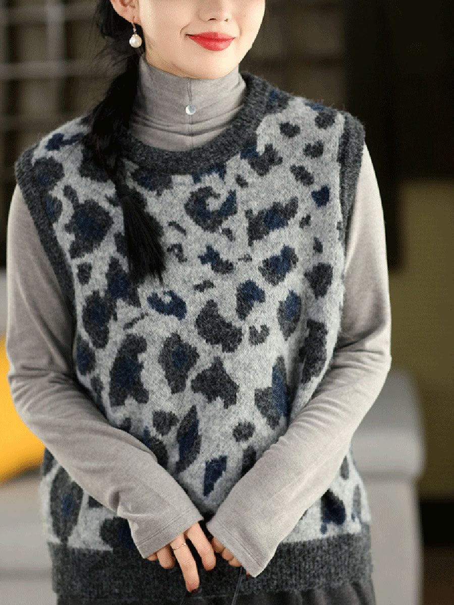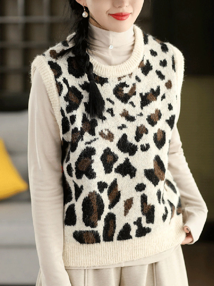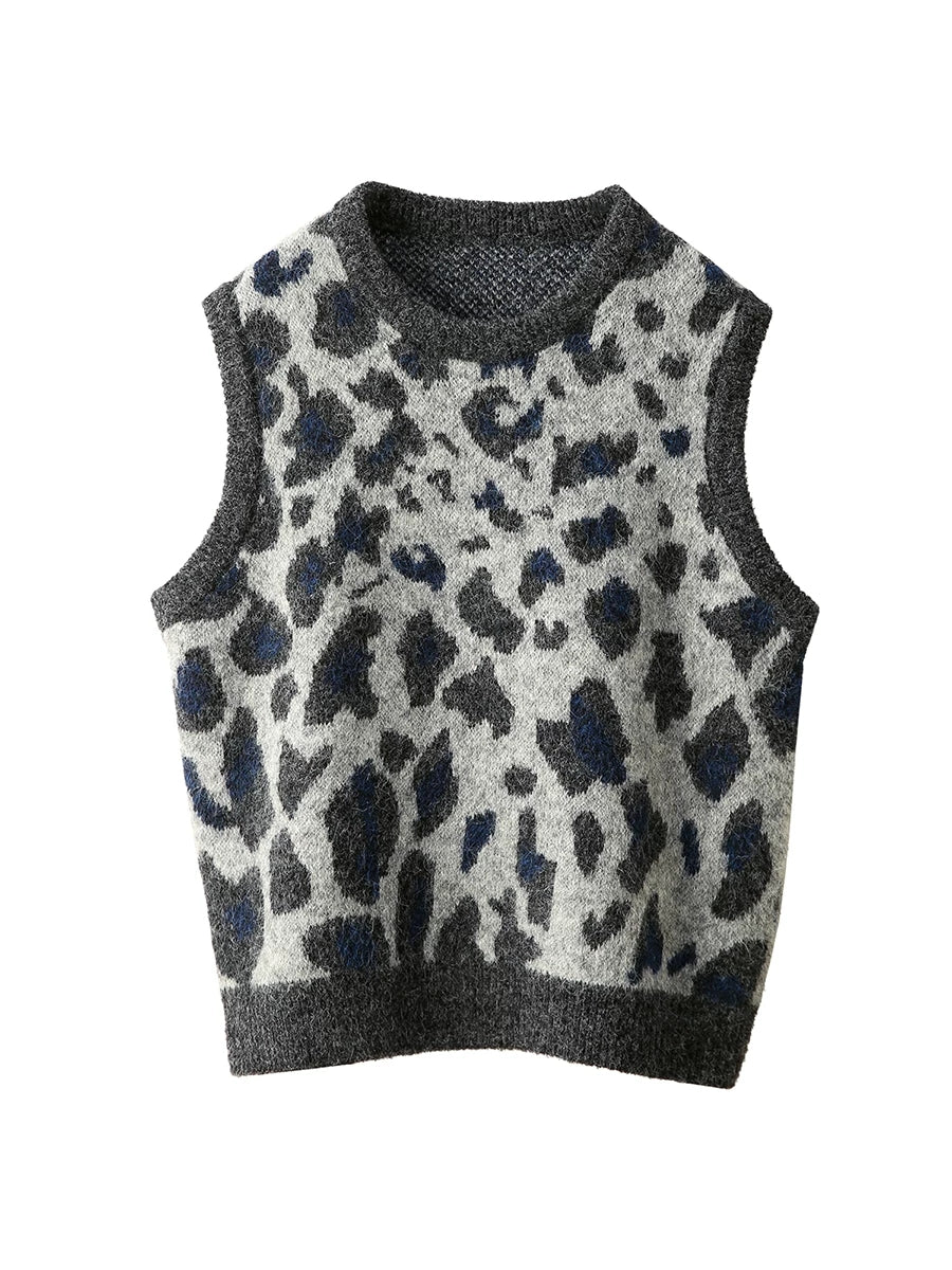 レディース春ファッション ヒョウ柄ジャカードOネックニットベスト