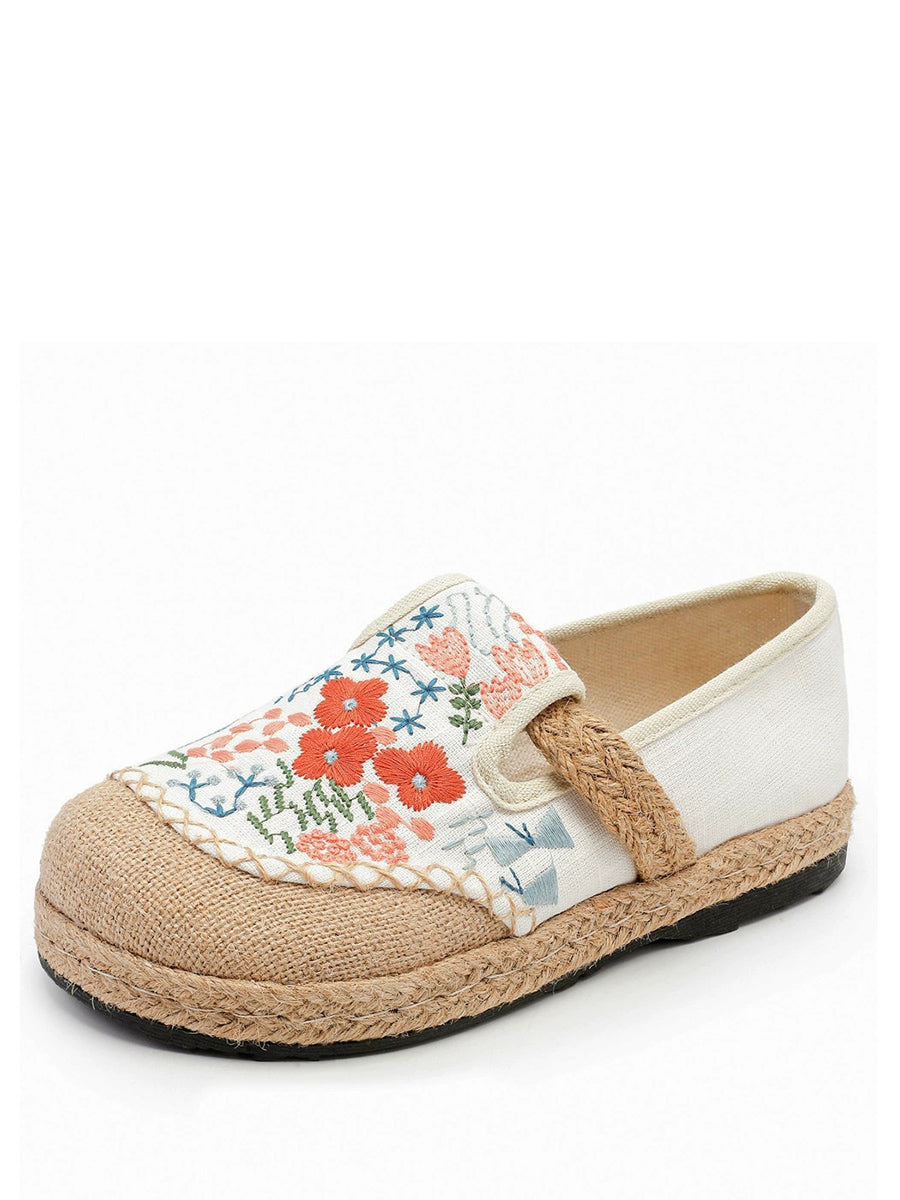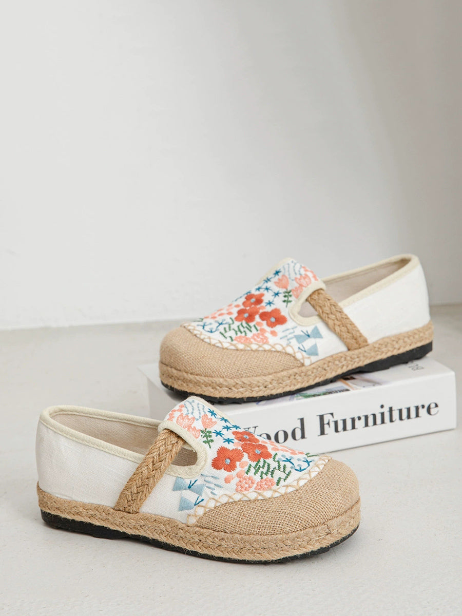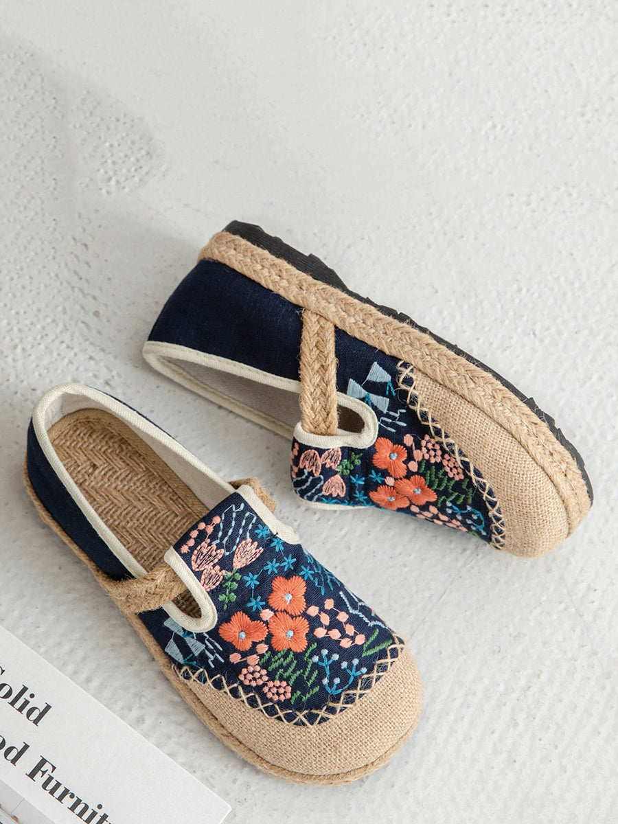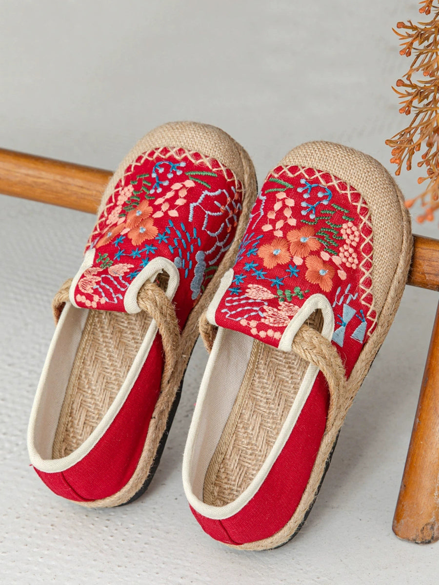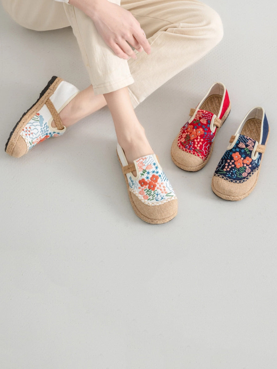 レディース 夏 エスニックフラワー刺繍 キャンバス リネン シューズ