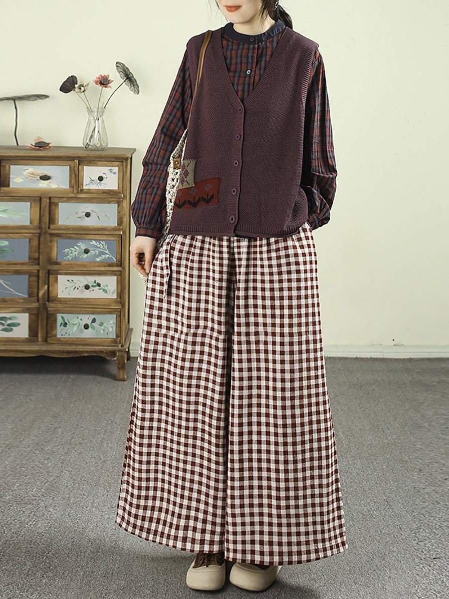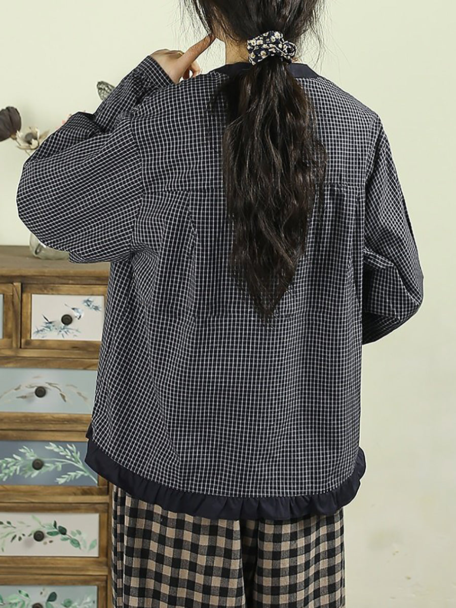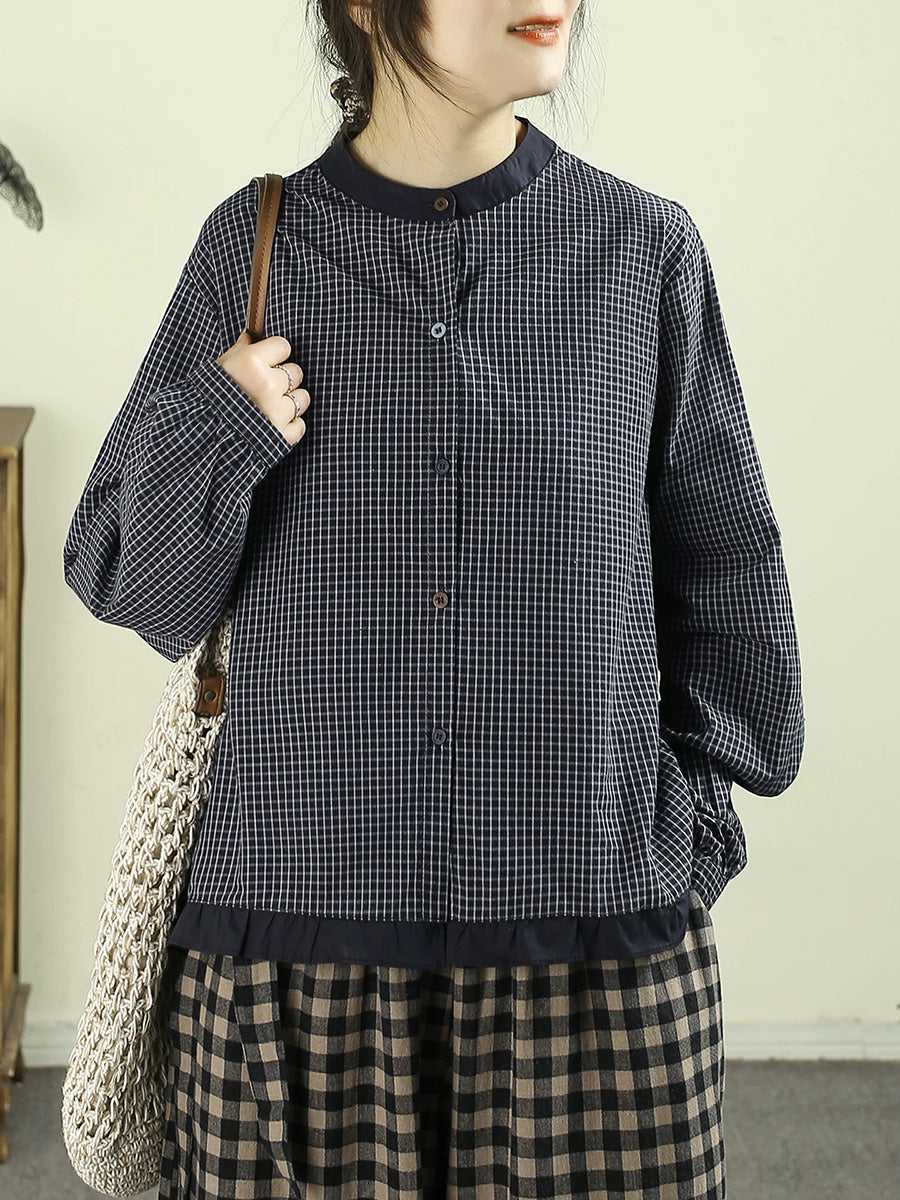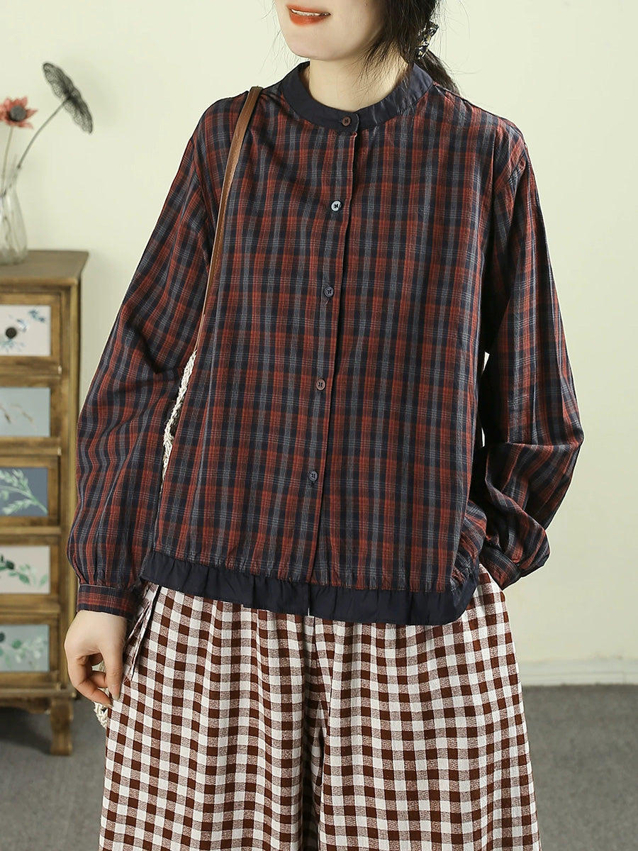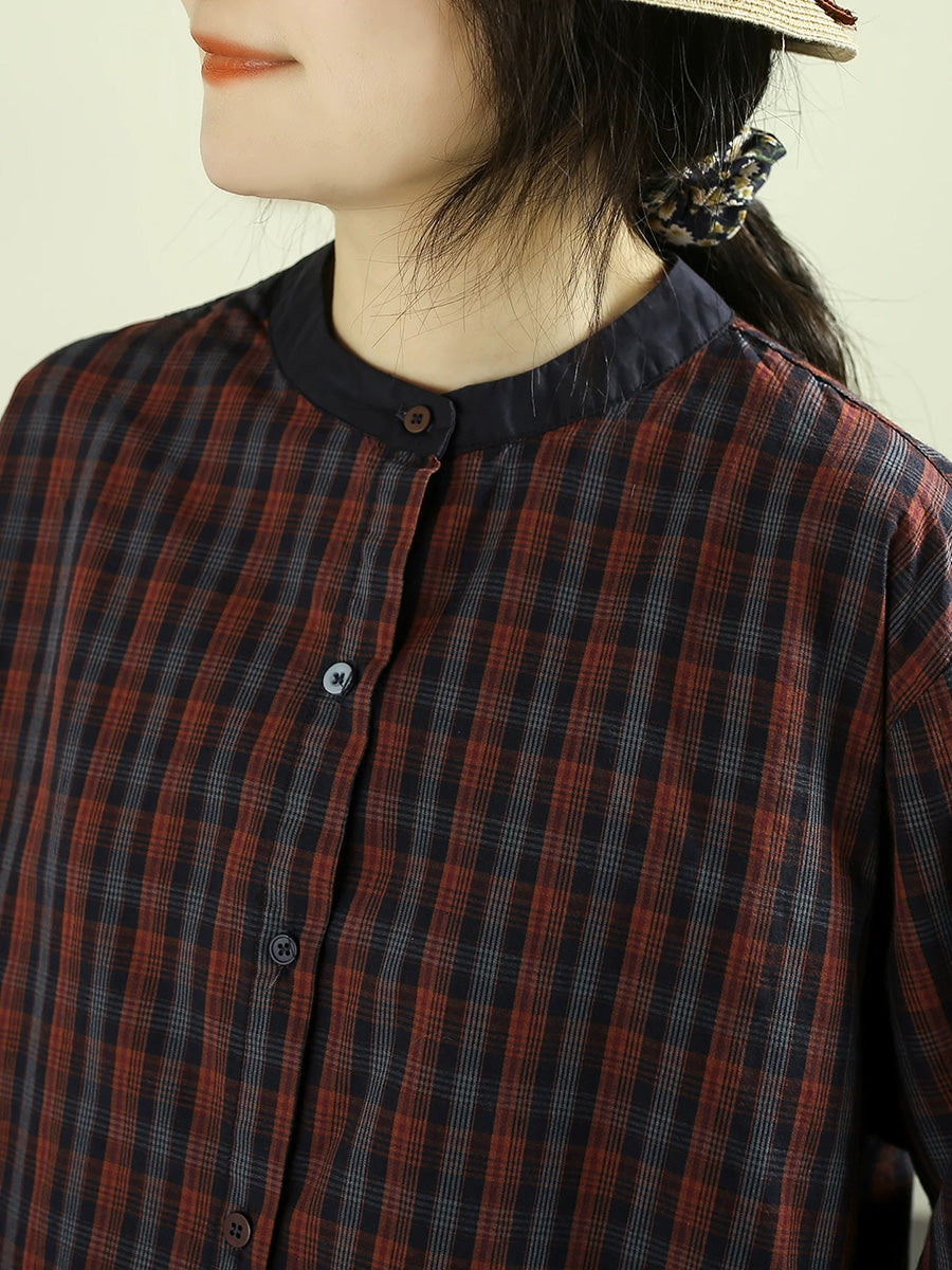 レディース 春 レトロ チェック柄 100%コットン スタンドカラーシャツ