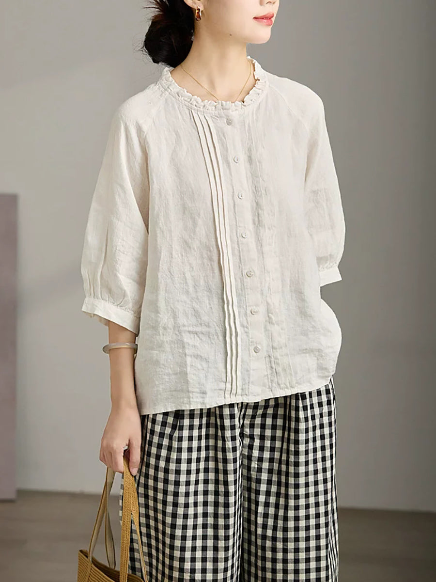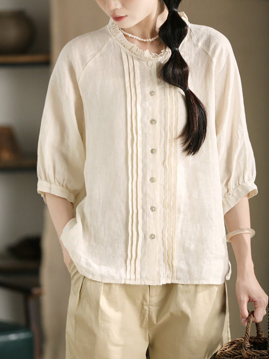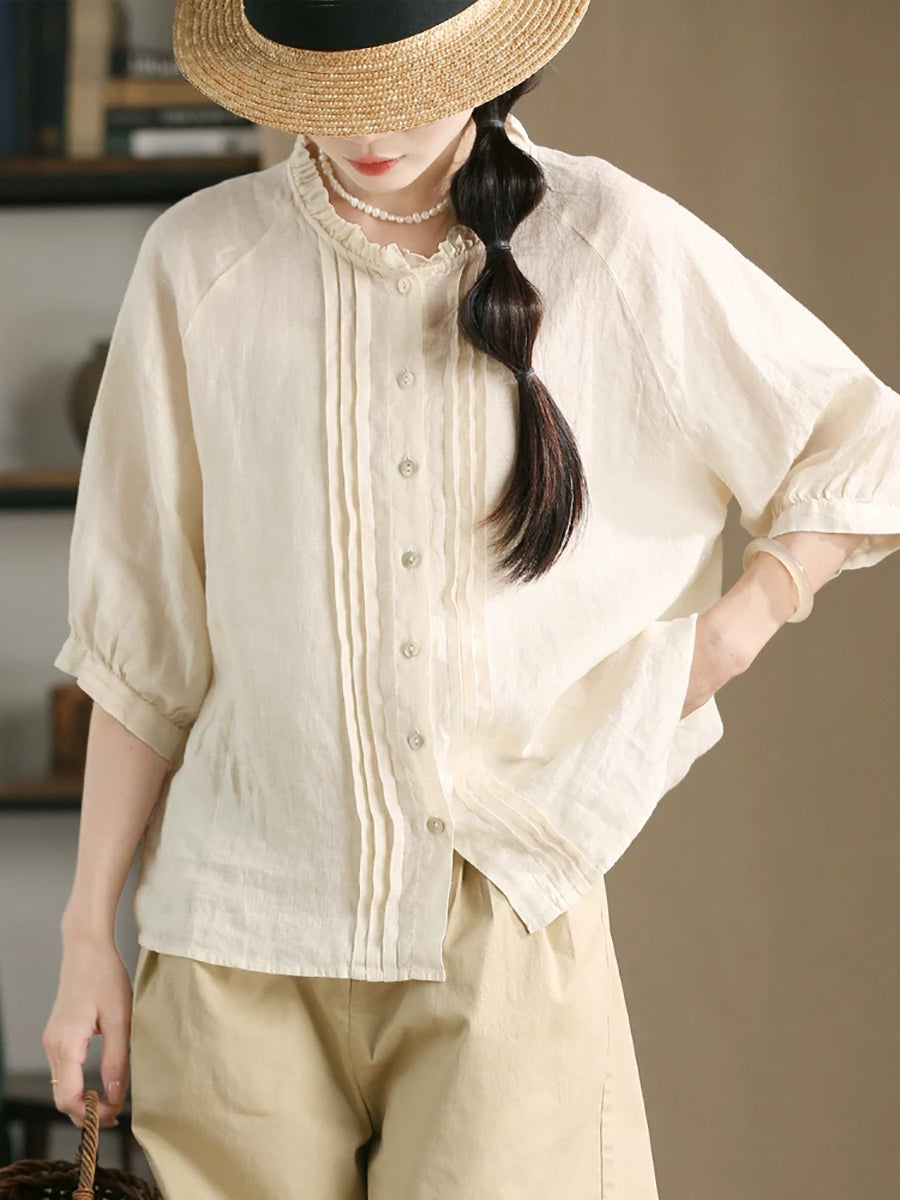 レディース サマー シャーリング スタンドカラー 100%リネン ブラウス