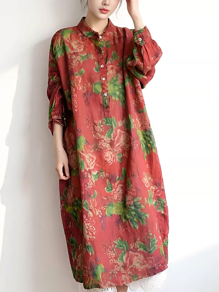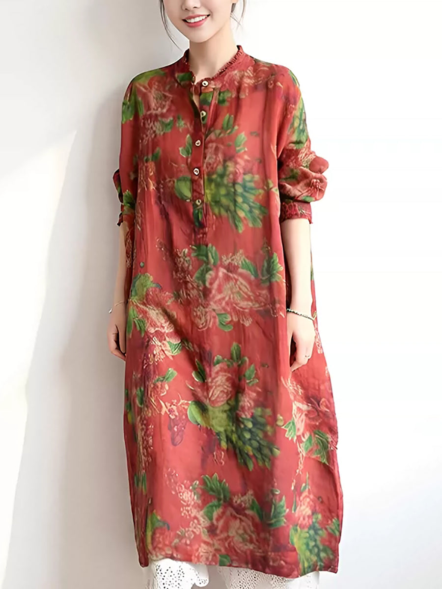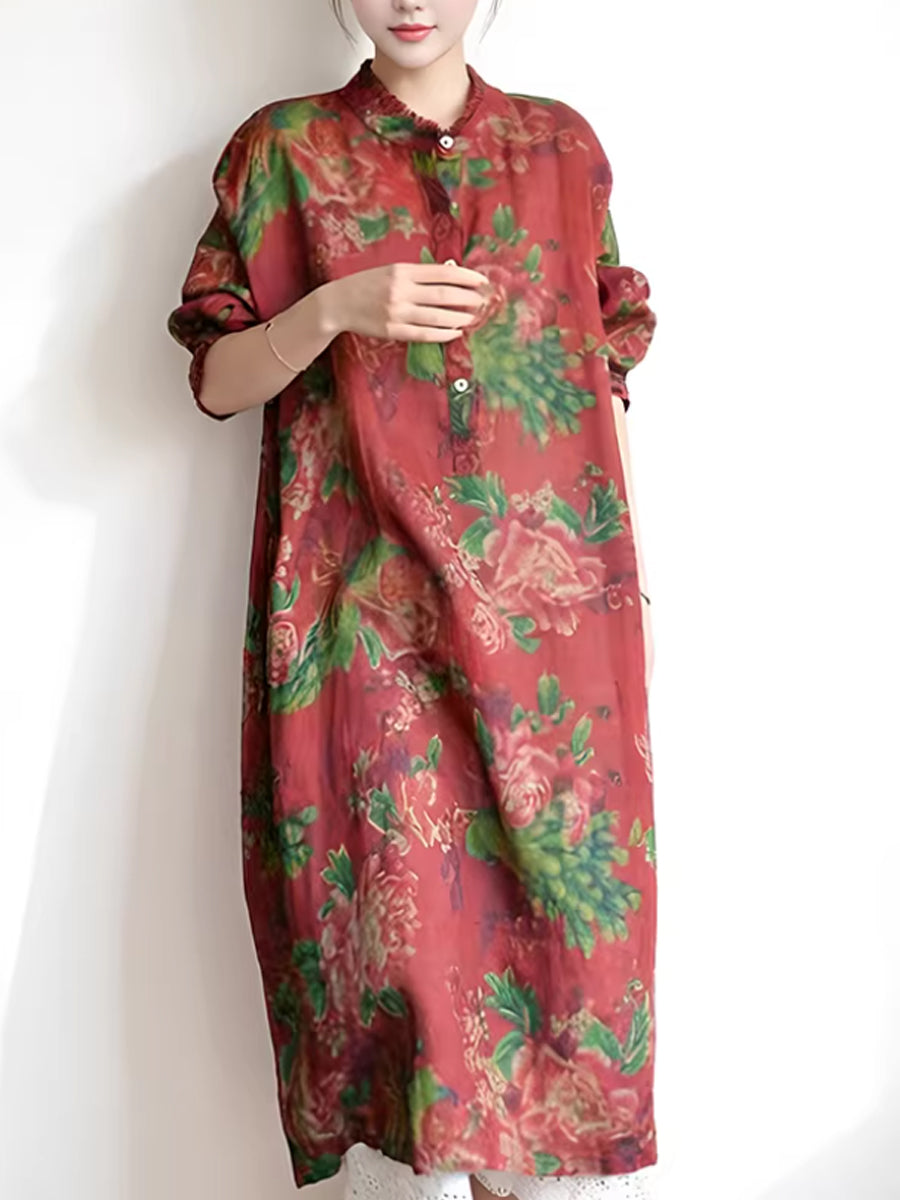 ラミー100%で仕立てたこのドレスは、スタンドカラーと花柄が特徴です。袖丈はレギュラー丈で、足首まで届くので、秋にも春にもぴったりです。