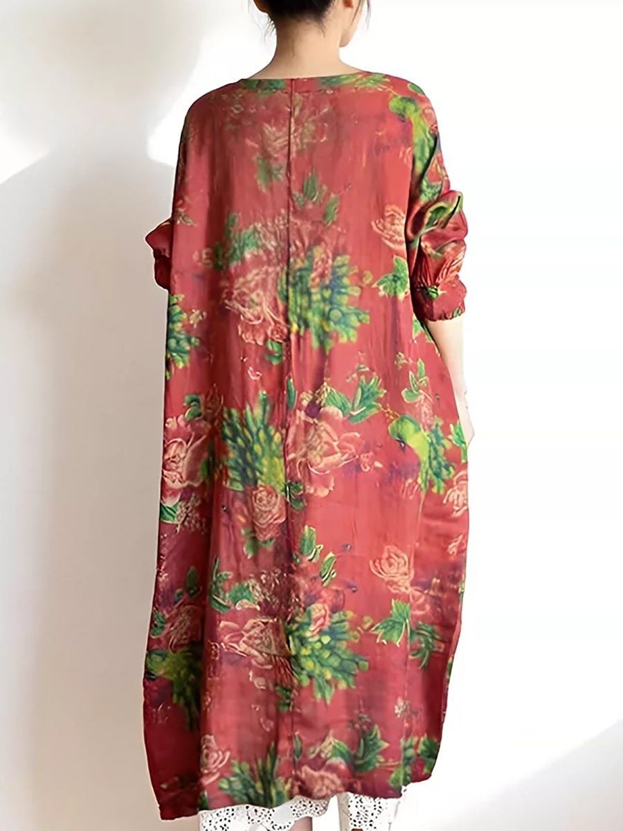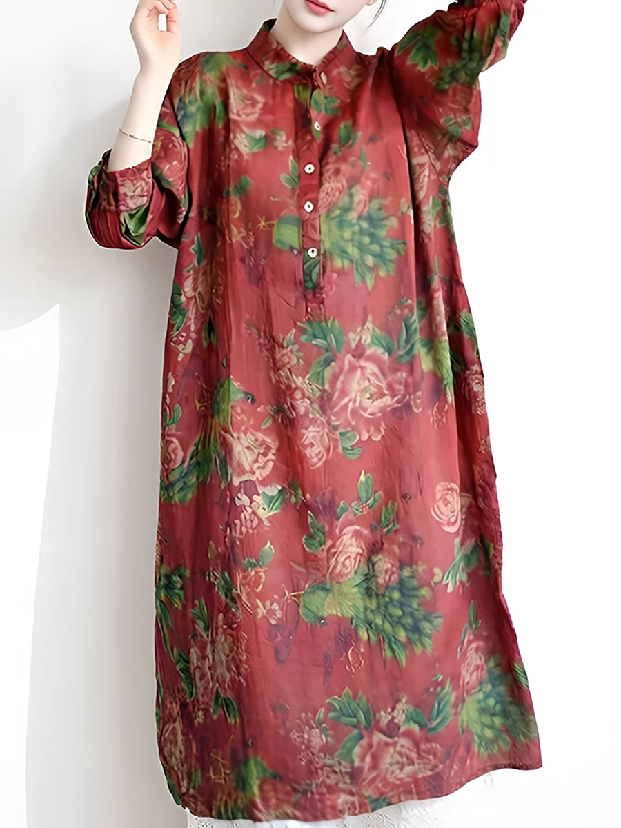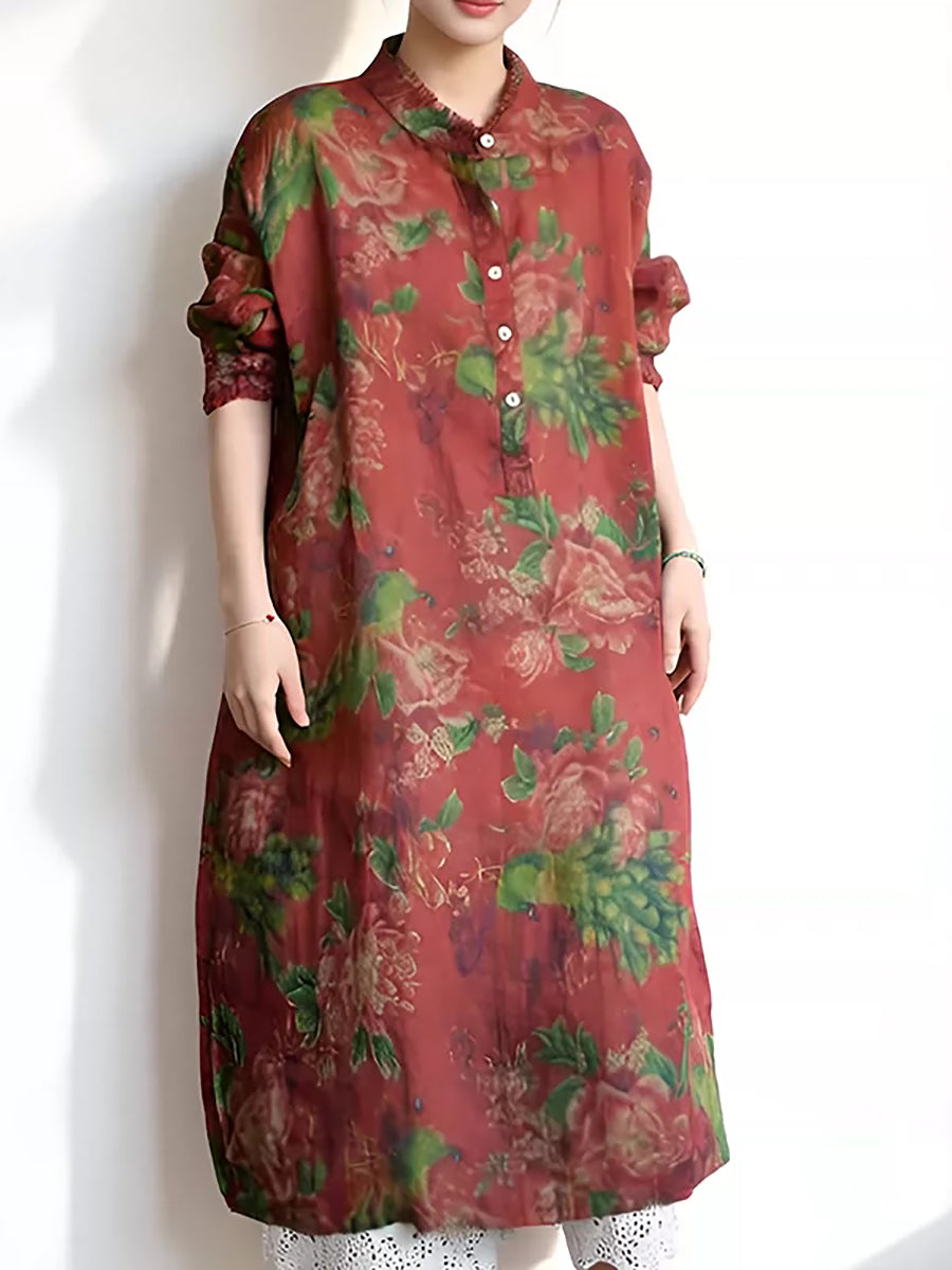 ラミー100%で仕立てたこのドレスは、スタンドカラーと花柄が特徴です。袖丈はレギュラー丈で、足首まで届くので、秋にも春にもぴったりです。