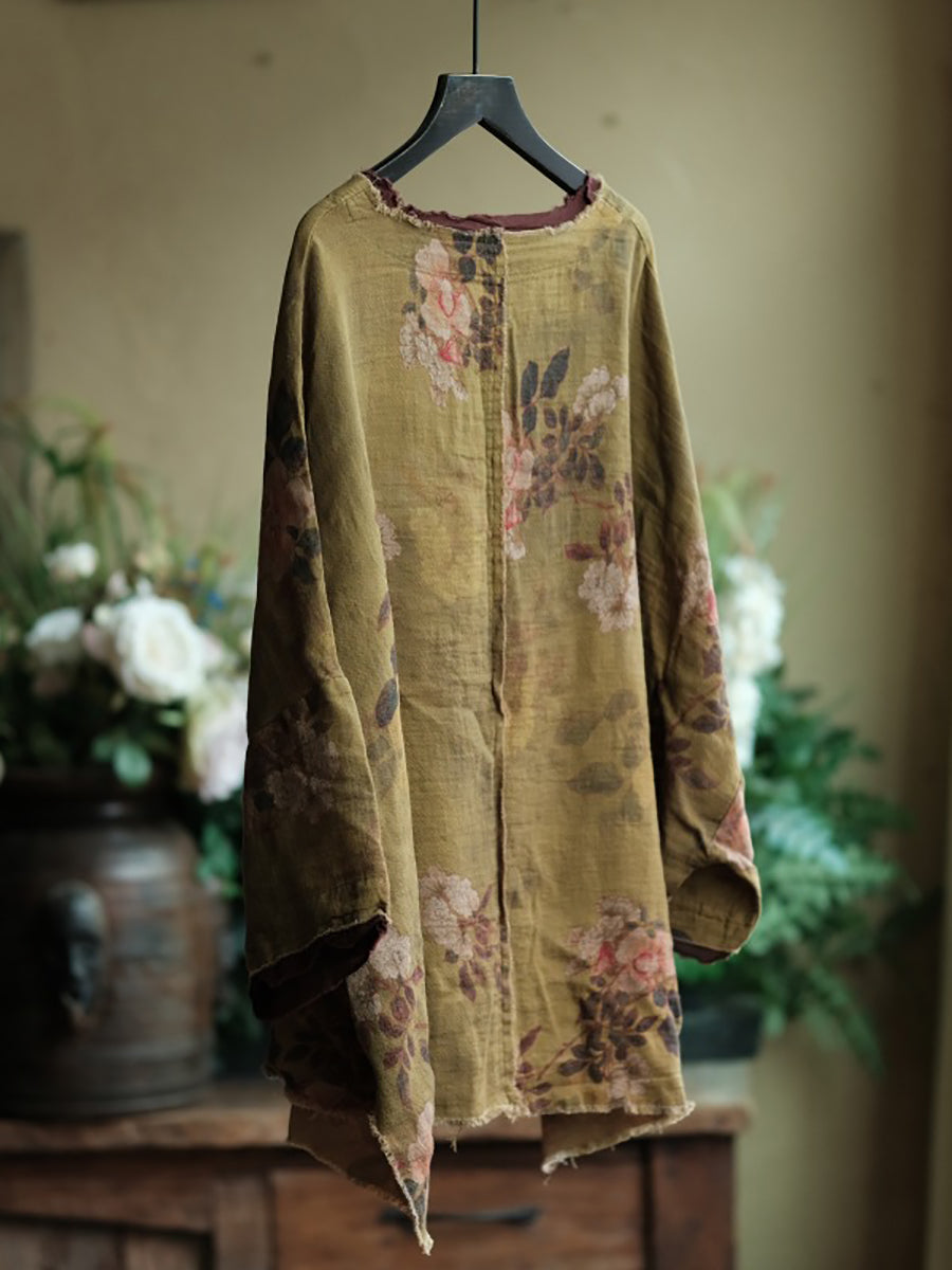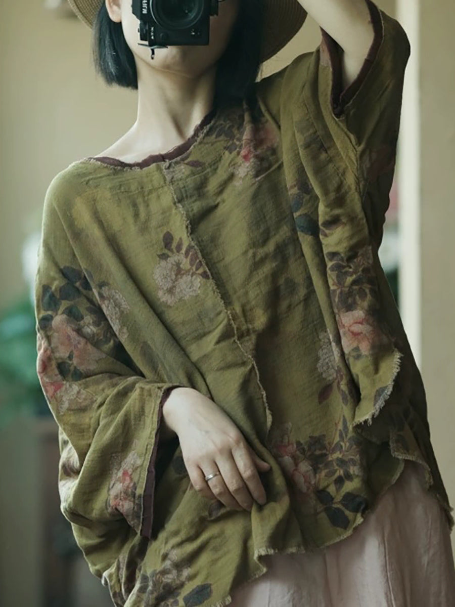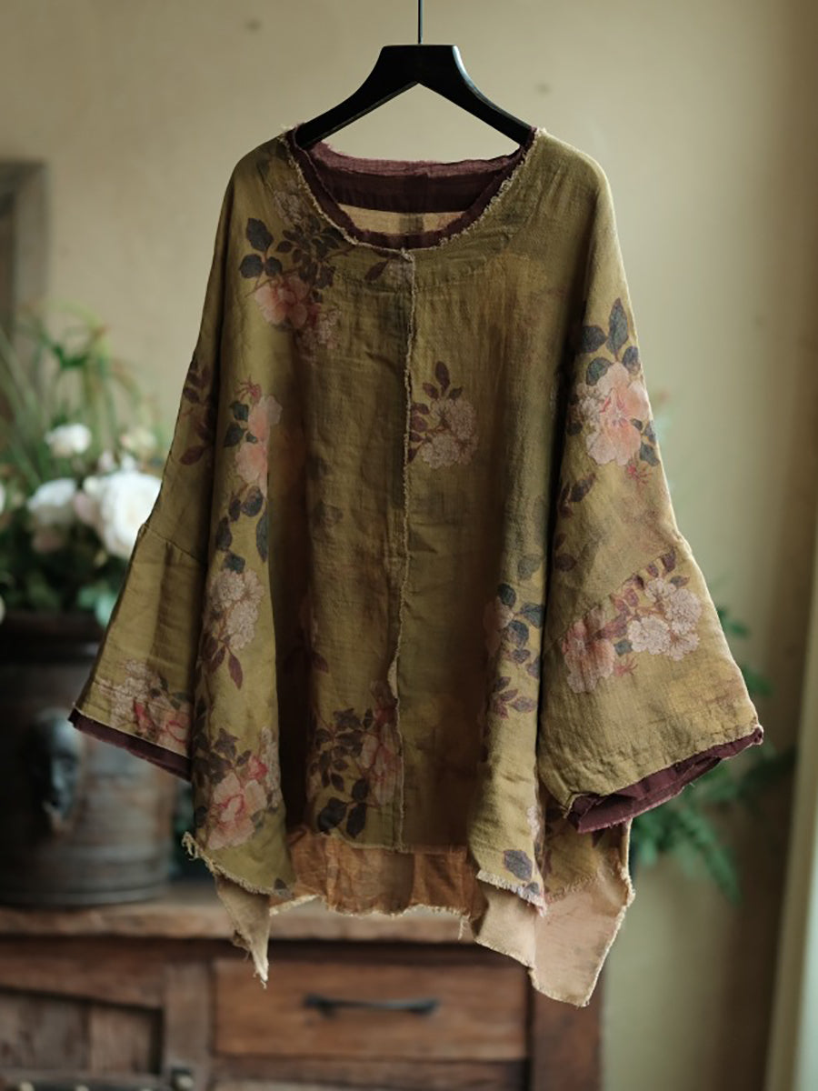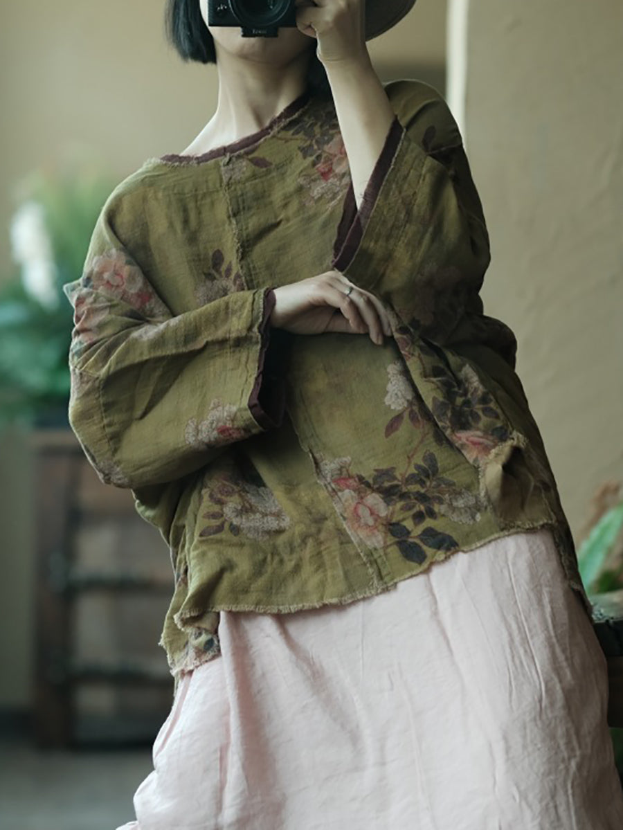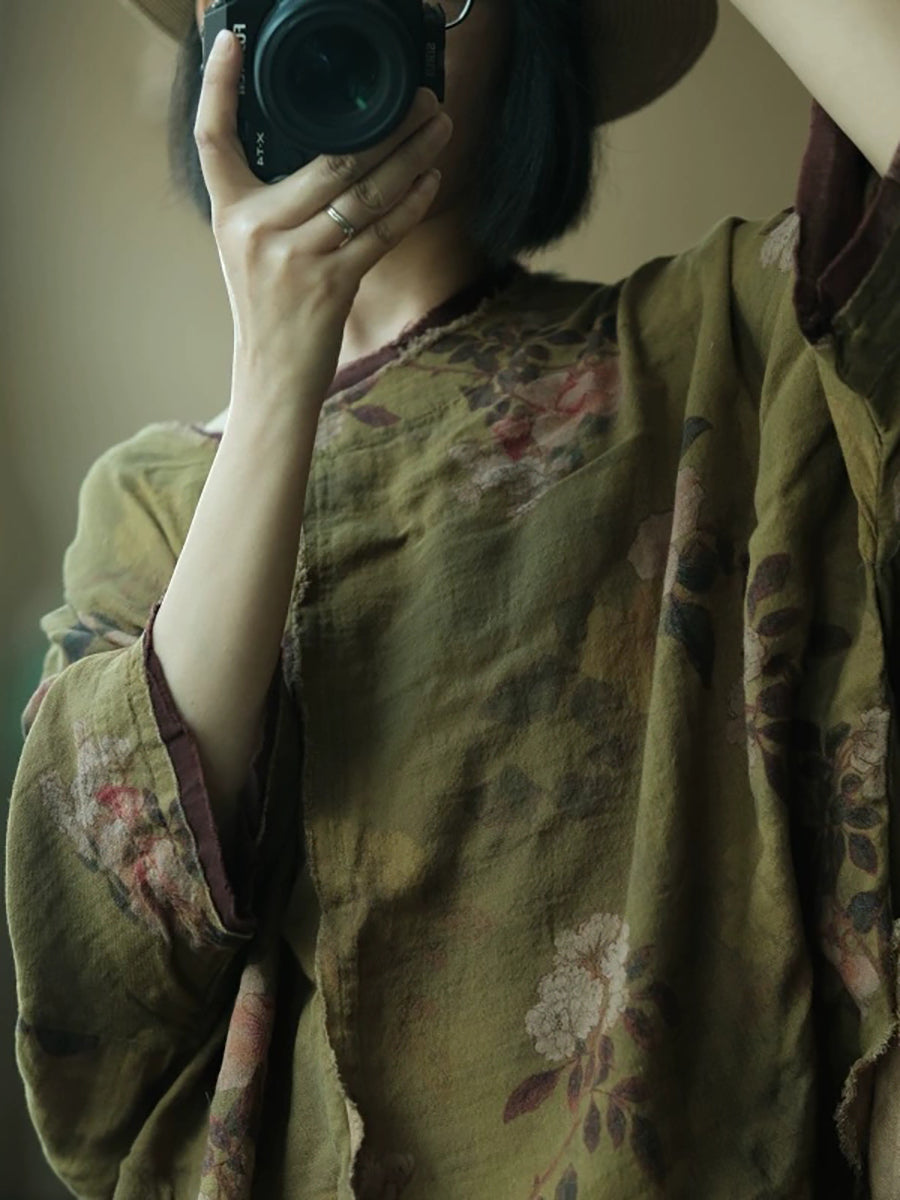レディース 夏用 花柄 コットン Oネックシャツ