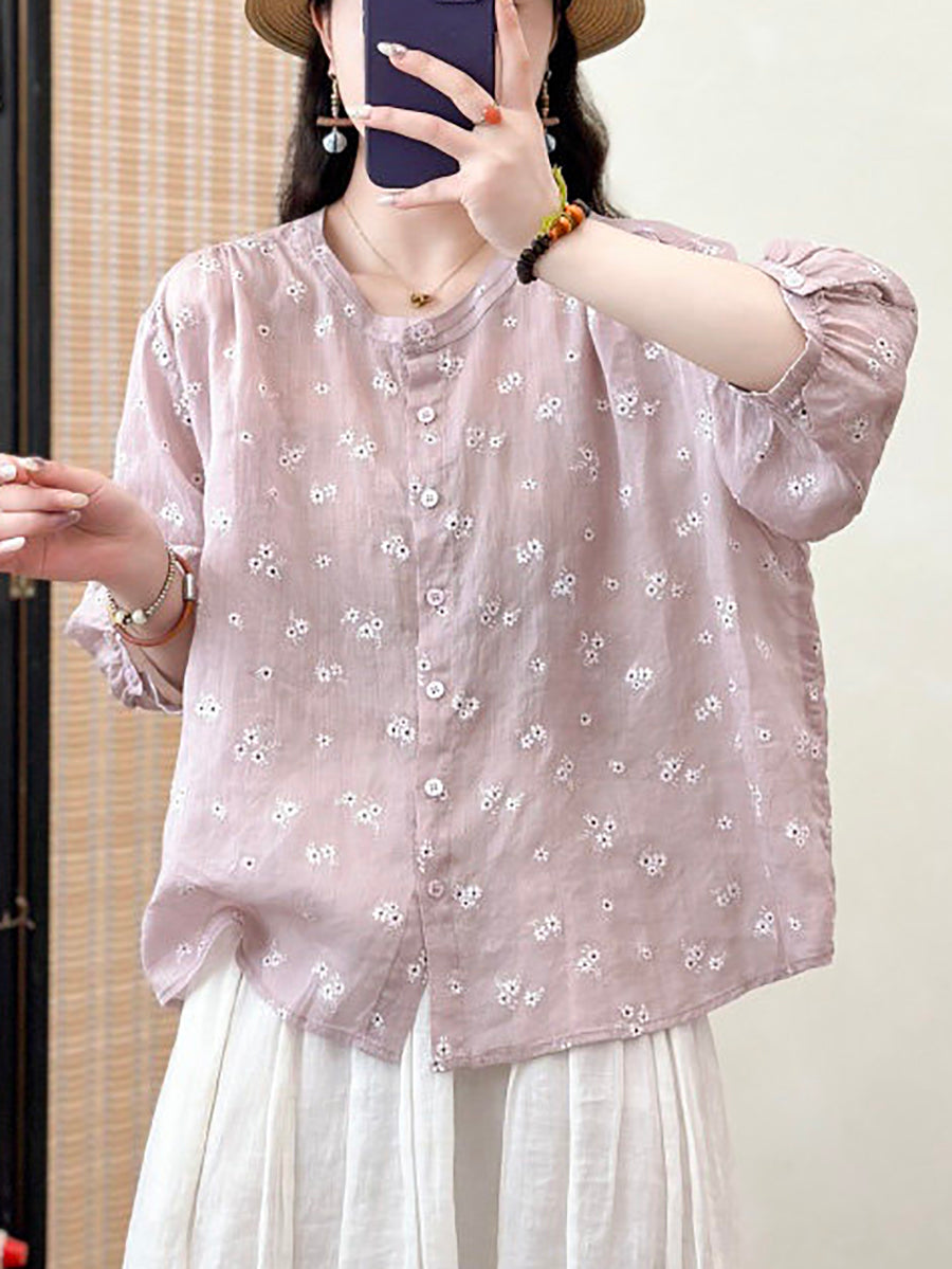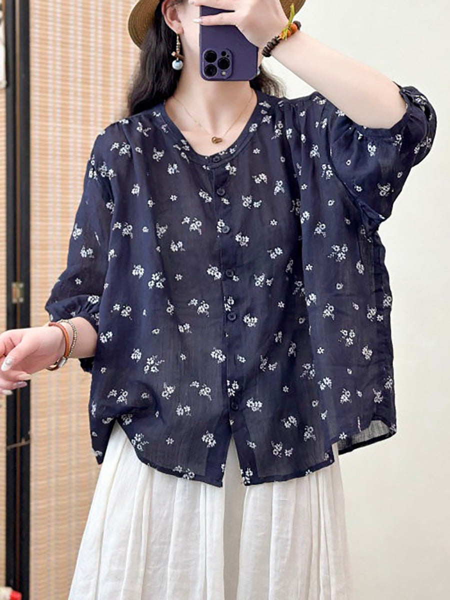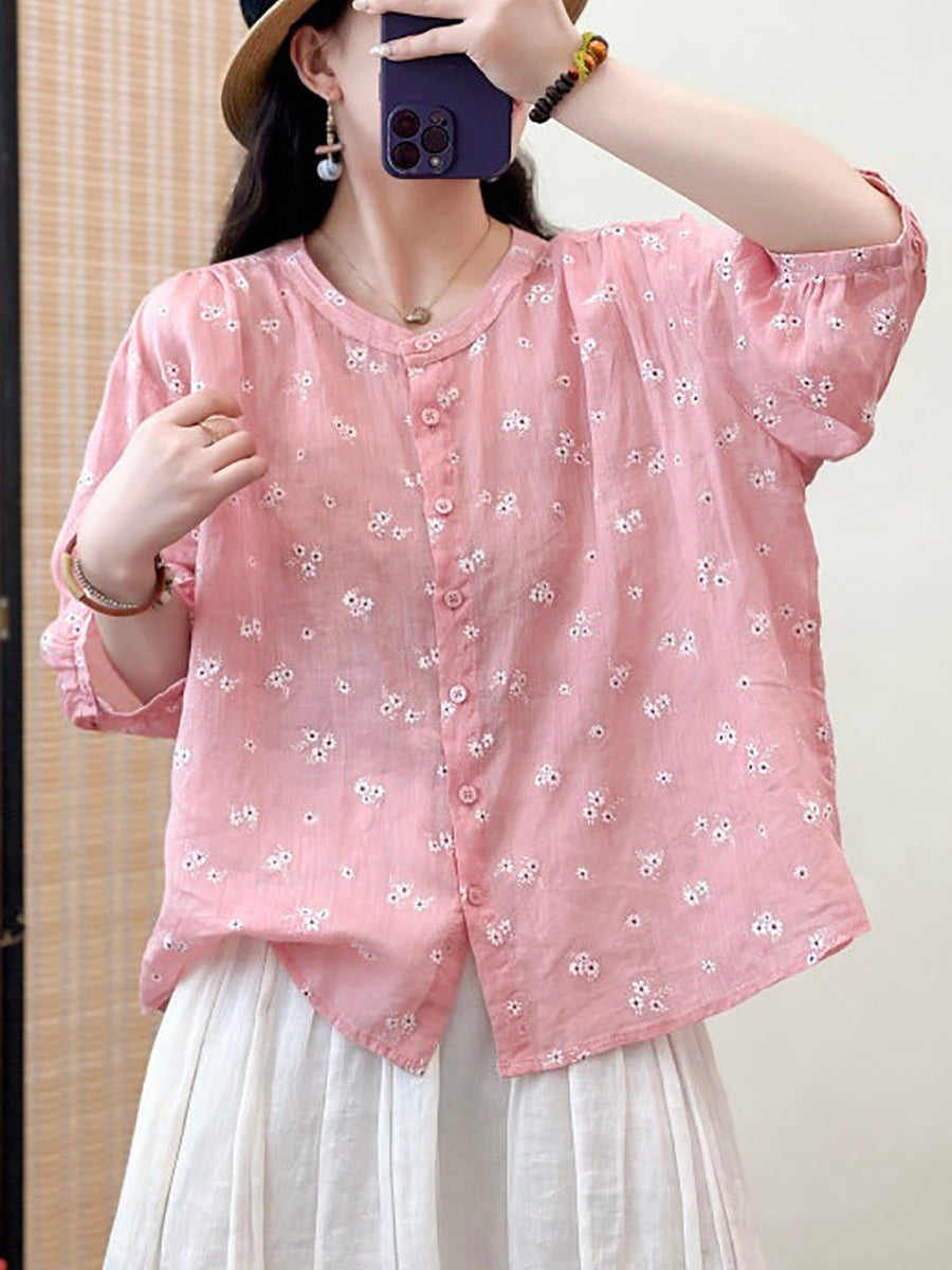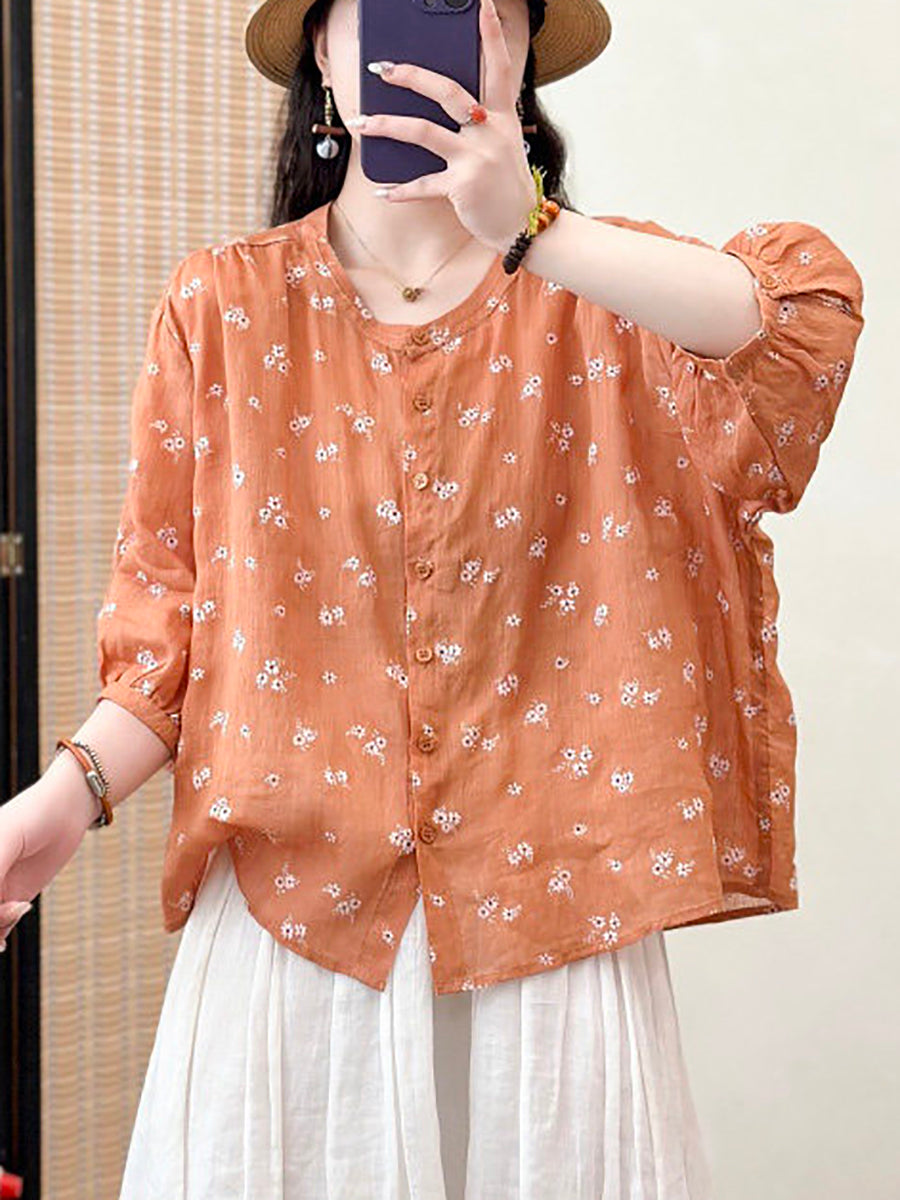レディース 夏用 カジュアル 花柄 100%ラミーシャツ