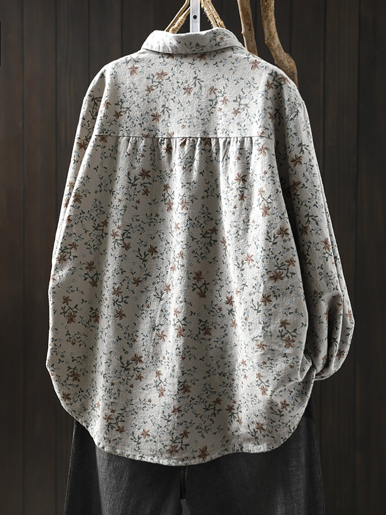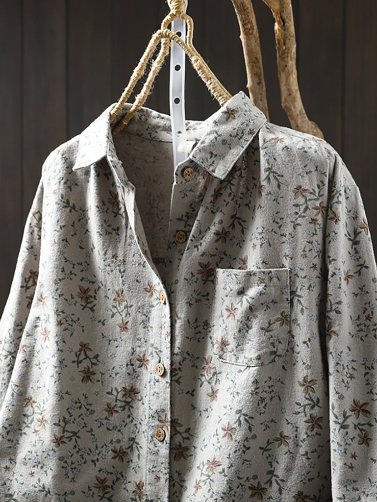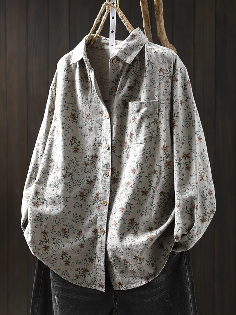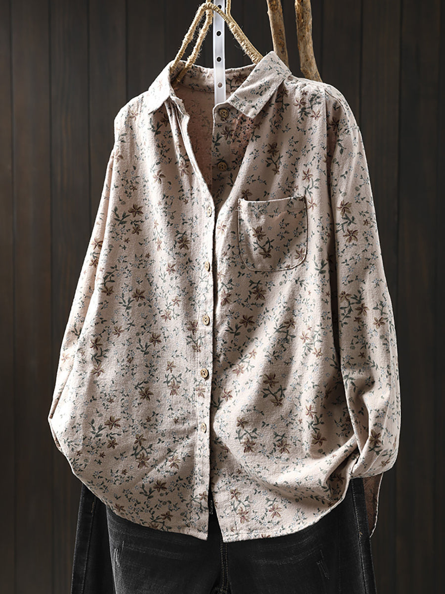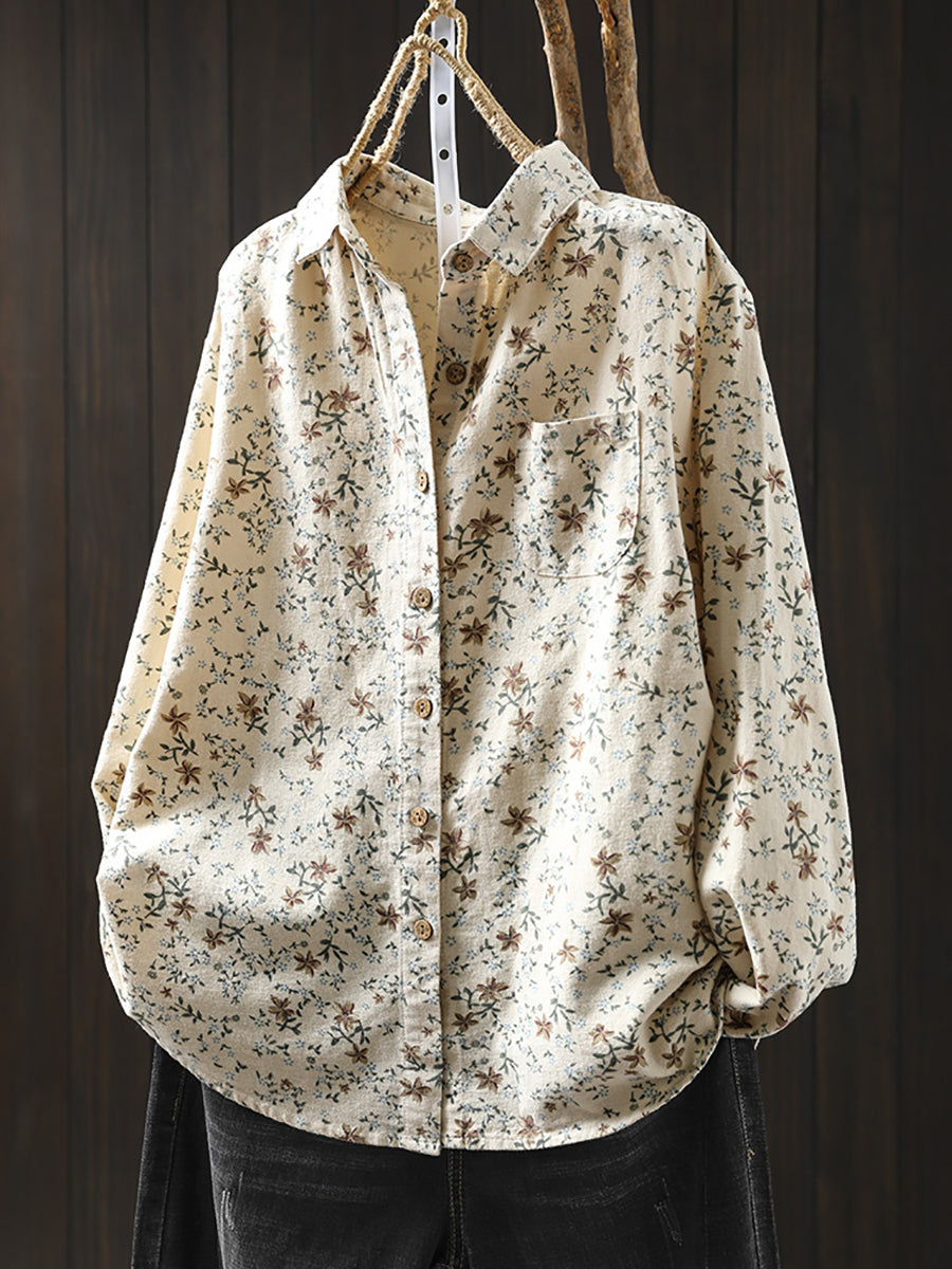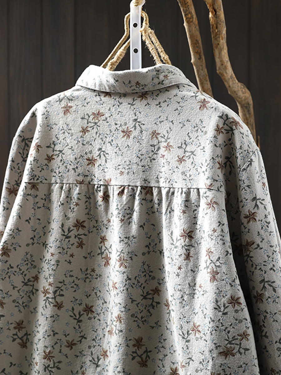 レディース 冬 アーティスティック ターンダウンカラー 花柄 100%コットンシャツ