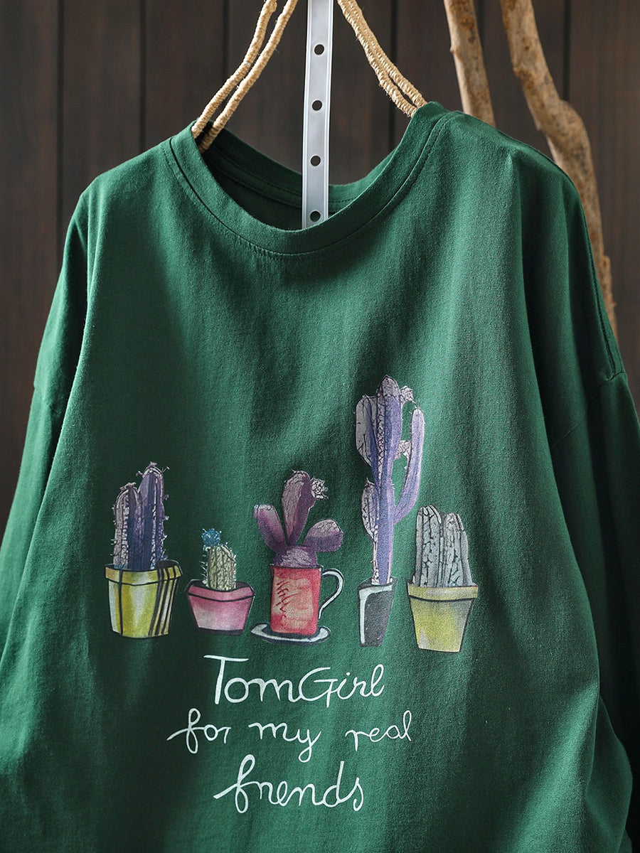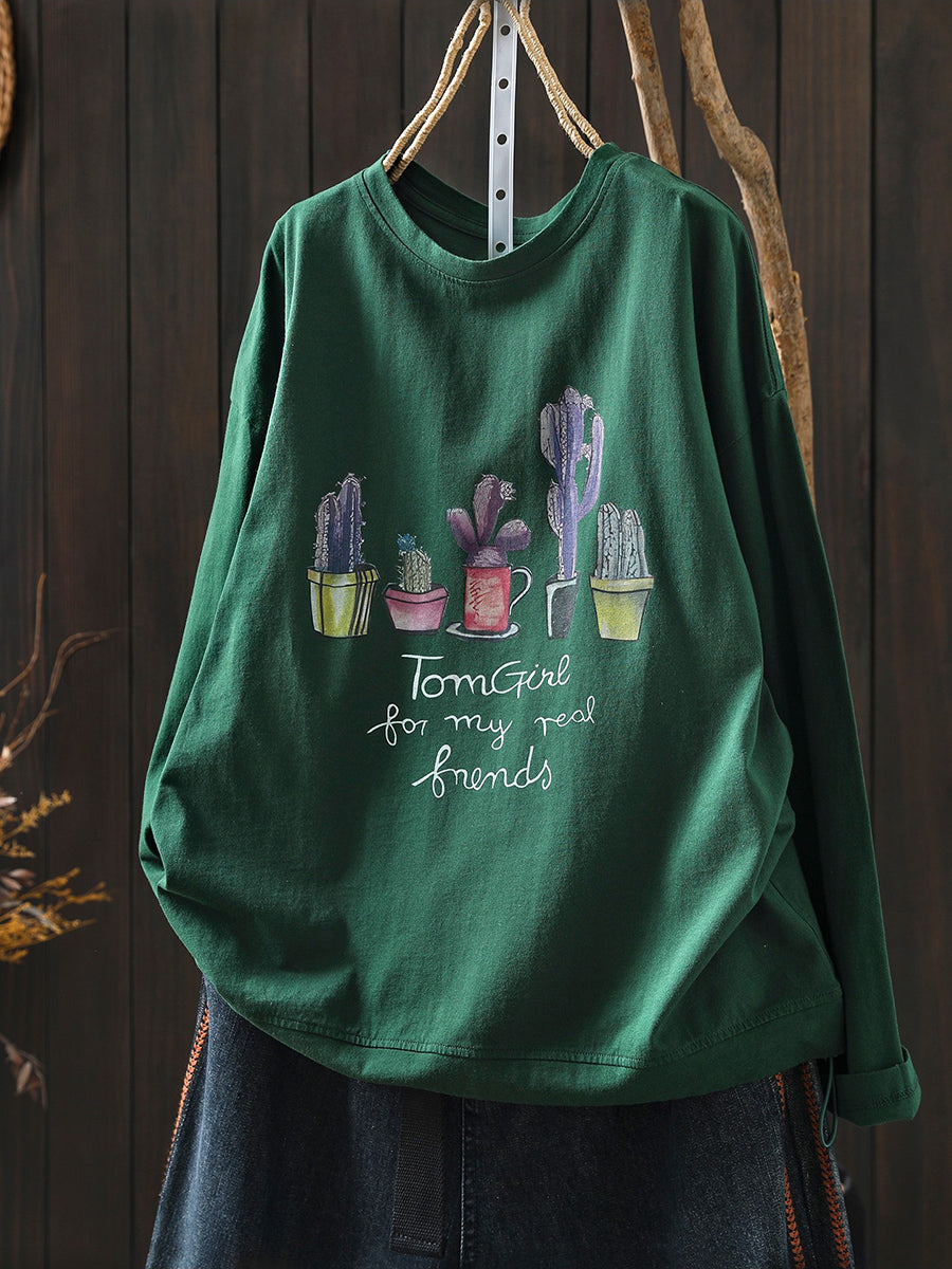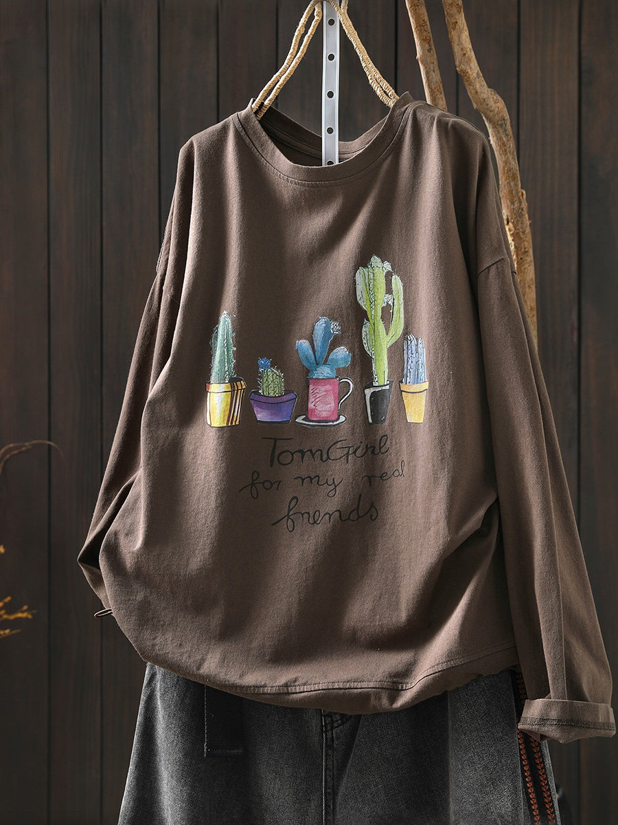 レディース アーティスティック スプリング 鉢植え コットン Oネック ブラウス