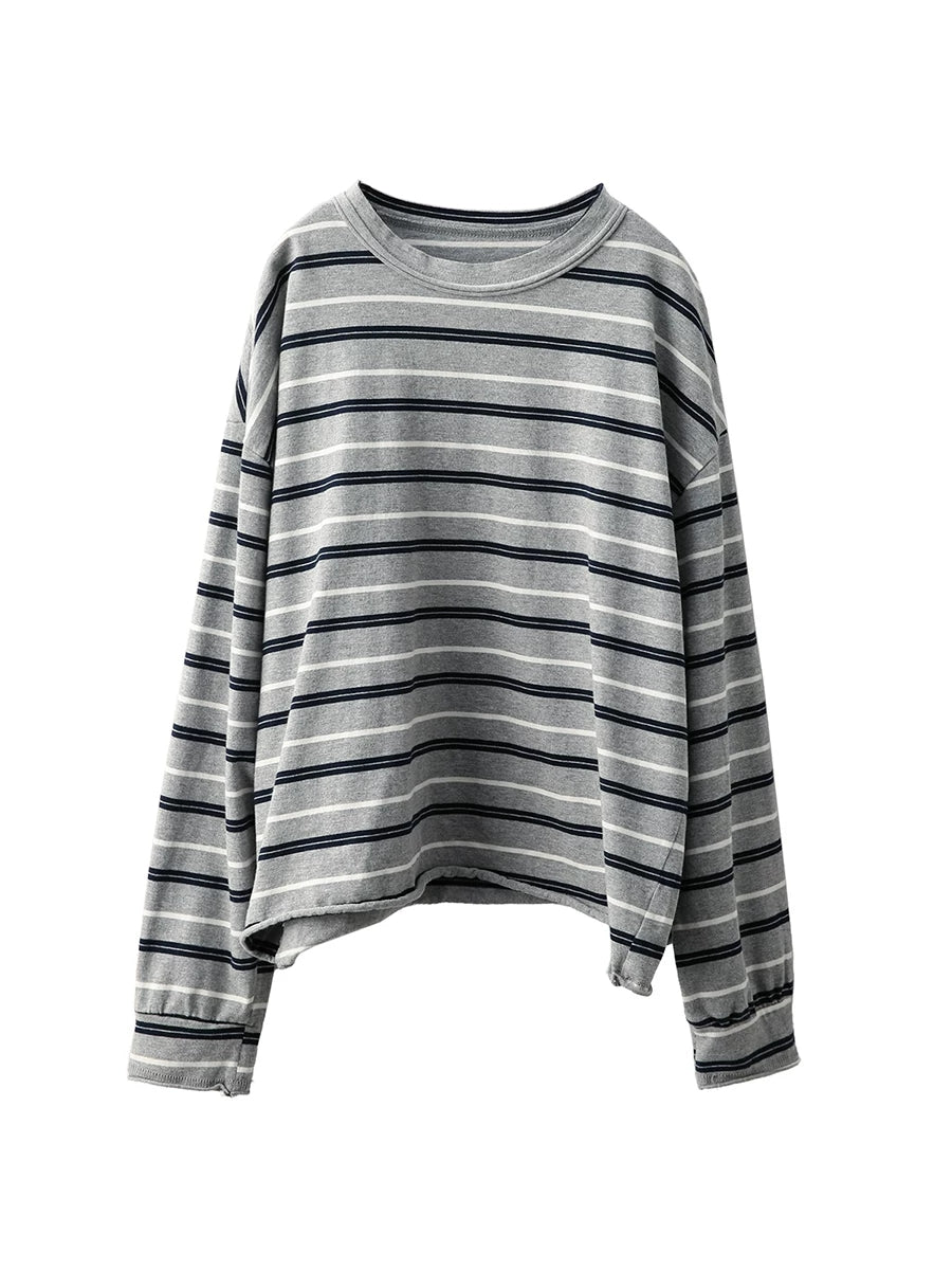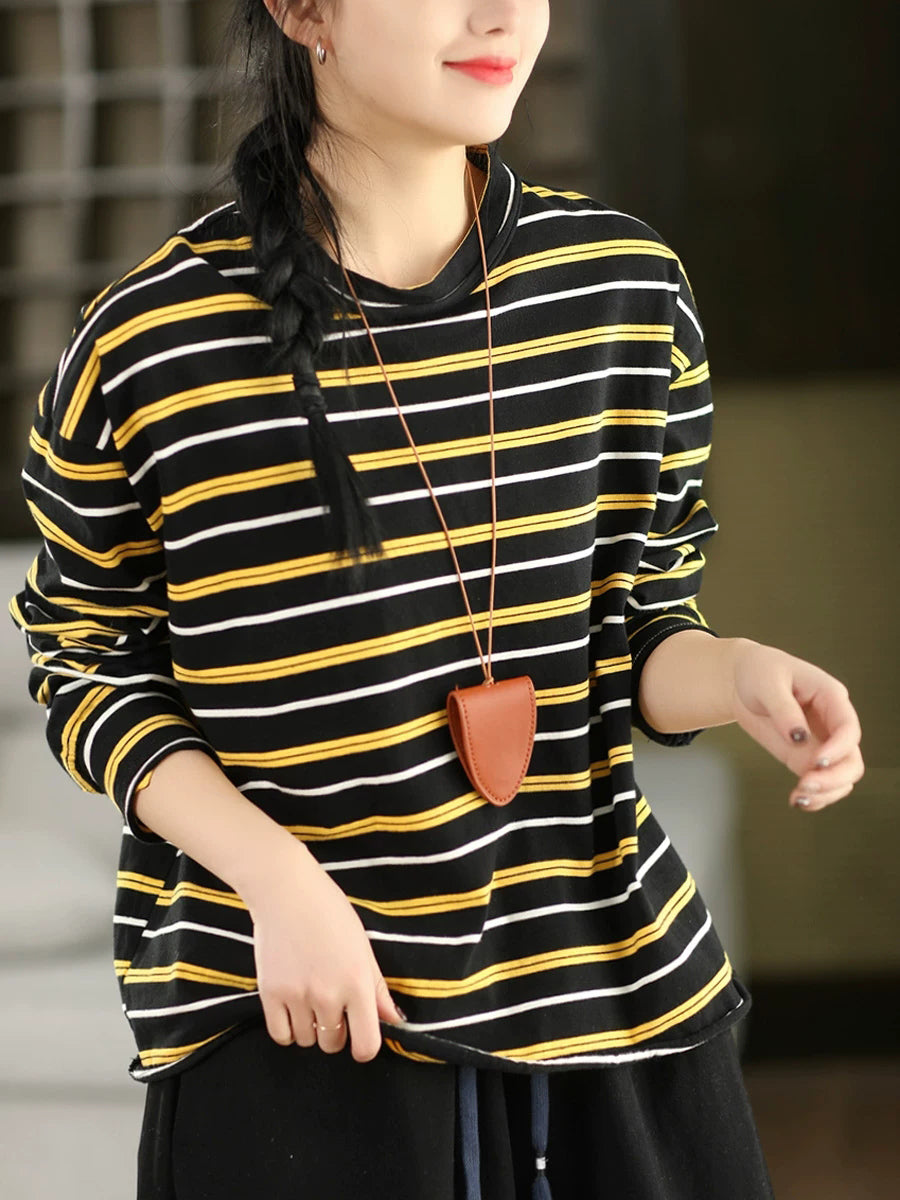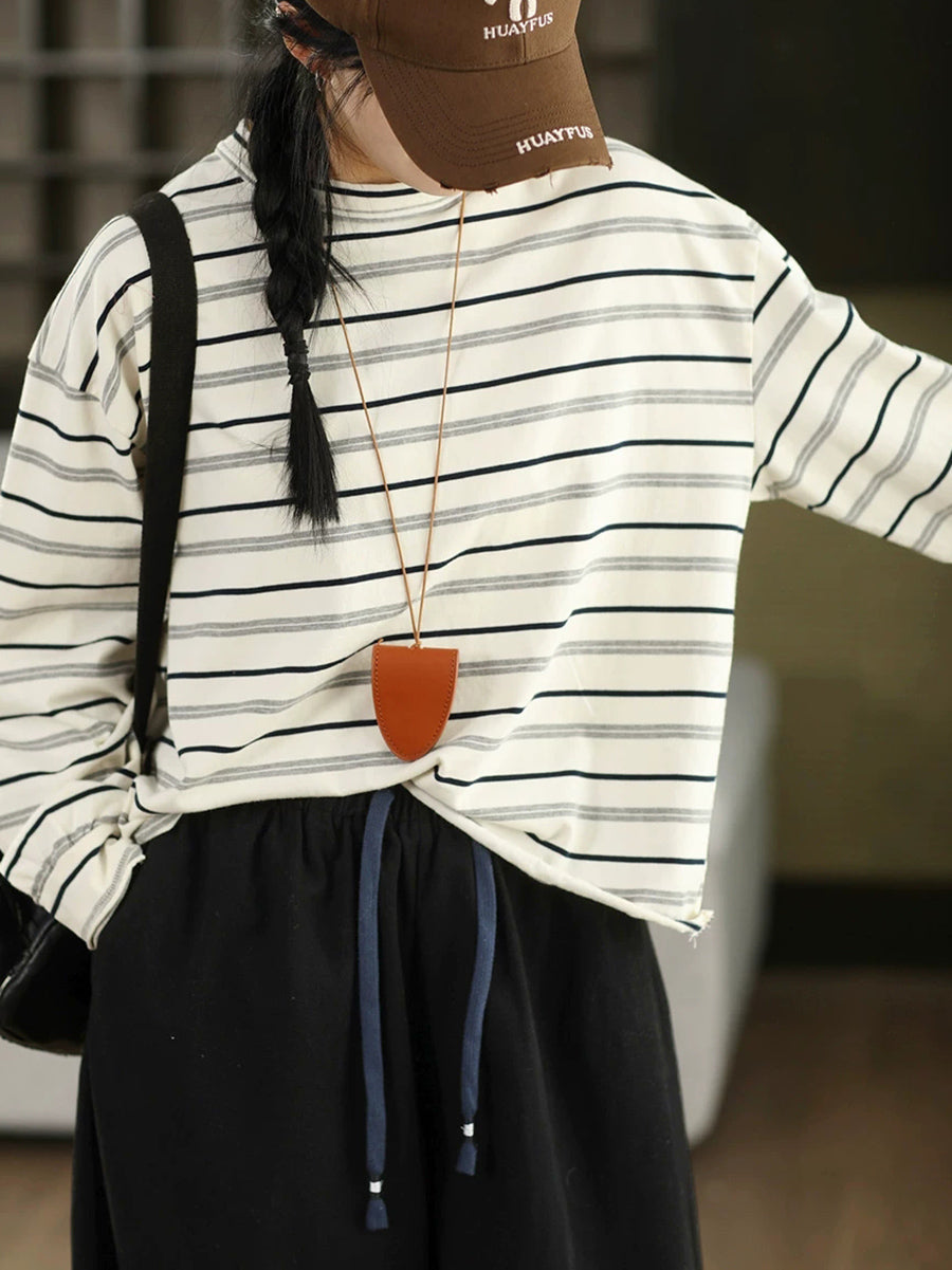レディース アーティスティック スプリング ストライプ コットン Oネック ブラウス