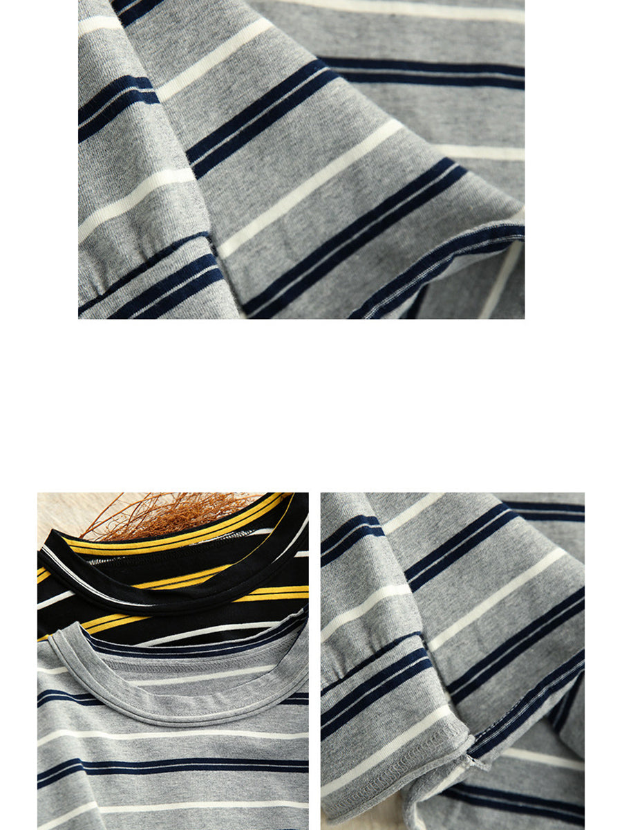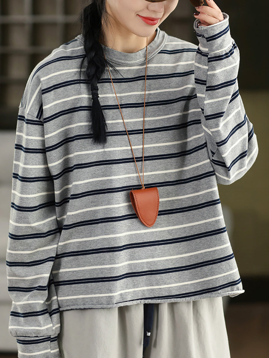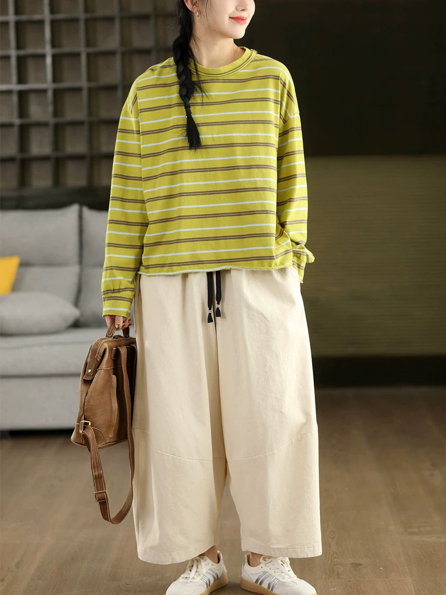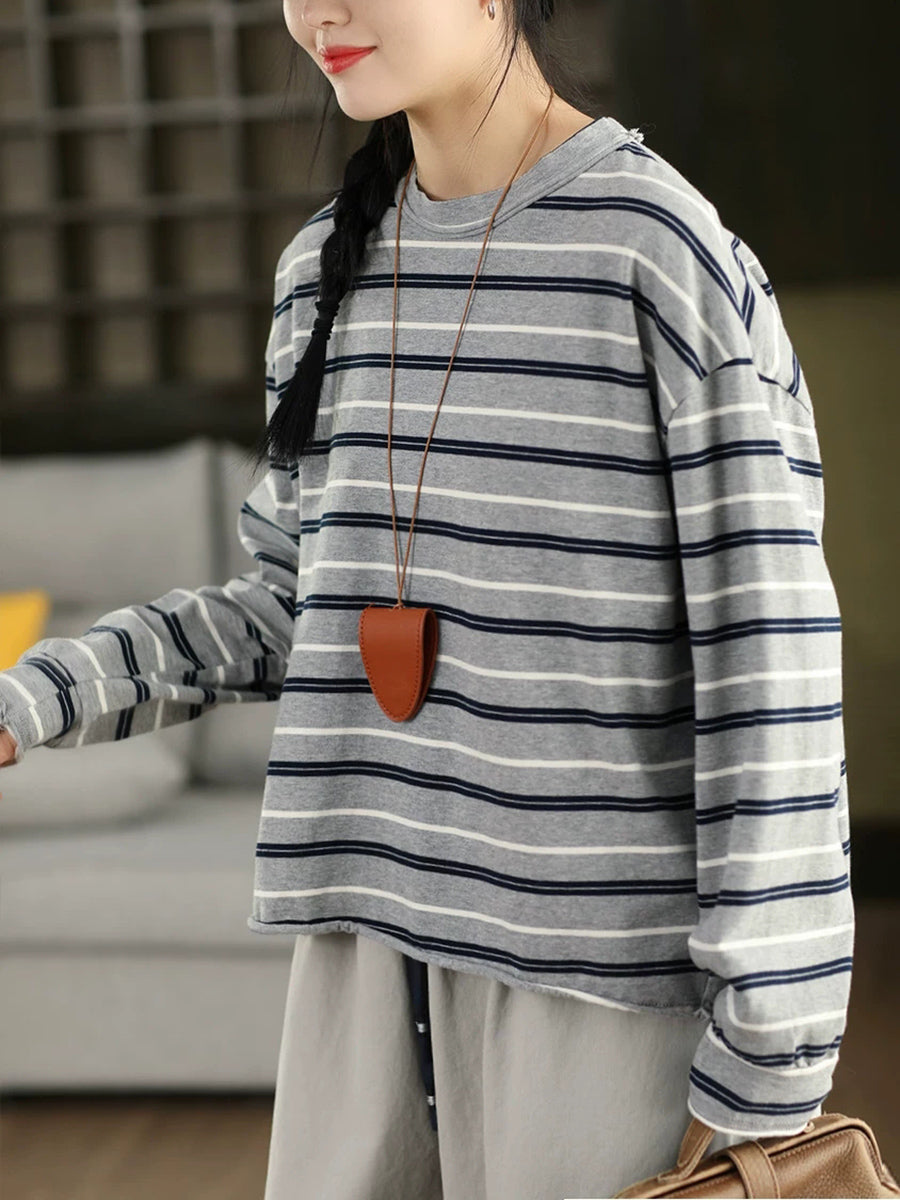 レディース アーティスティック スプリング ストライプ コットン Oネック ブラウス