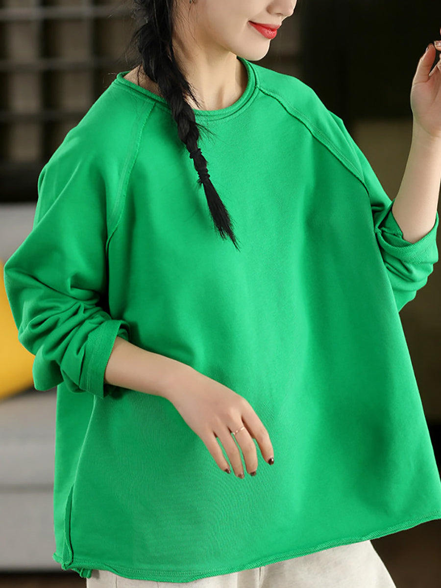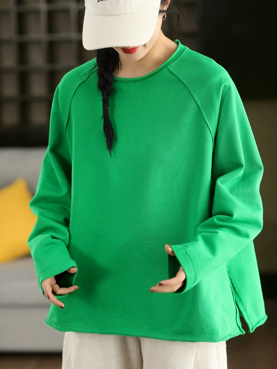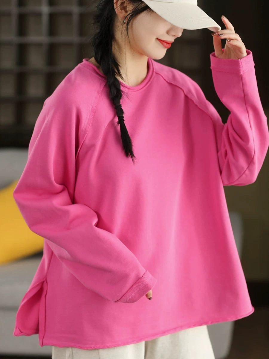 レディース カジュアル 春 ピュアカラー 100%コットン Oネック ブラウス