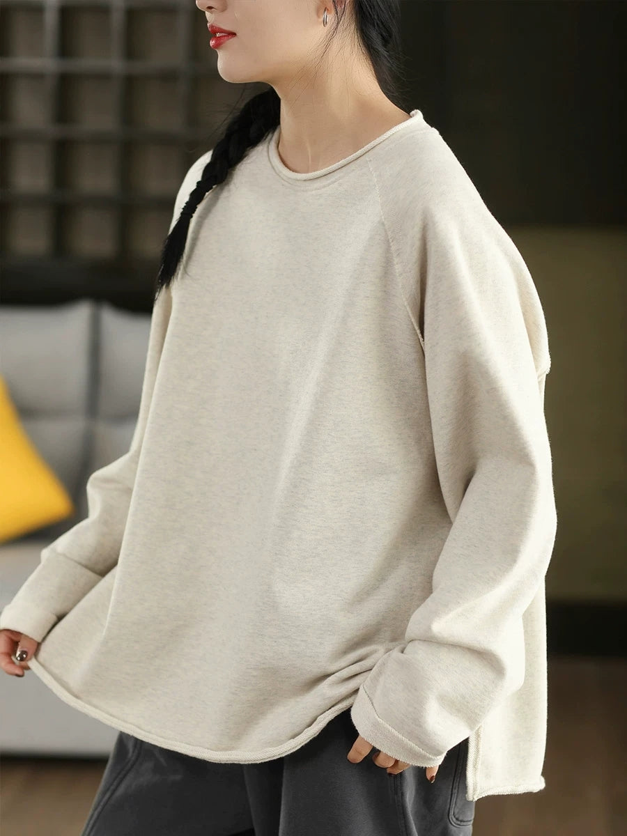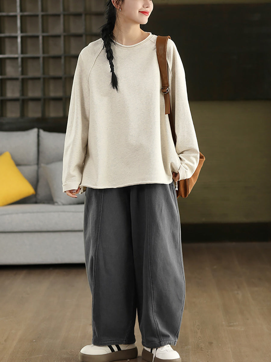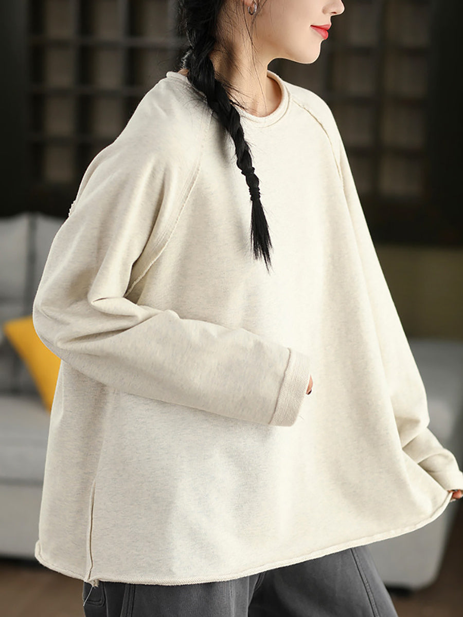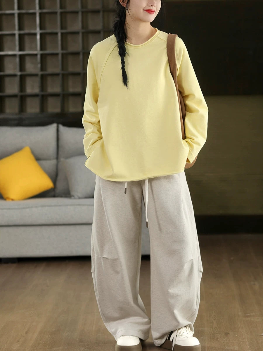 レディース カジュアル 春 ピュアカラー 100%コットン Oネック ブラウス