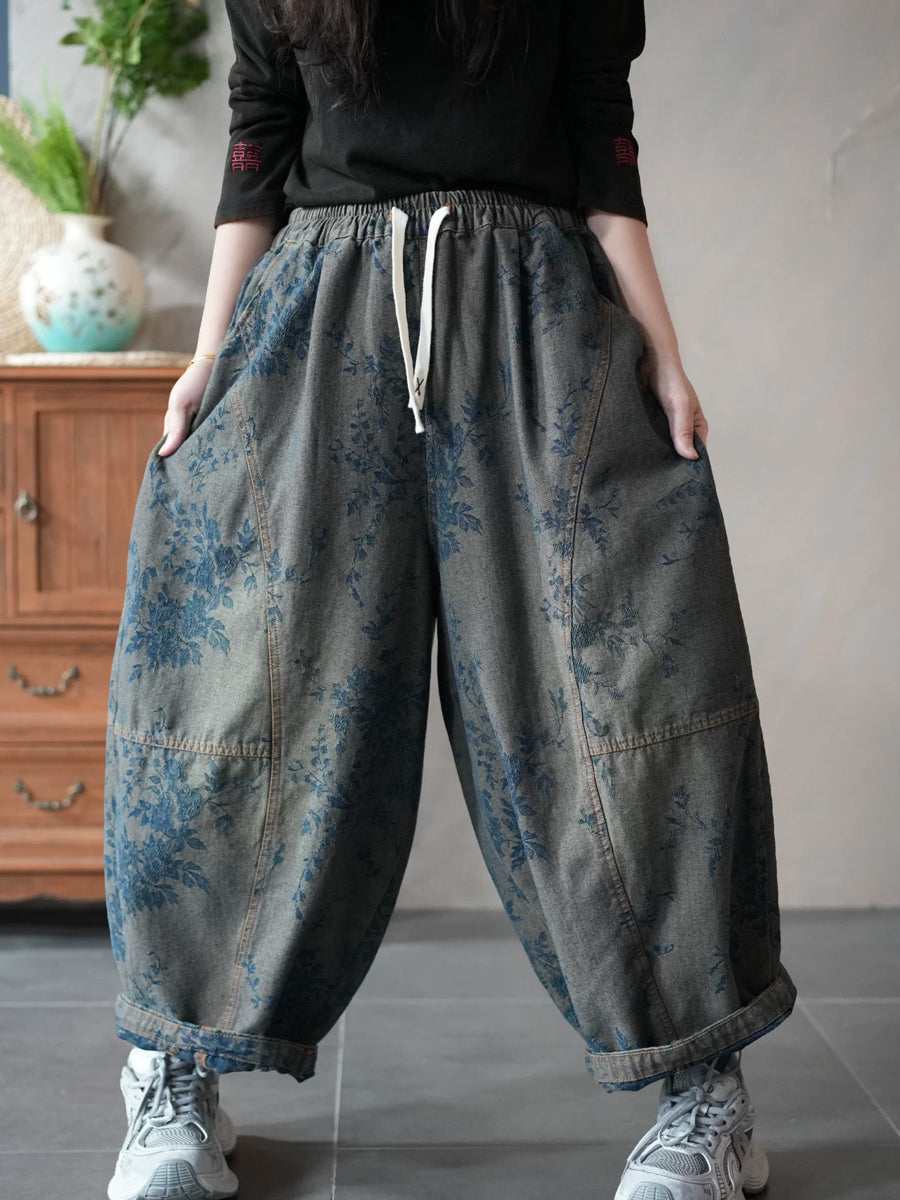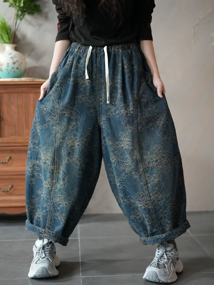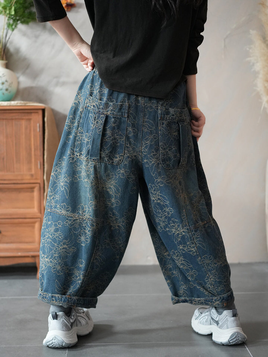 レディース 春 レトロ デニム フラワー ハーレムパンツ