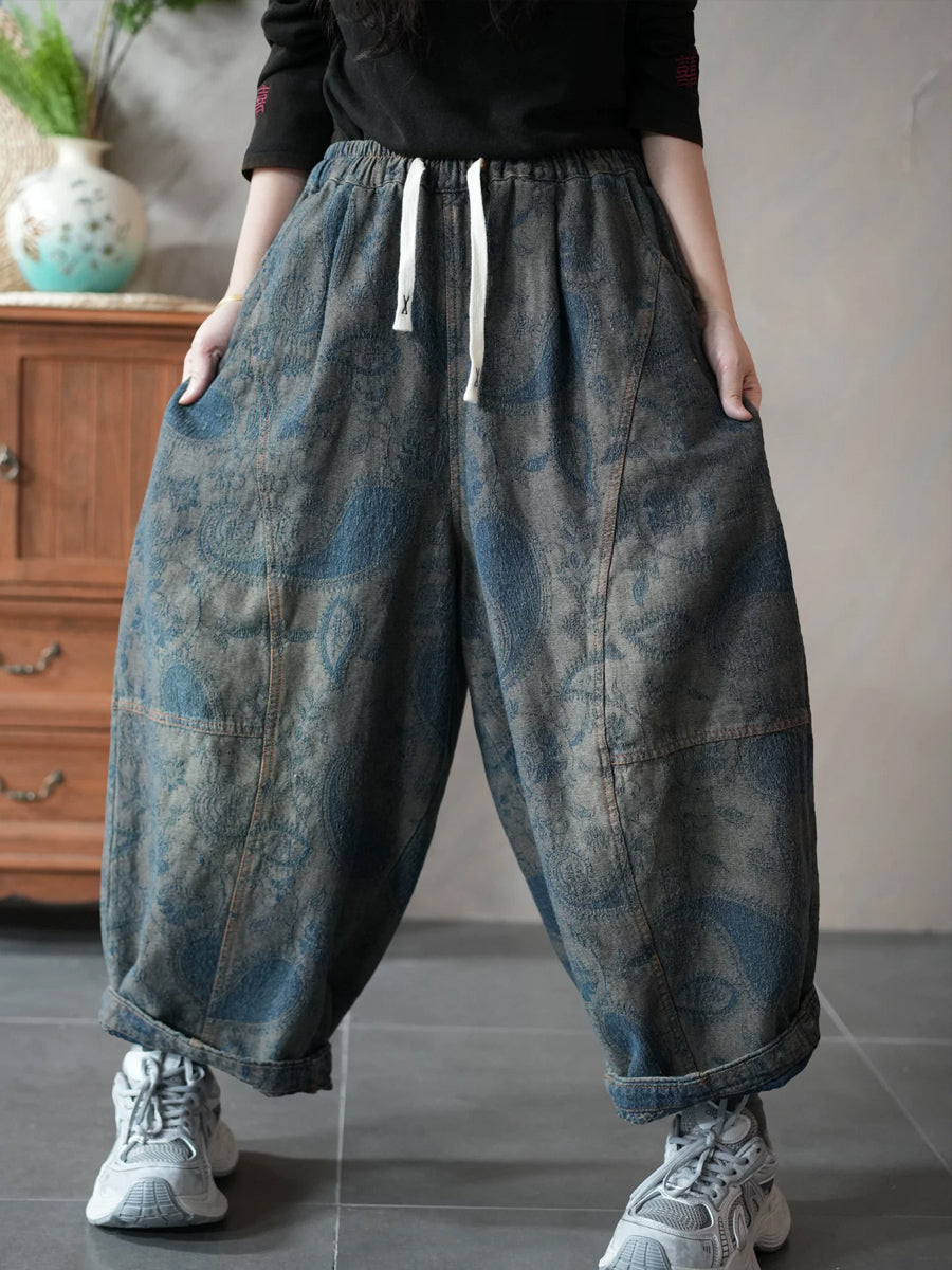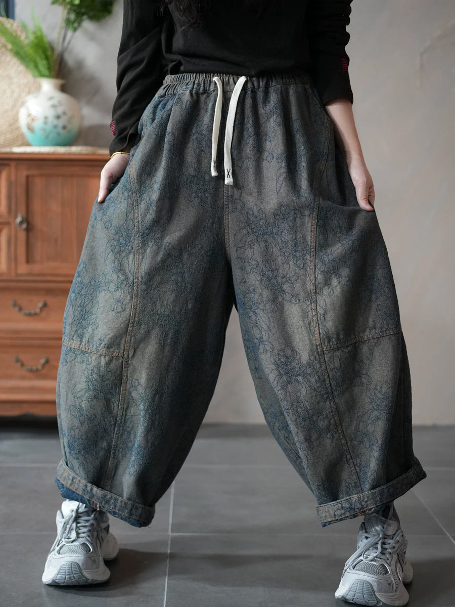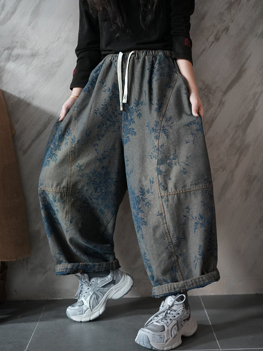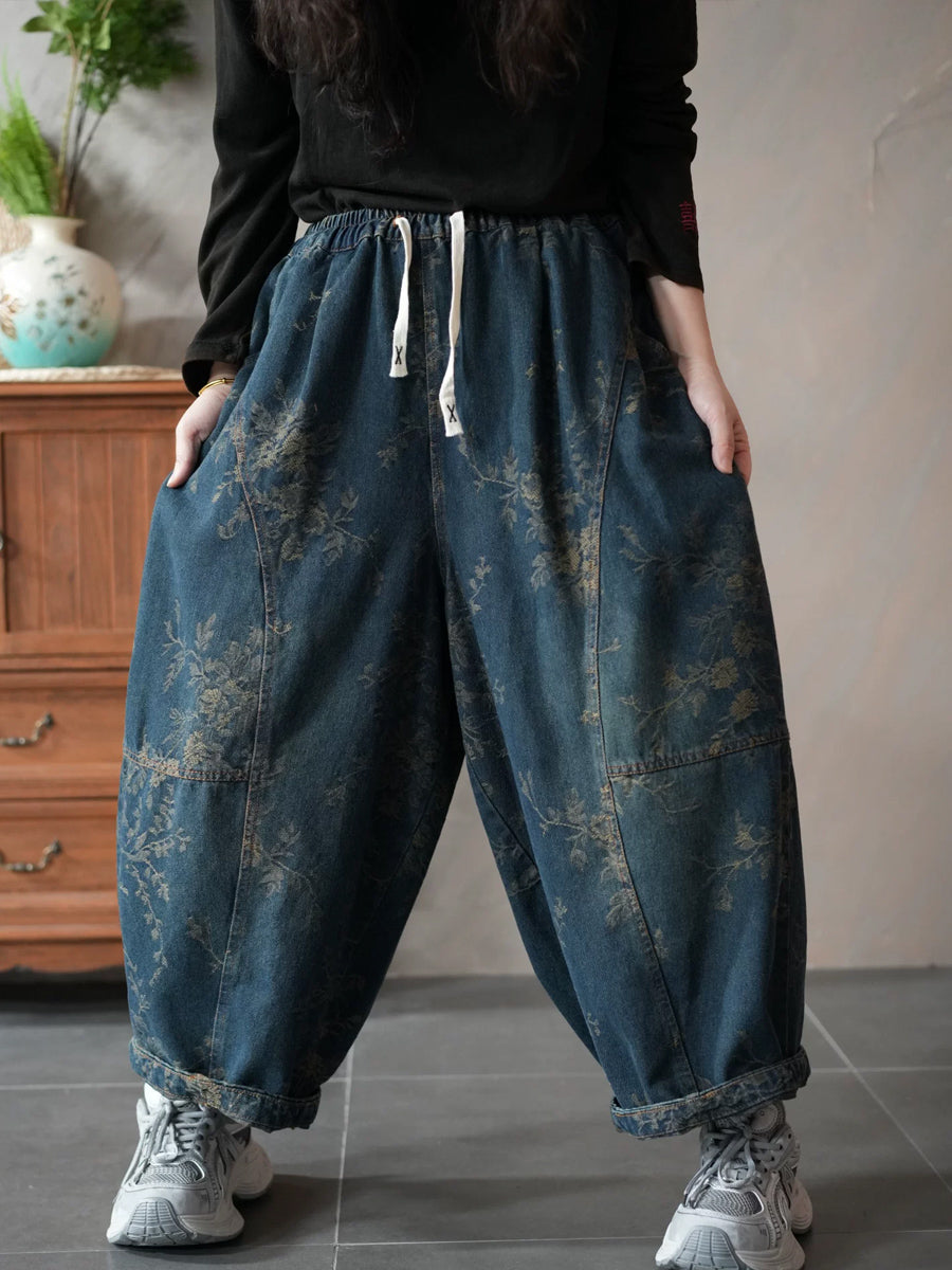 レディース 春 レトロ デニム フラワー ハーレムパンツ