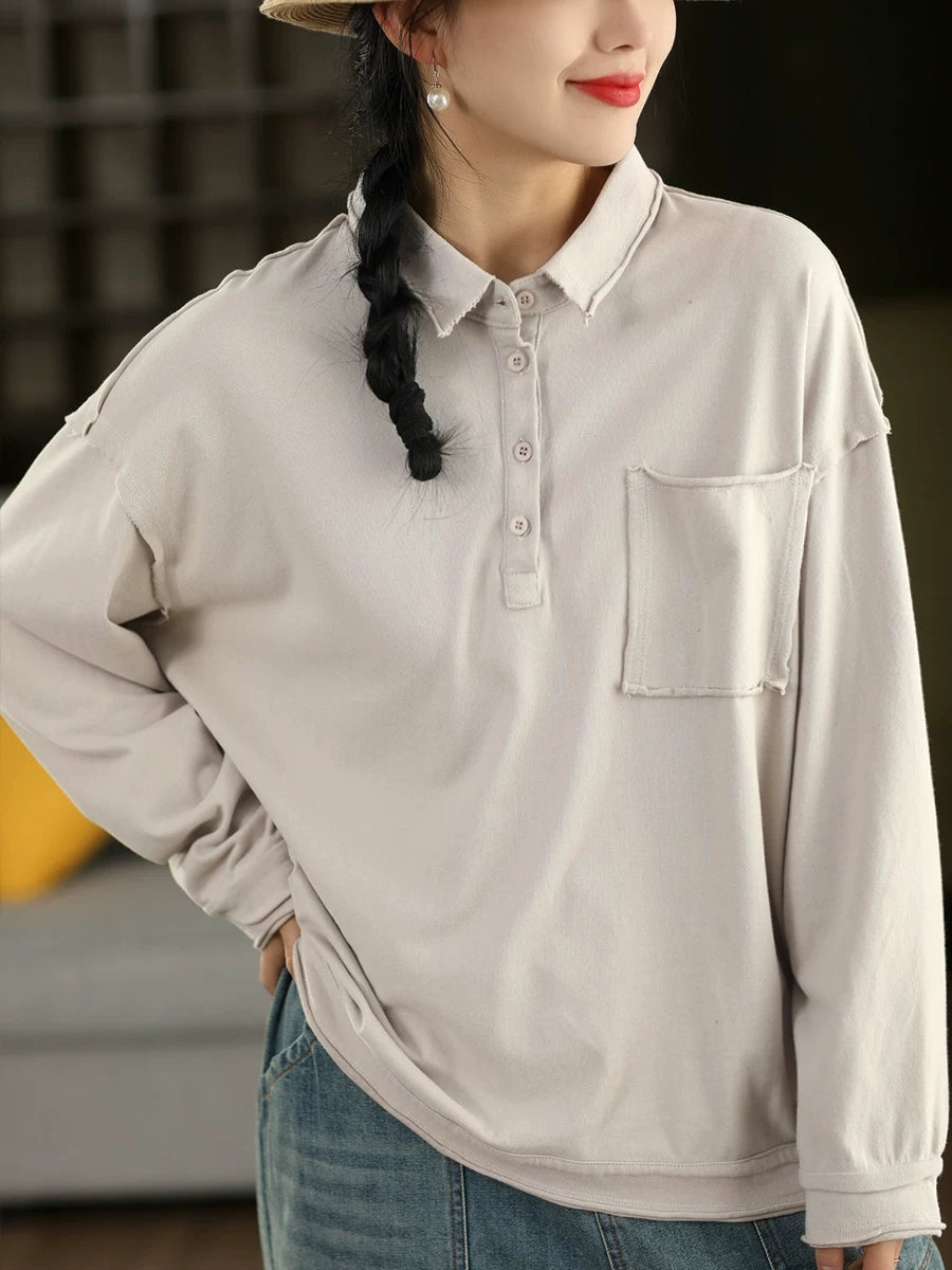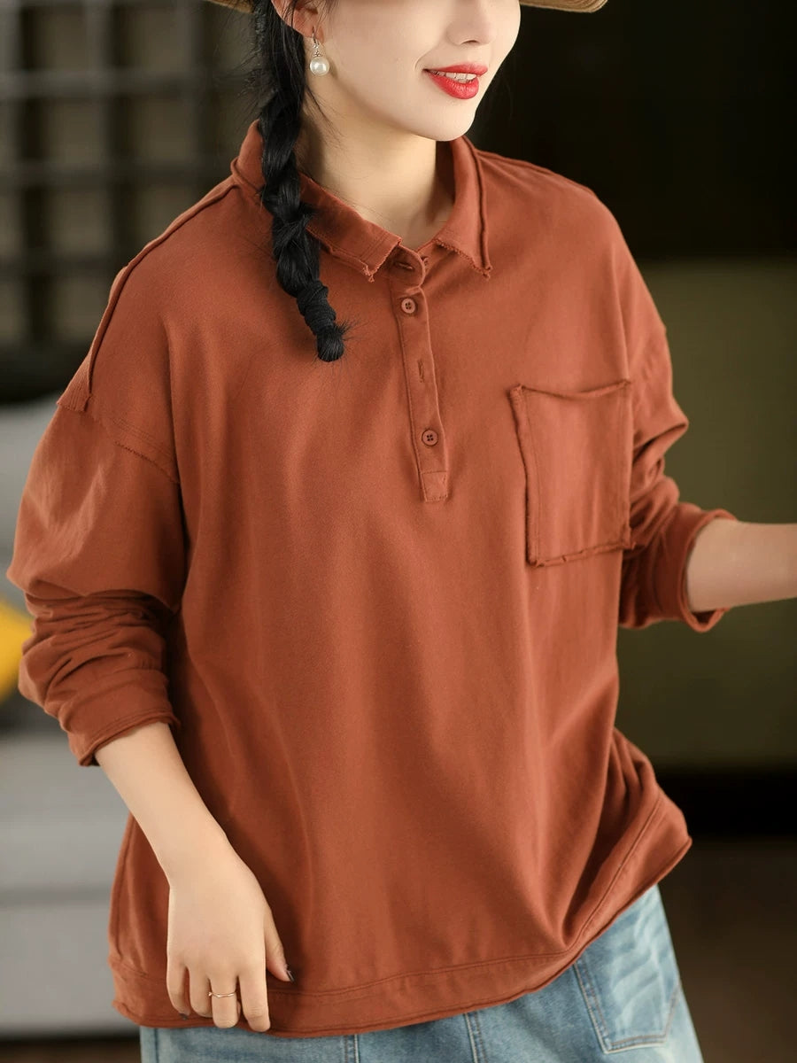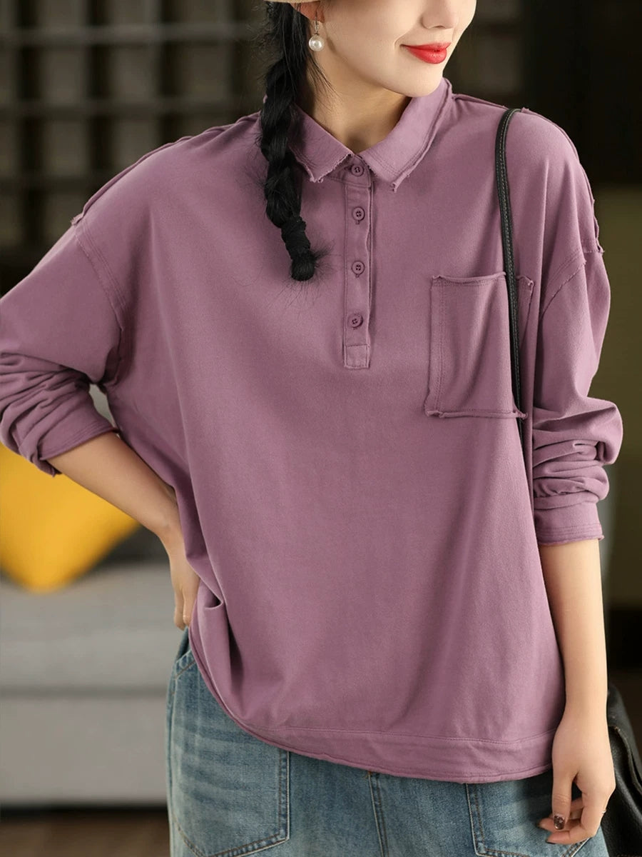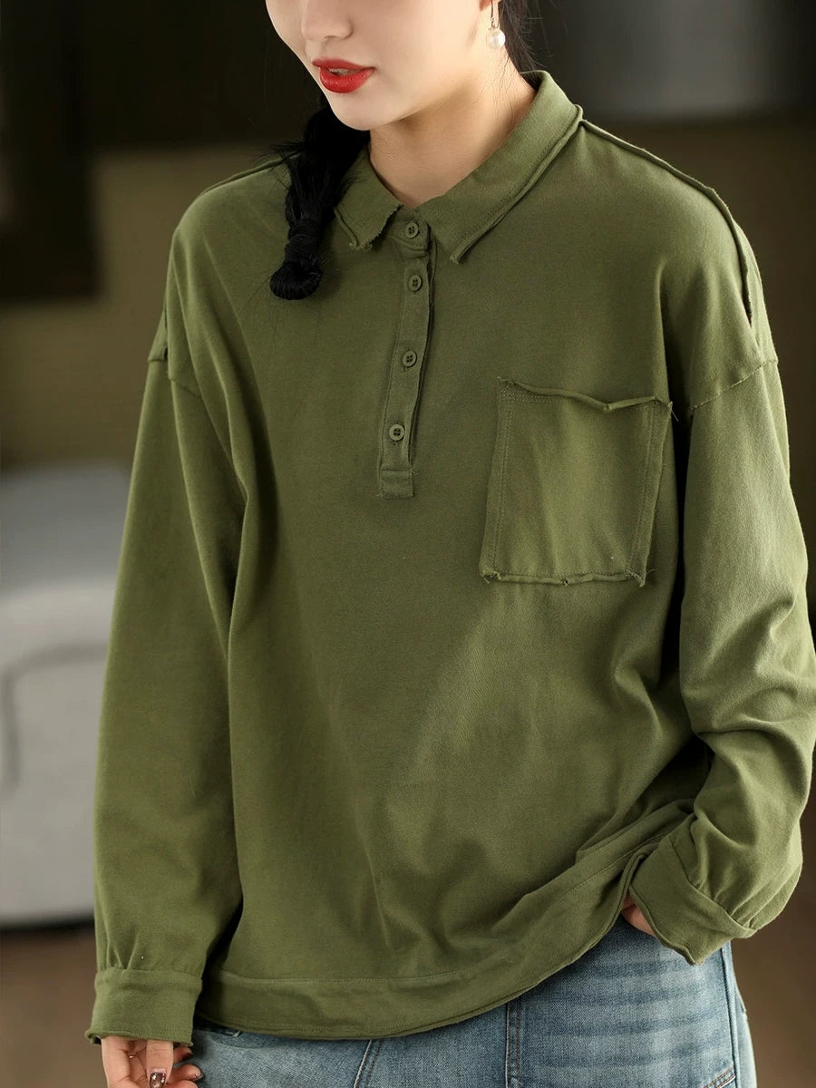 レディース 春 アーティスティック ピュアカラー コットン ターンダウンカラー ブラウス
