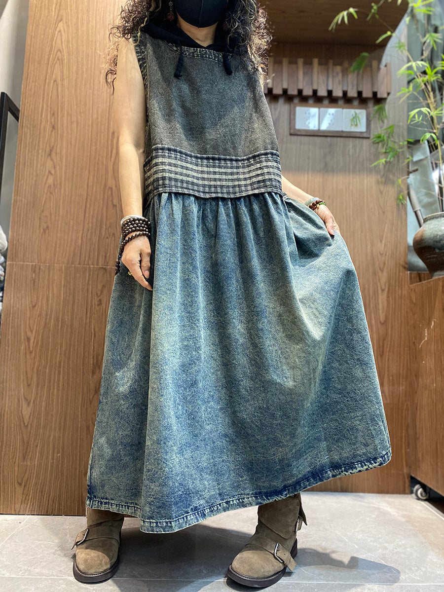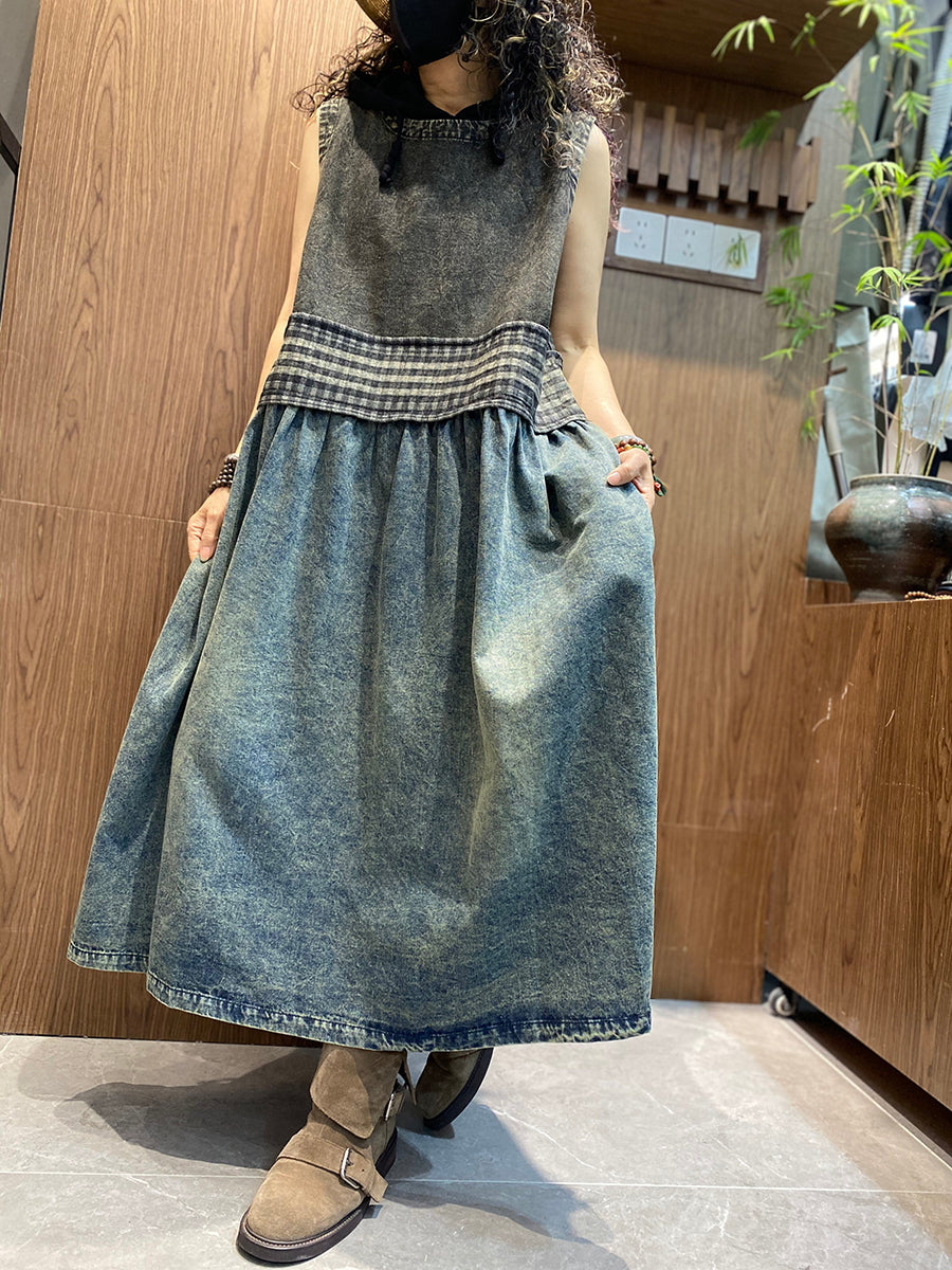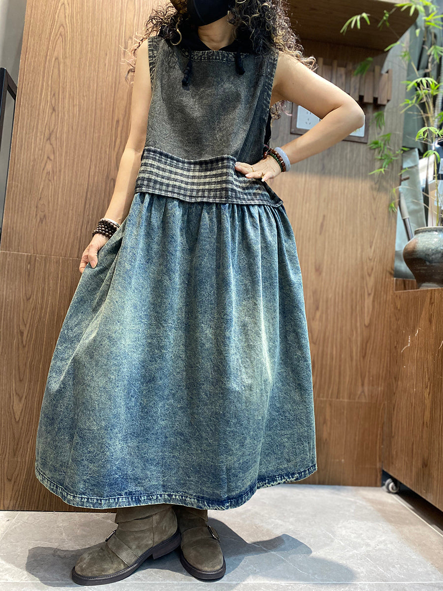 レディース サマー ヴィンテージ デニム スプライス Oネック ベスト ドレス