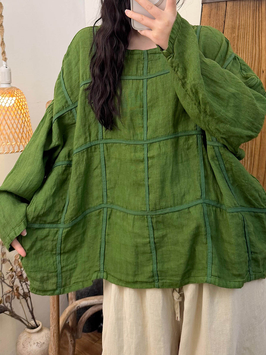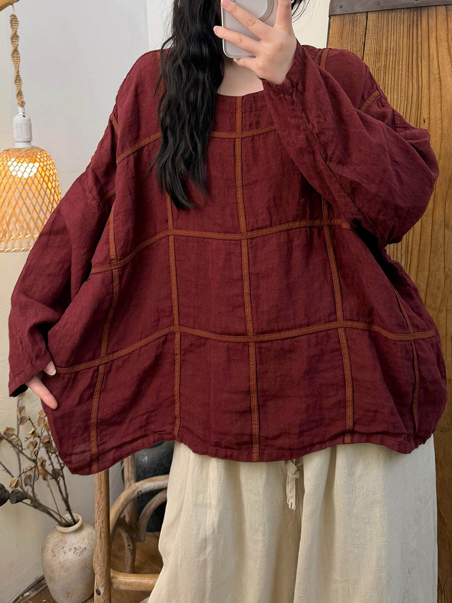 レディース 春 ヴィンテージ チェック柄 Oネック リネンシャツ