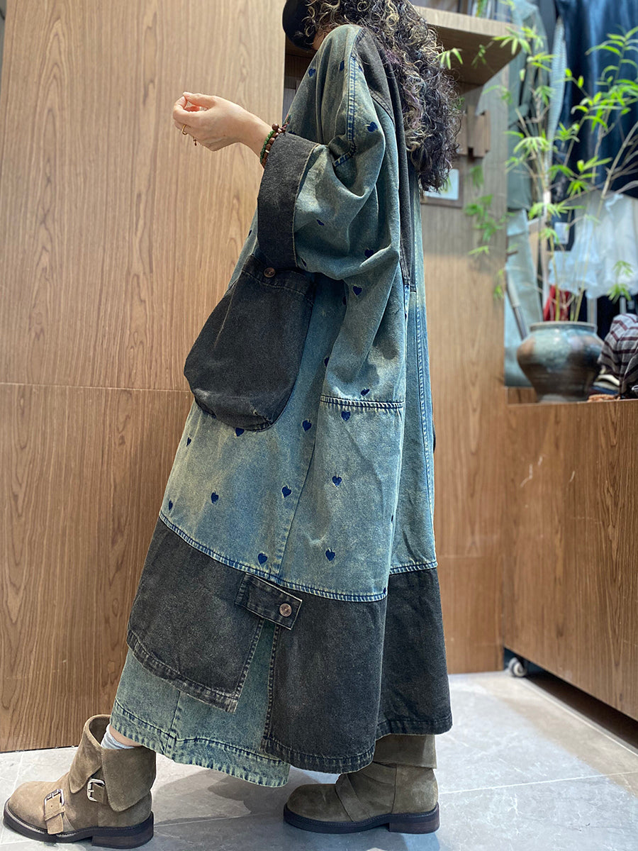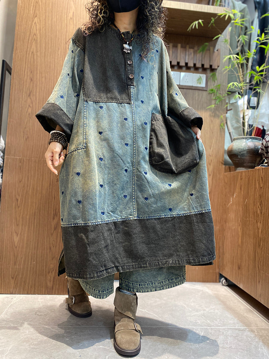 レディース サマー ヴィンテージ デニム スプライス Oネック ドレス