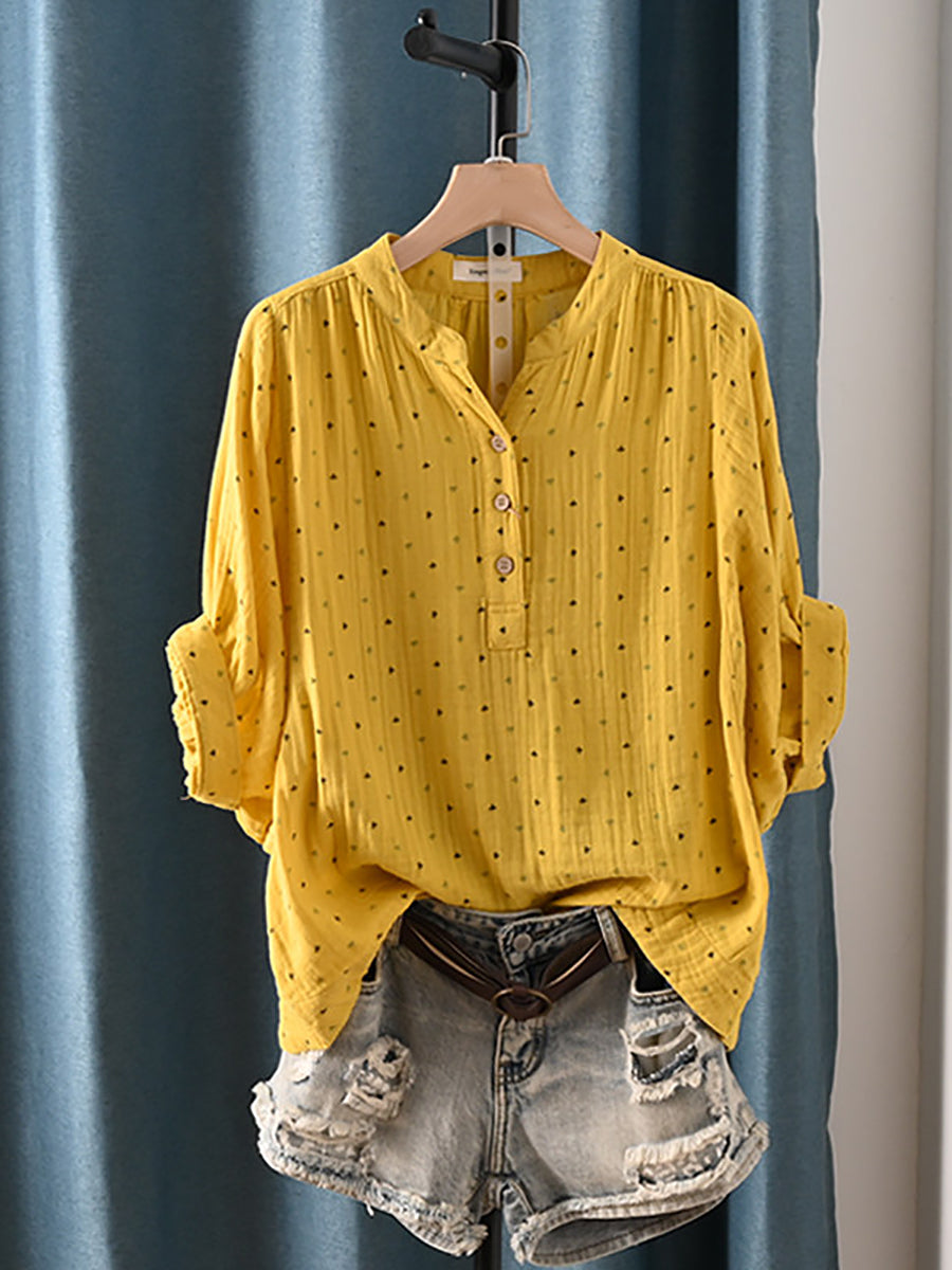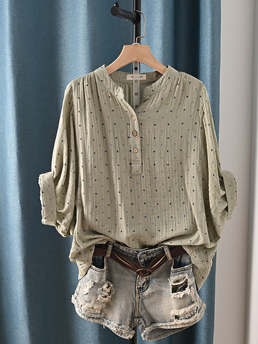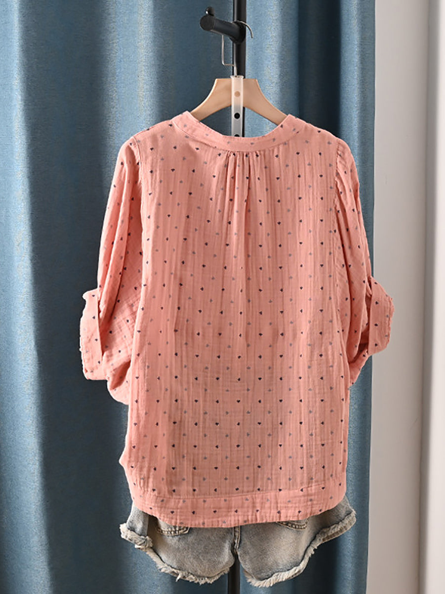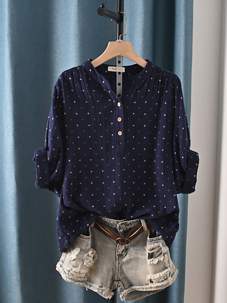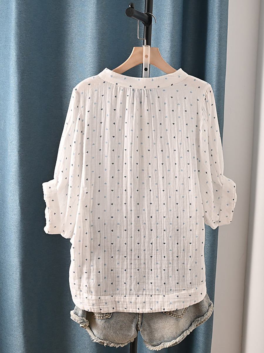 レディース 夏物 アーティスティック ドット柄 Vネック 100%コットンシャツ