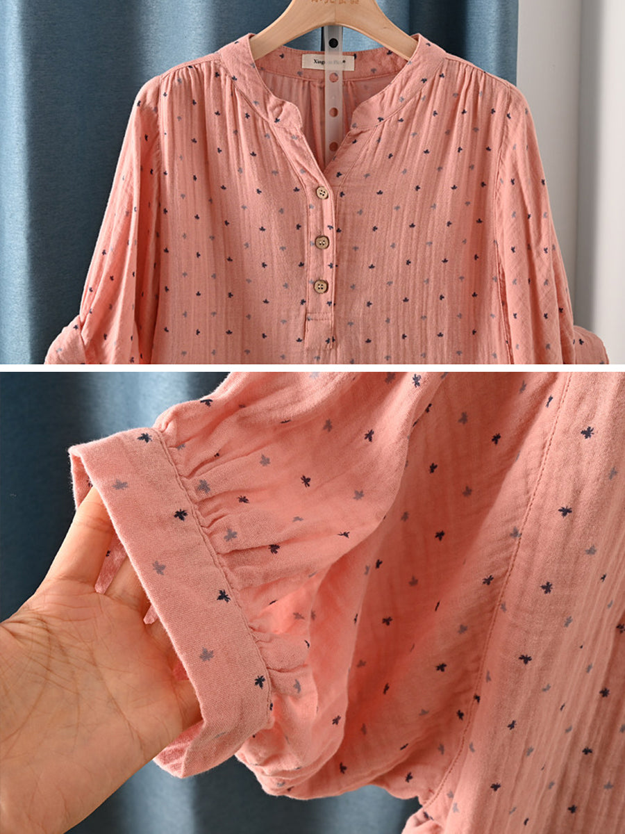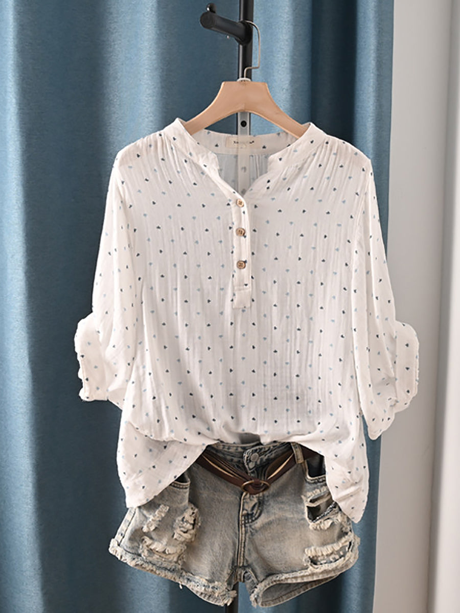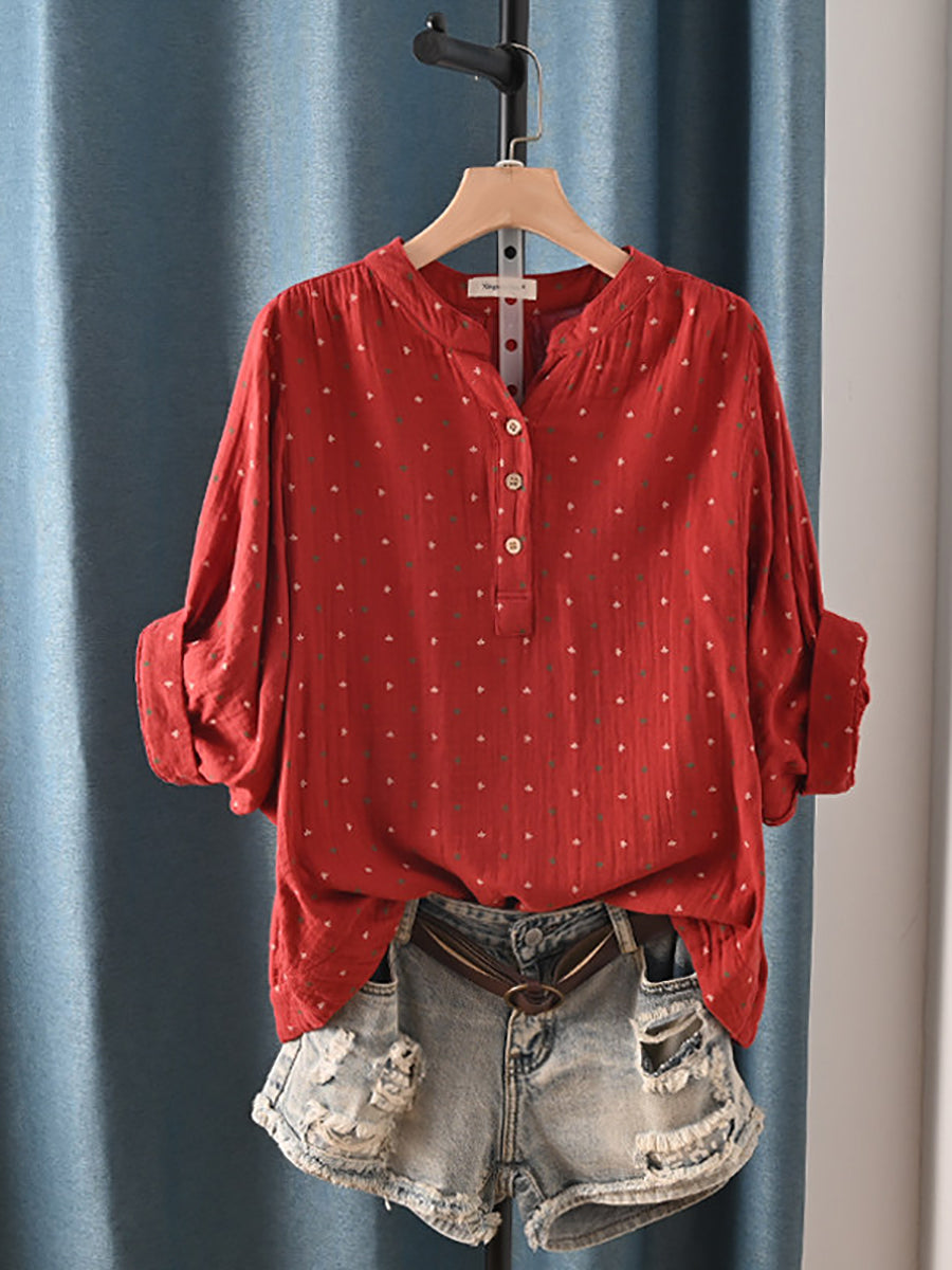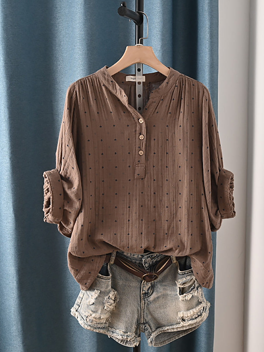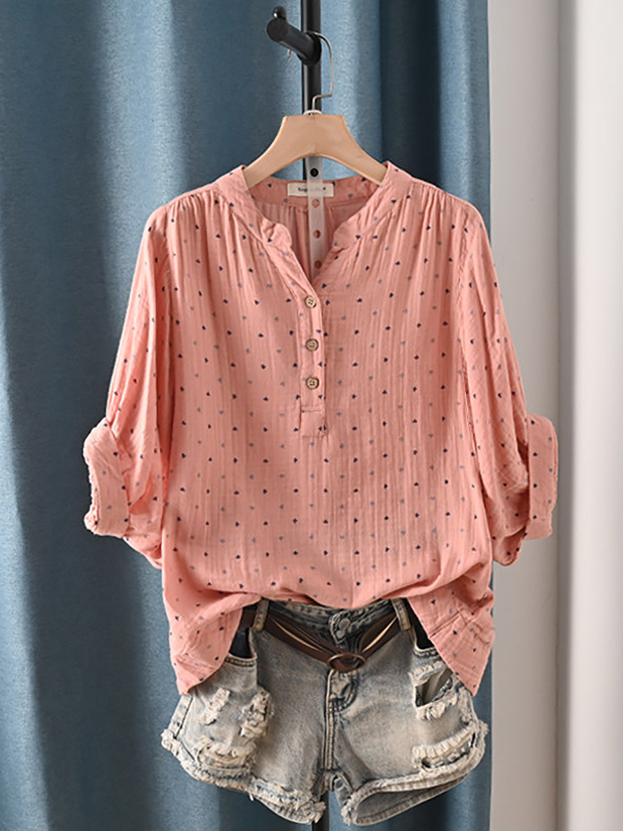 レディース 夏物 アーティスティック ドット柄 Vネック 100%コットンシャツ
