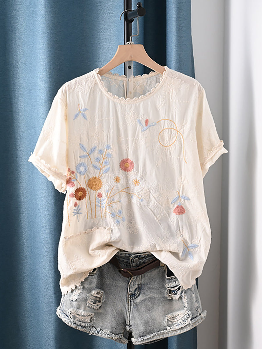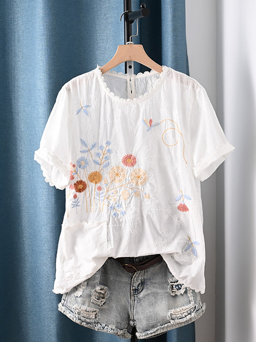 レディース 夏物 アーティスティックな花柄刺繍 100%コットンブラウス