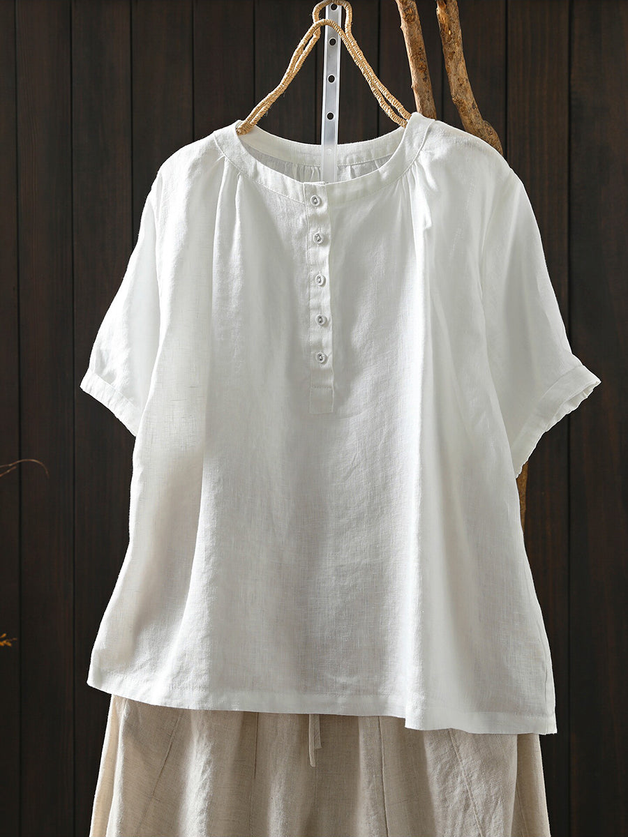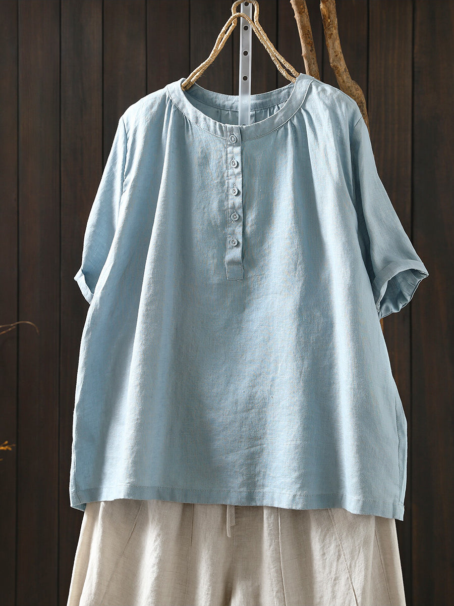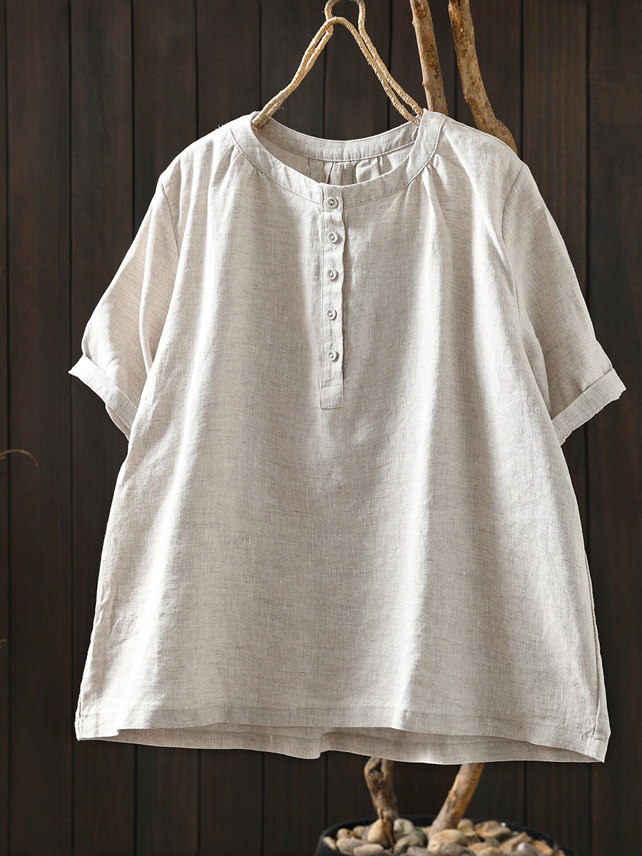 レディース 夏物 アーティスティック Oネック 100%リネン Tシャツ