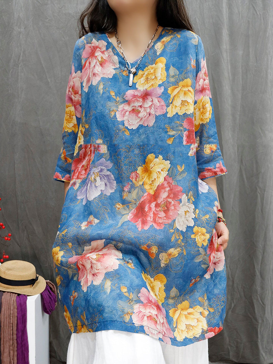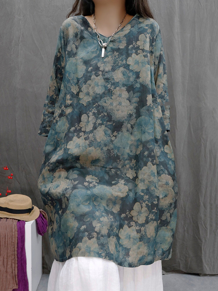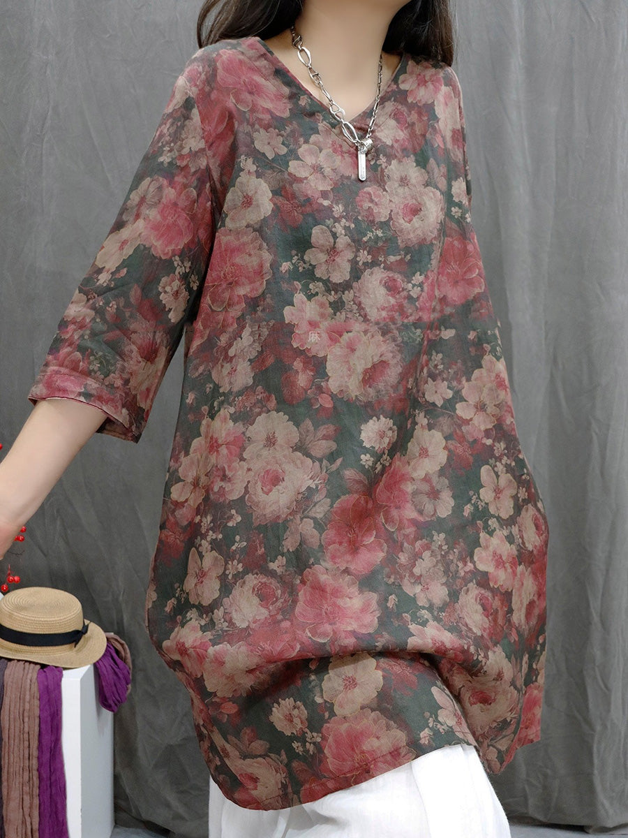 レディース サマー アーティスティックフラワー Vネック 100%ラミーシャツ