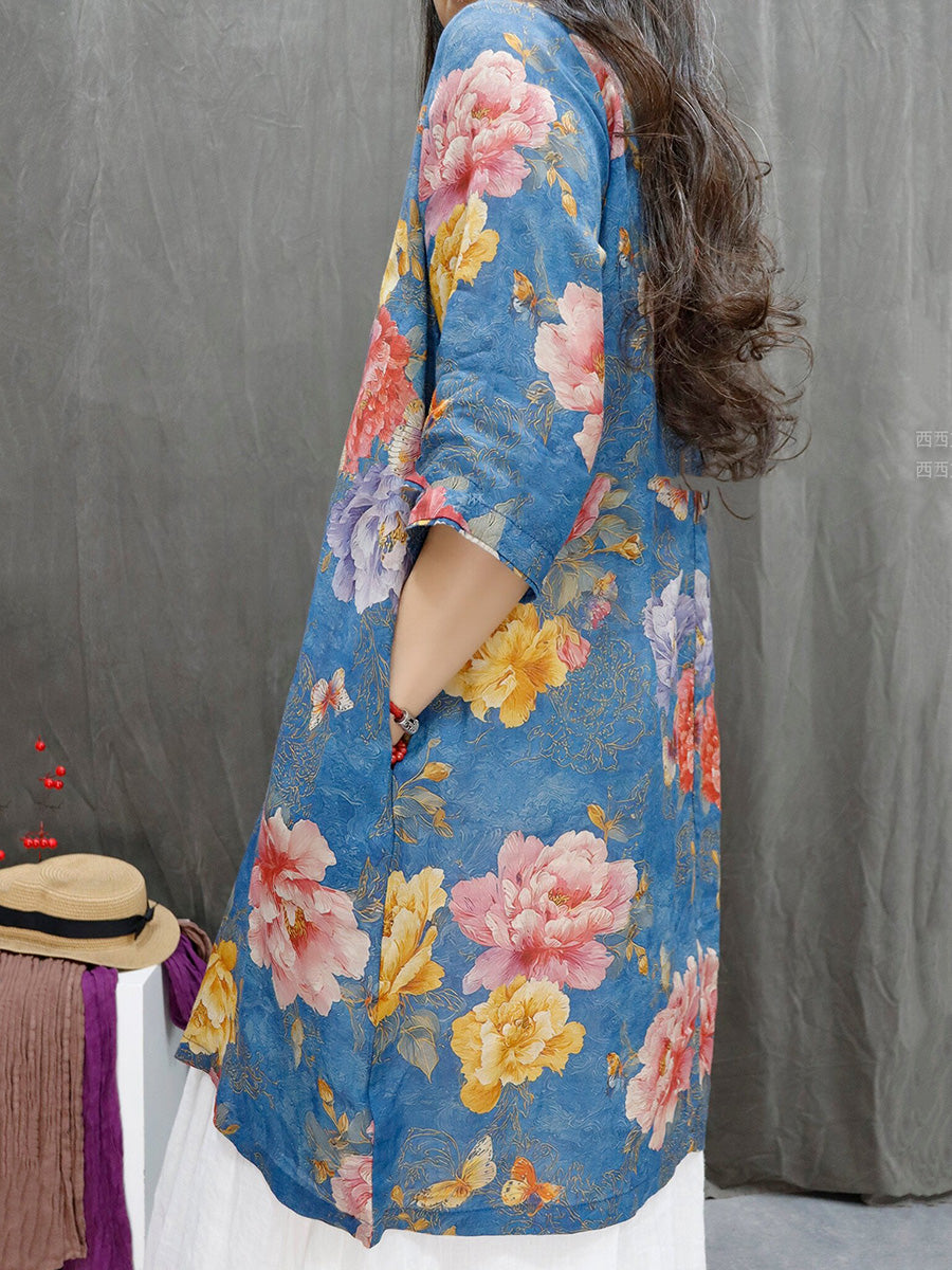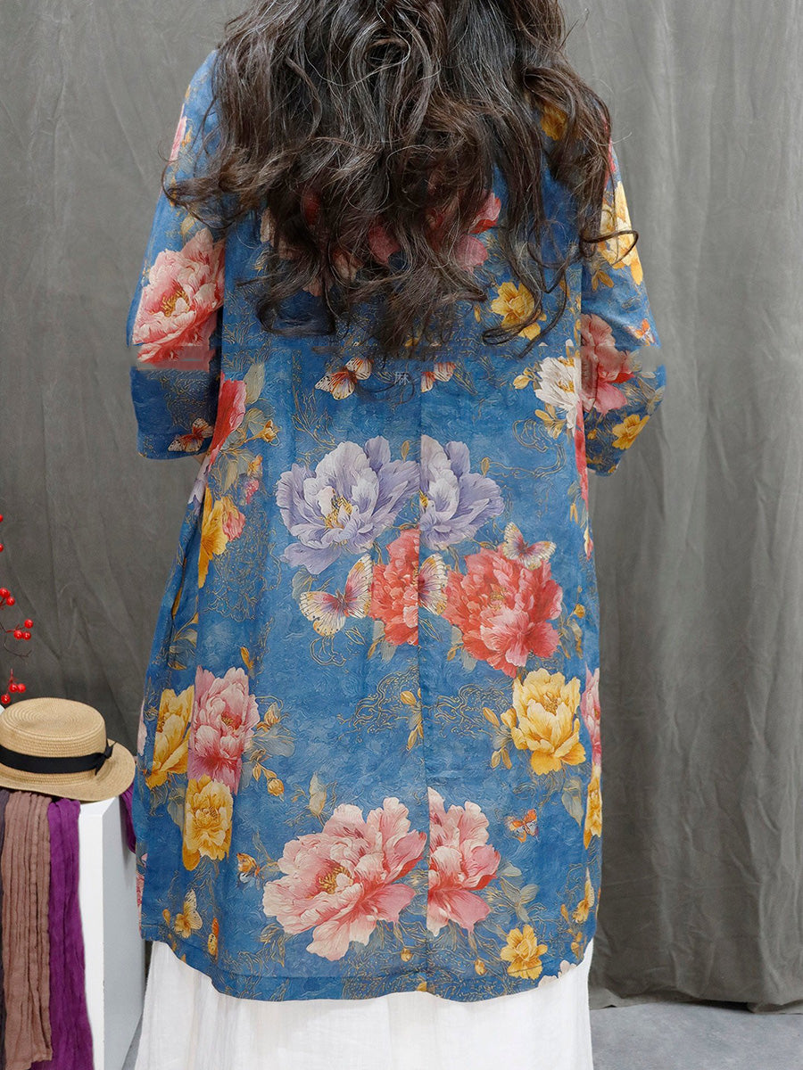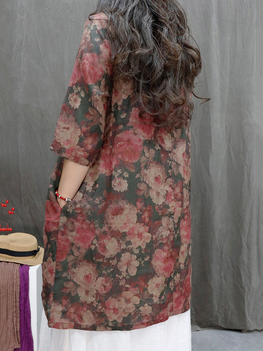 レディース サマー アーティスティックフラワー Vネック 100%ラミーシャツ