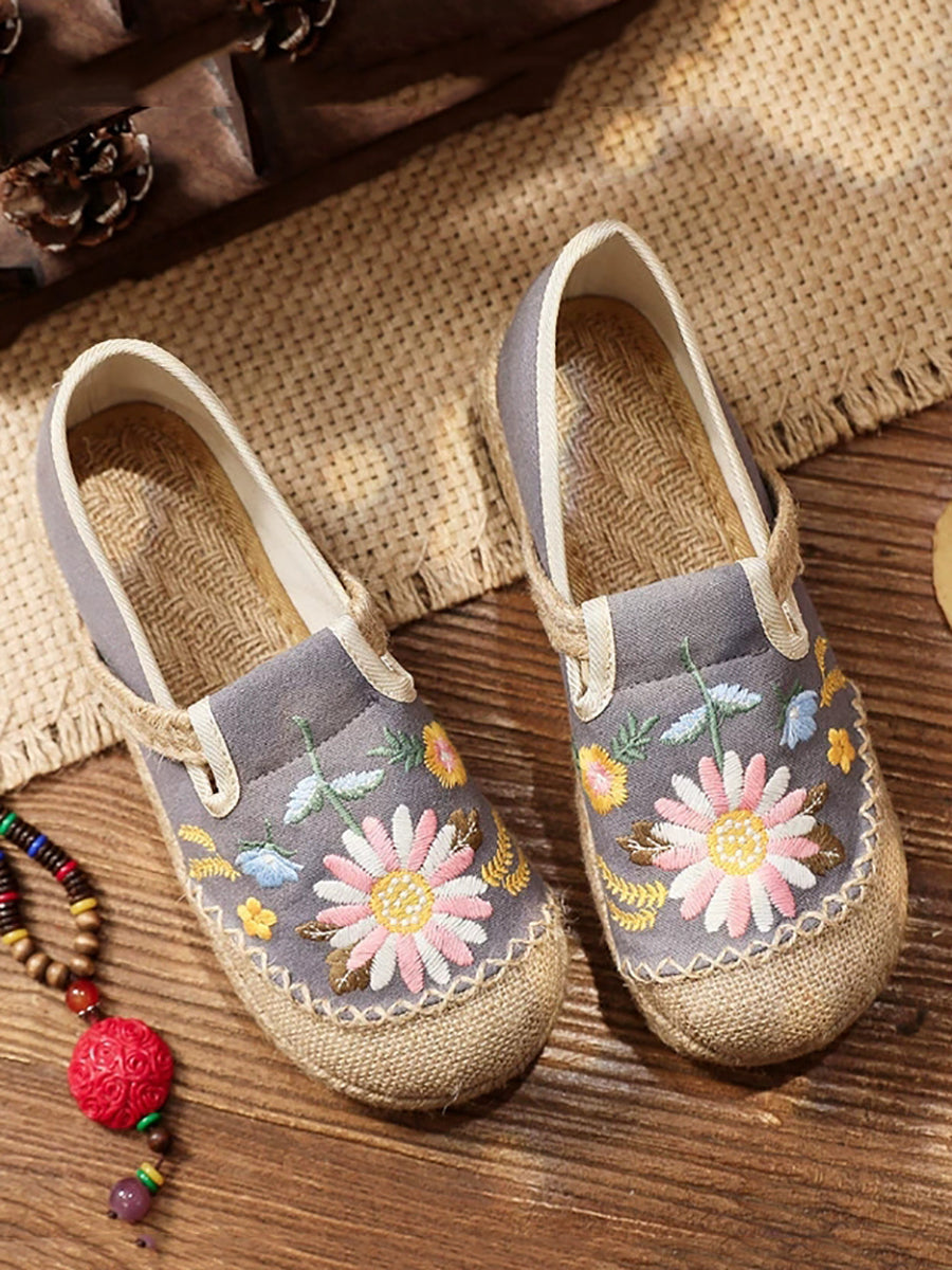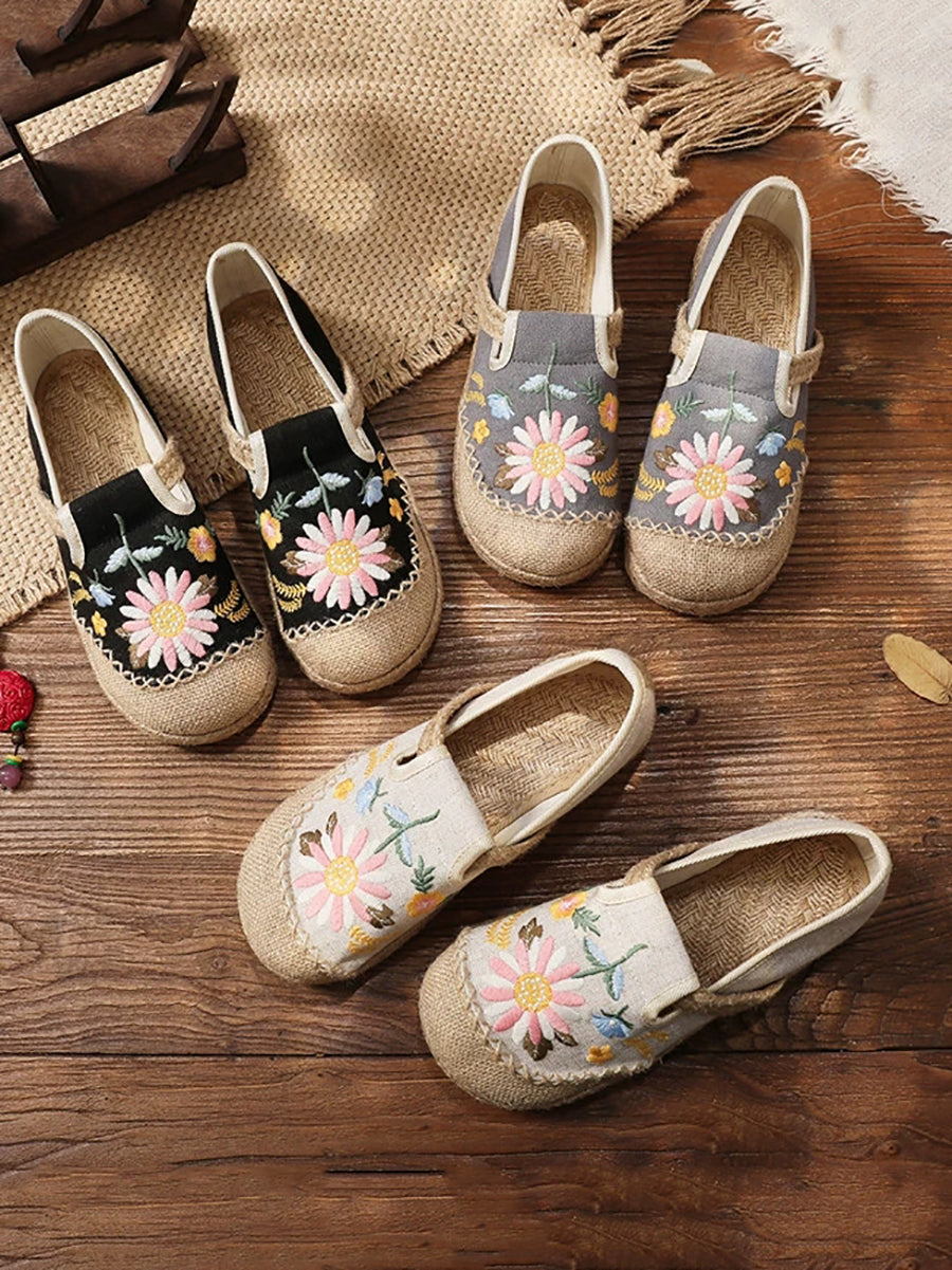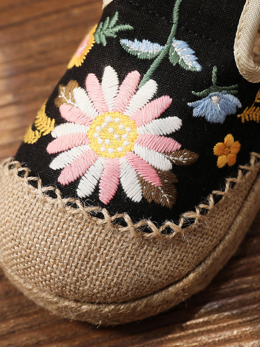 レディース サマーフラワー刺繍フラットキャンバスシューズ