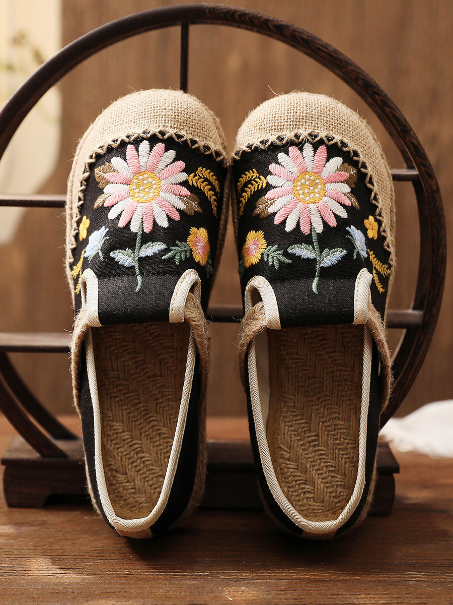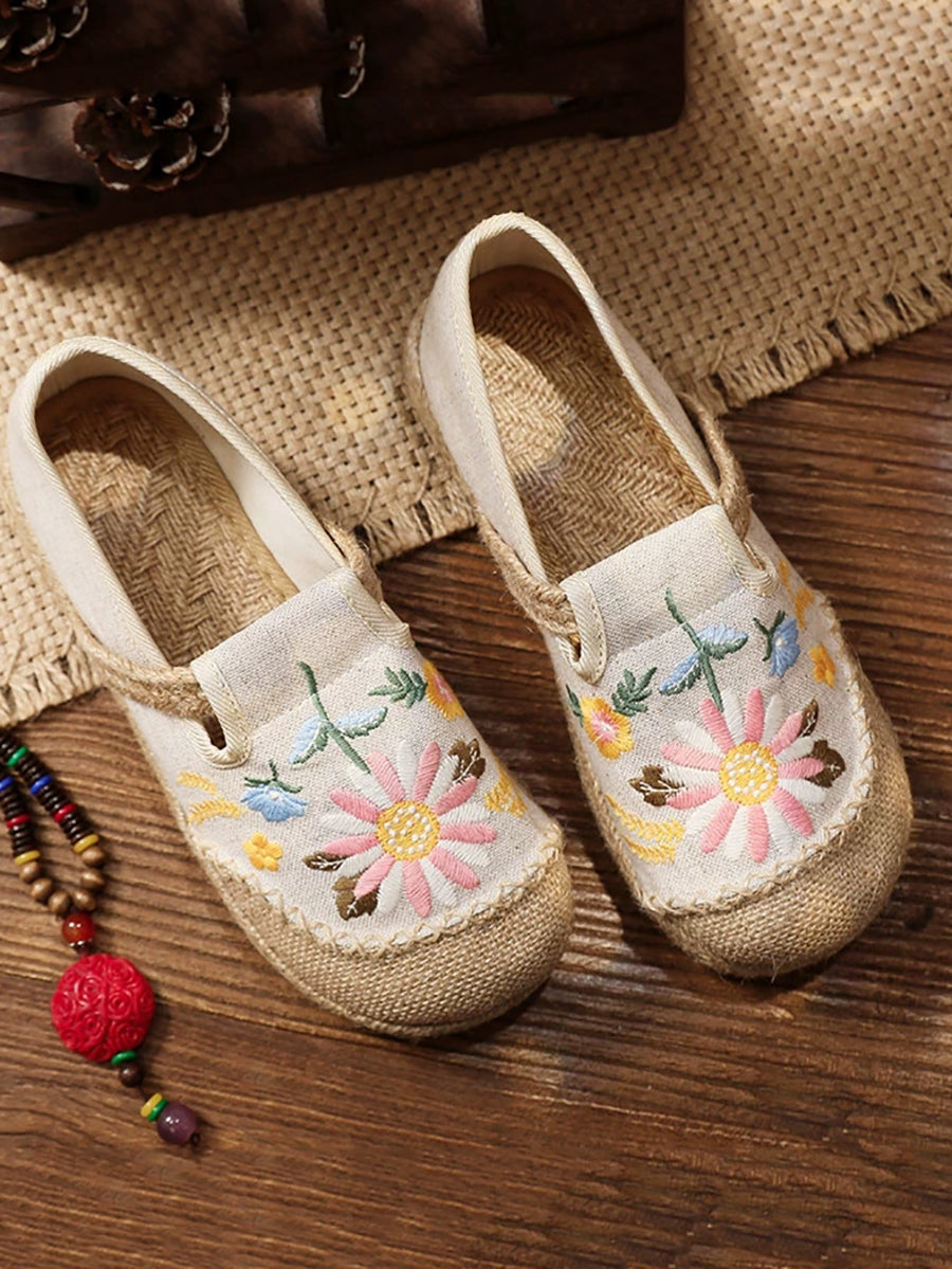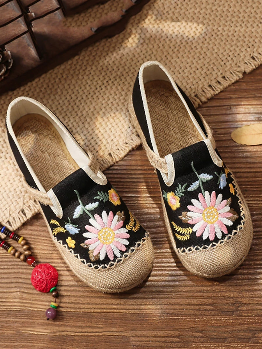 レディース サマーフラワー刺繍フラットキャンバスシューズ