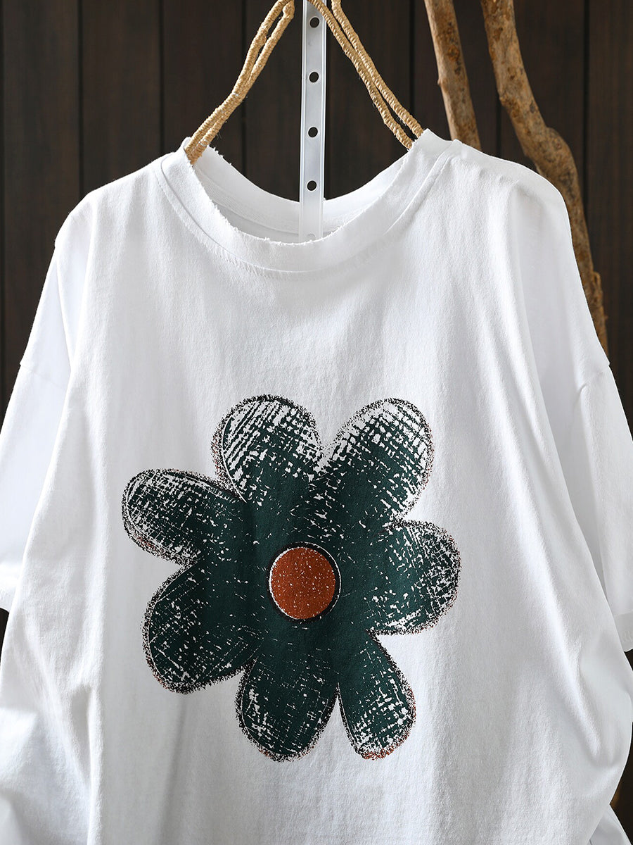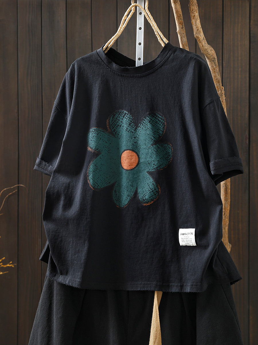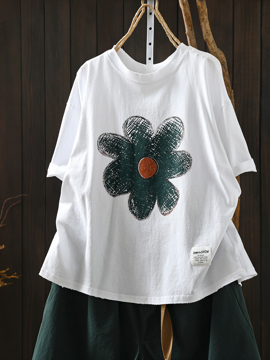 レディース 夏用 アーティスティックな花柄コットンTシャツ