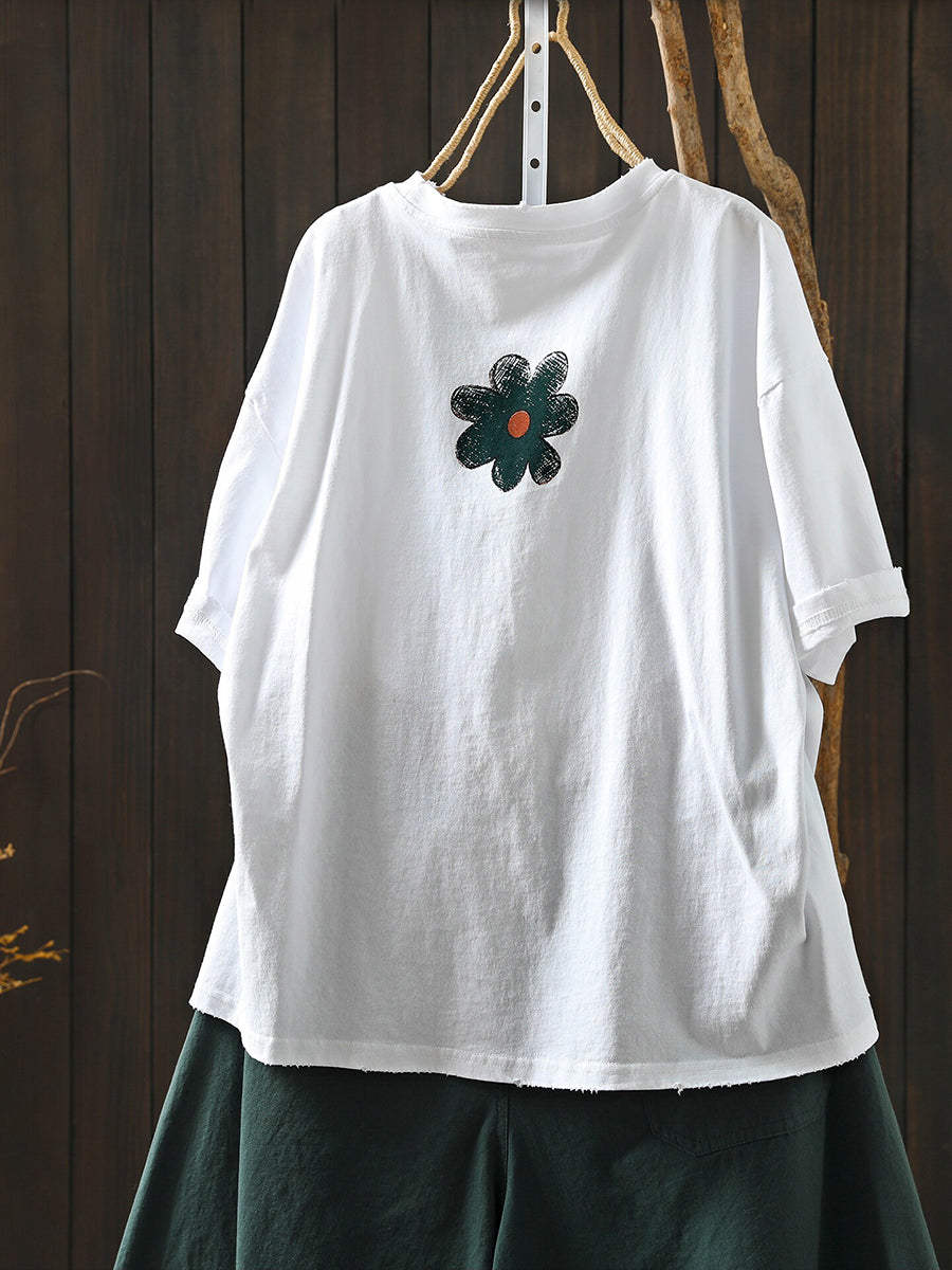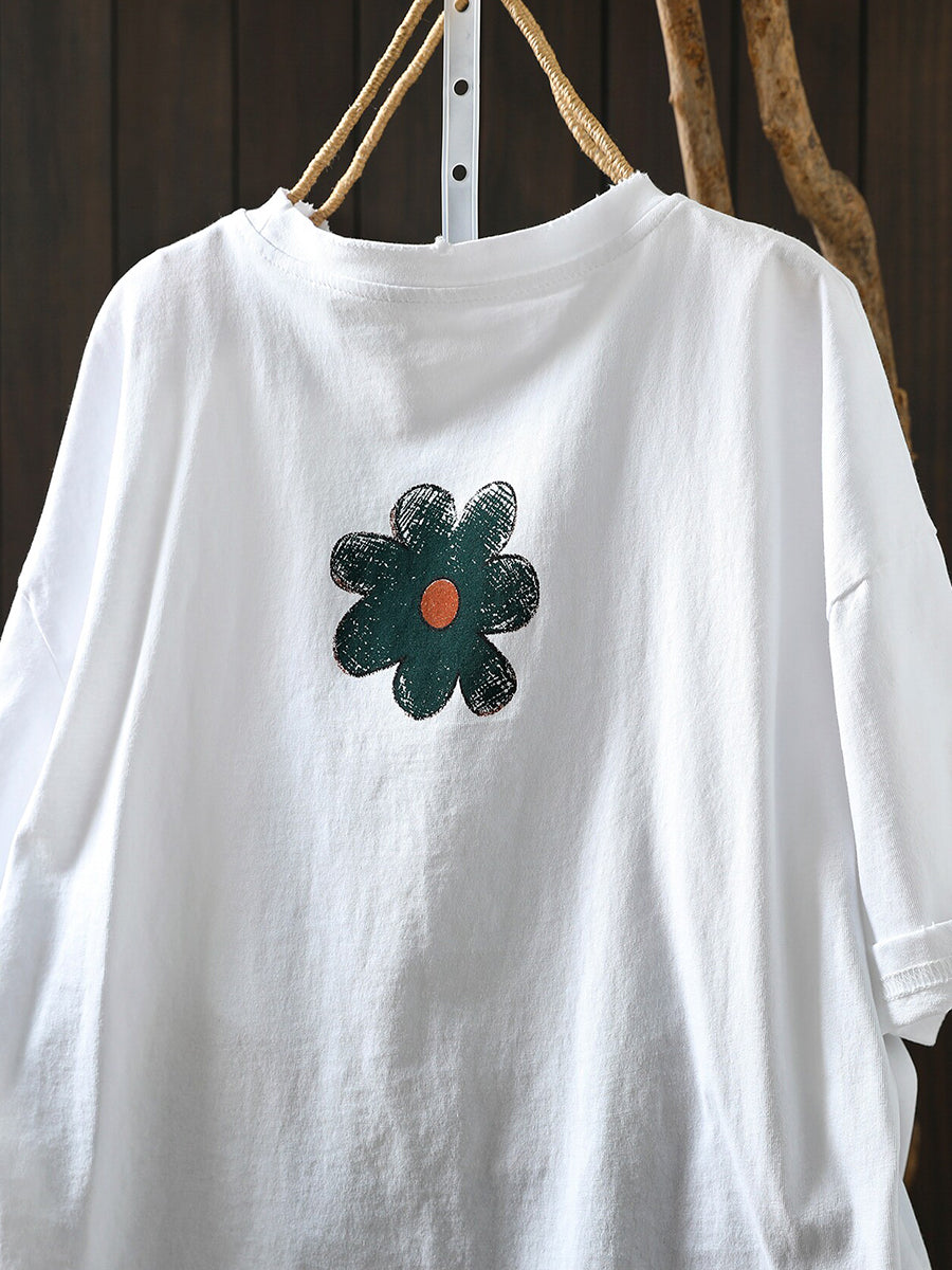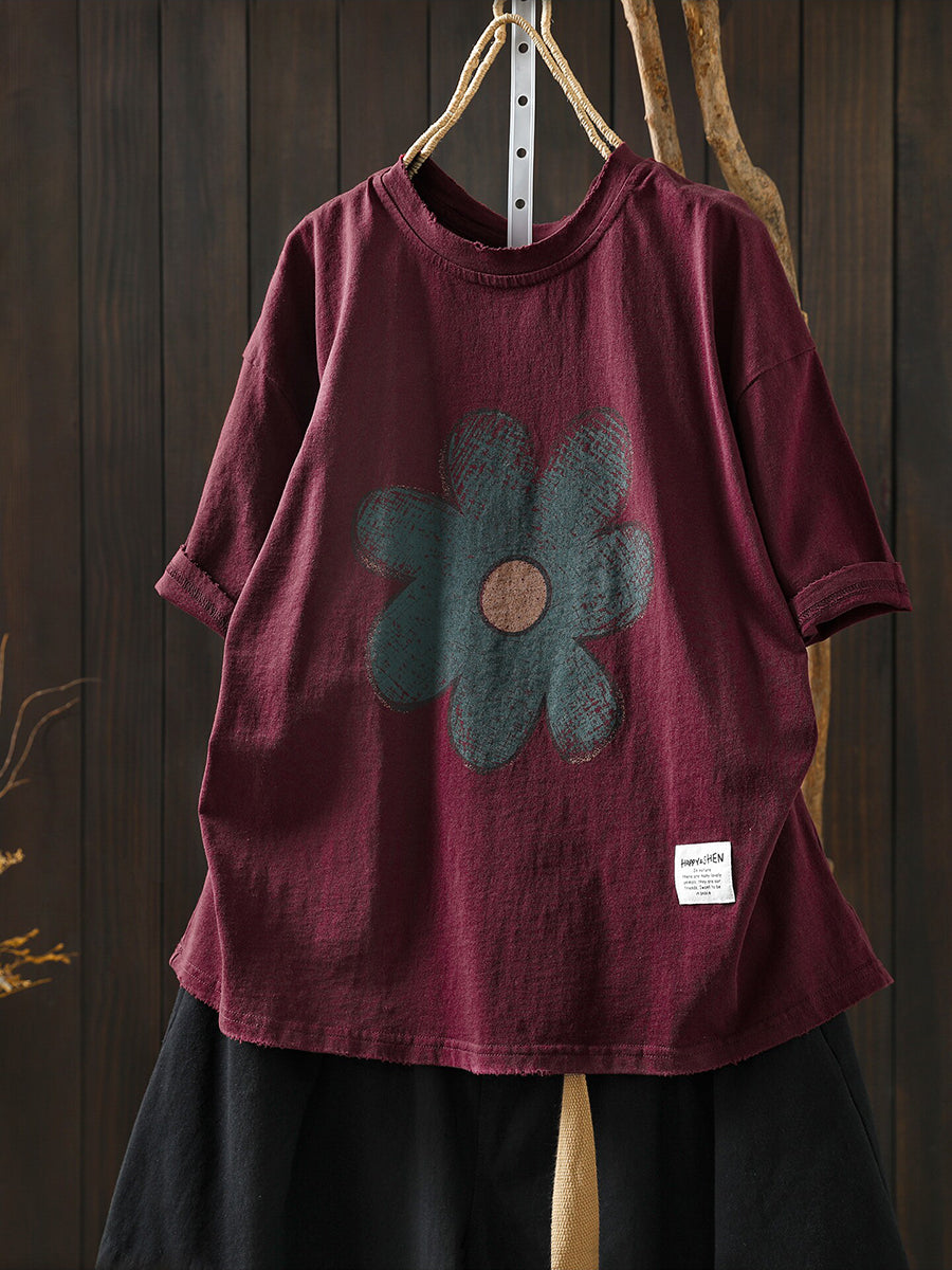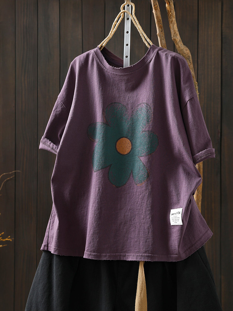 レディース 夏用 アーティスティックな花柄コットンTシャツ