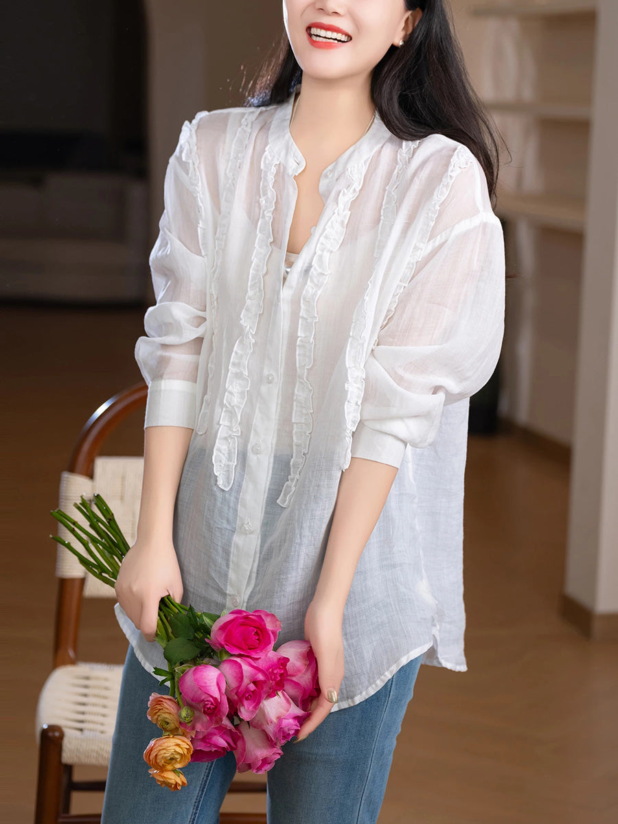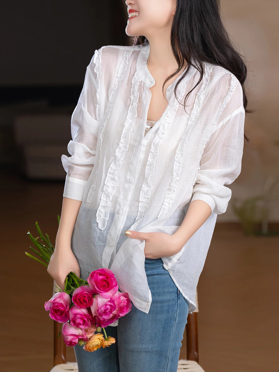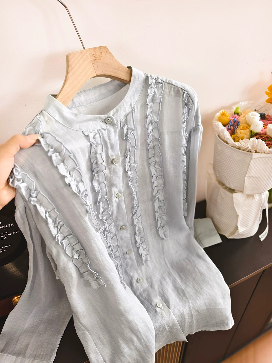 レディース 春物 アーティスティック スタンドカラー 100%ラミーシャツ