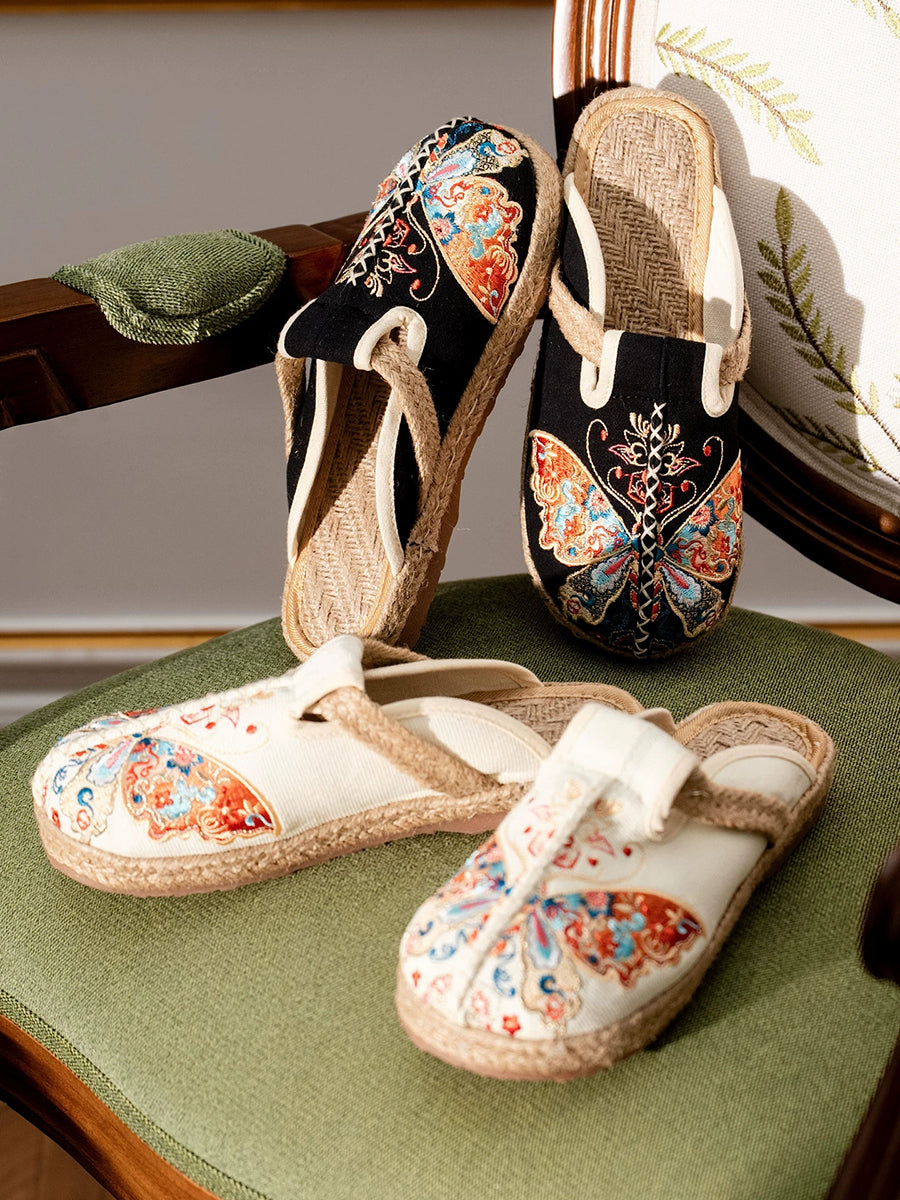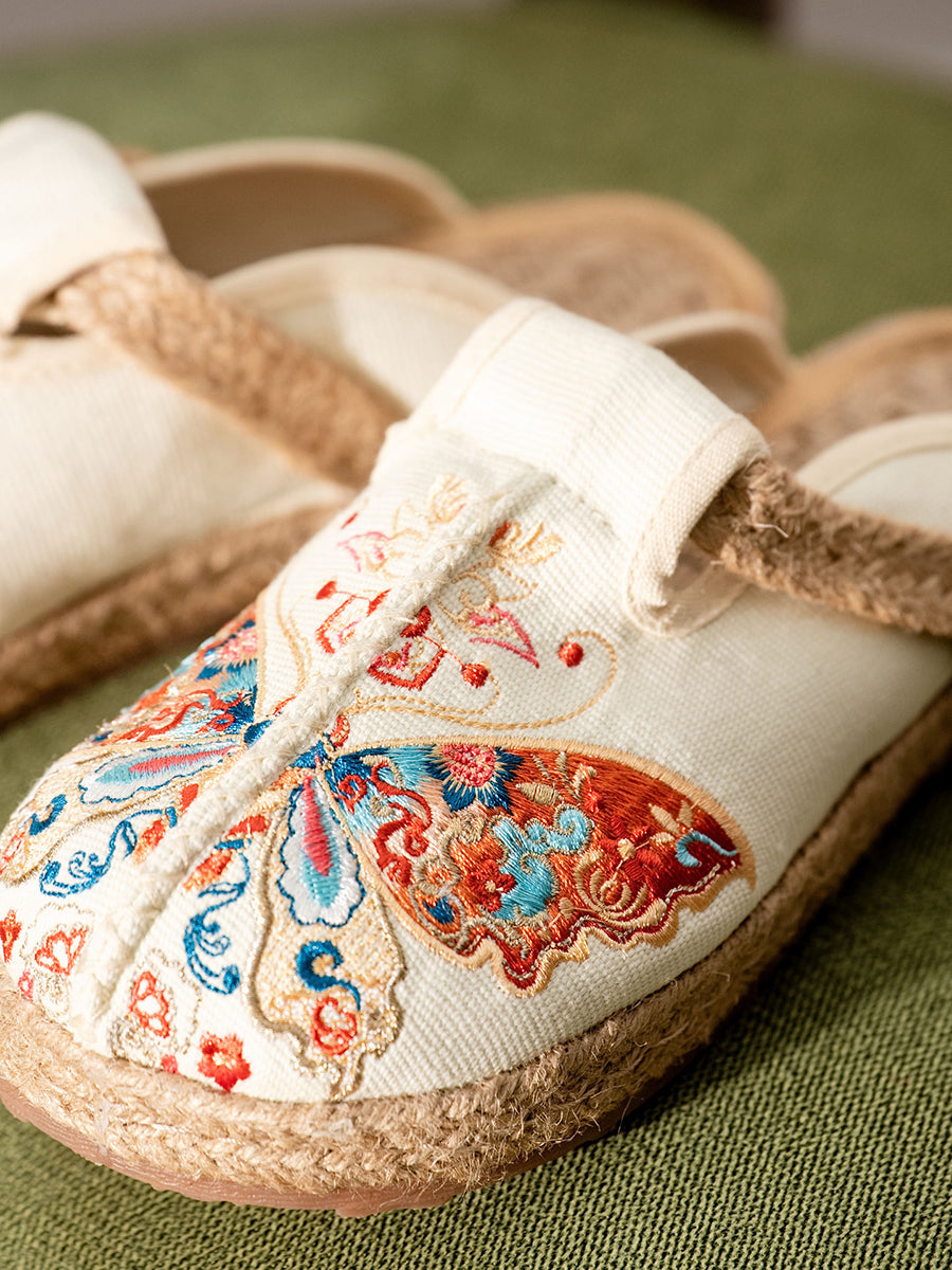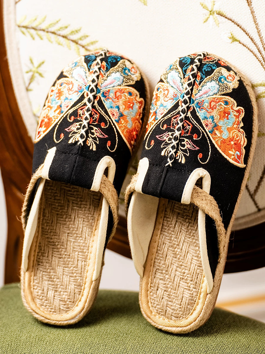 女性用夏用蝶の刺繍入りキャンバススリッパ