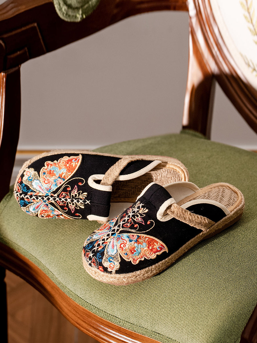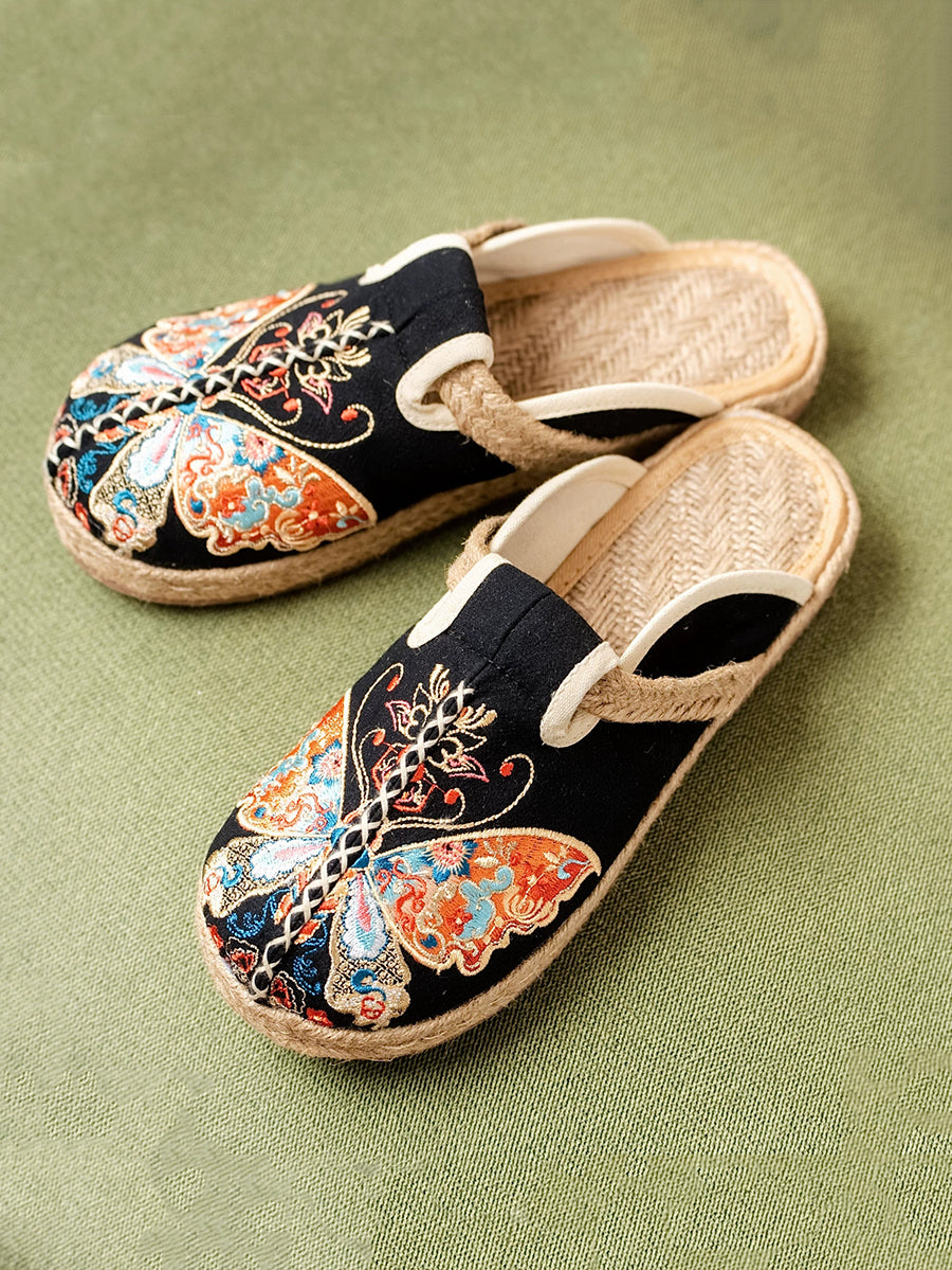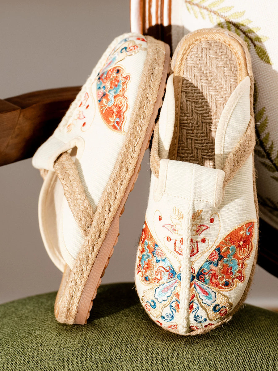 女性用夏用蝶の刺繍入りキャンバススリッパ