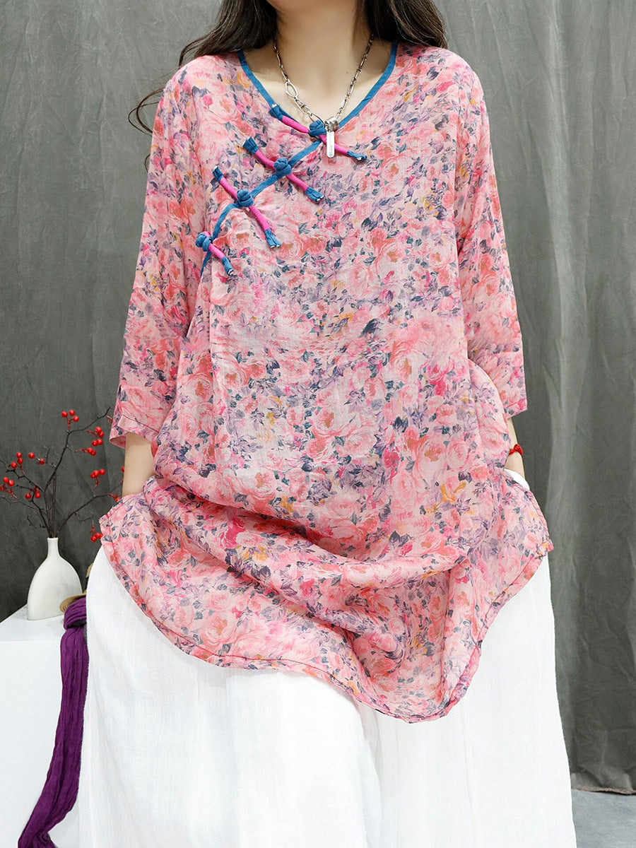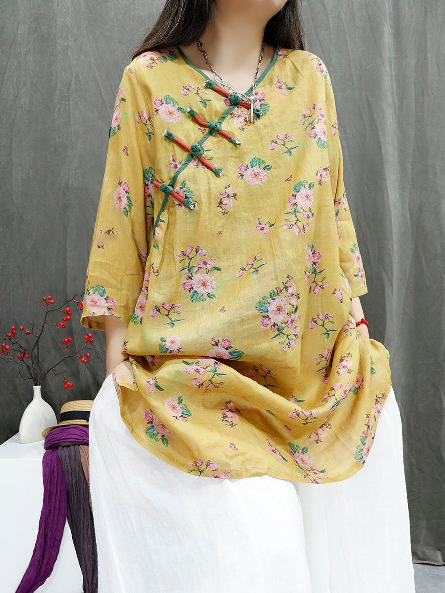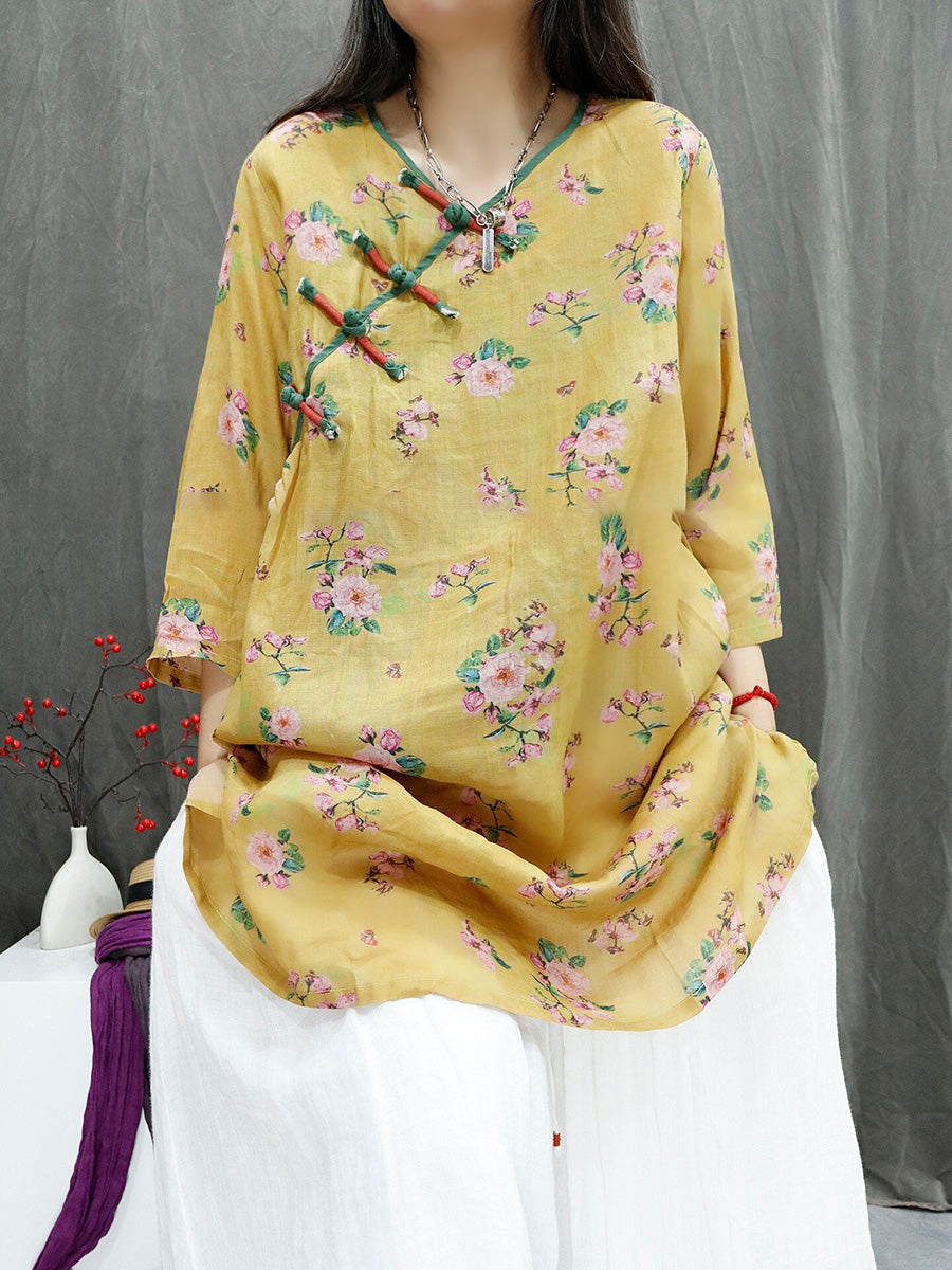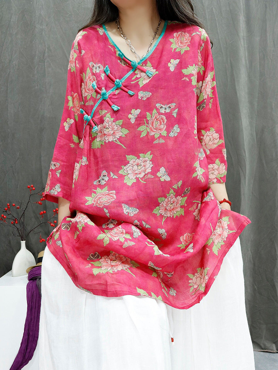 レディース 夏物 アーティスティック フラワー柄 100%ラミー Vネック ブラウス