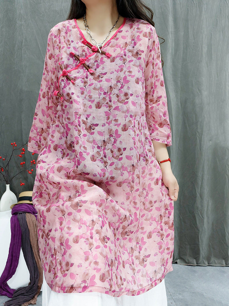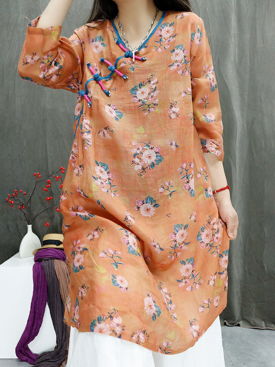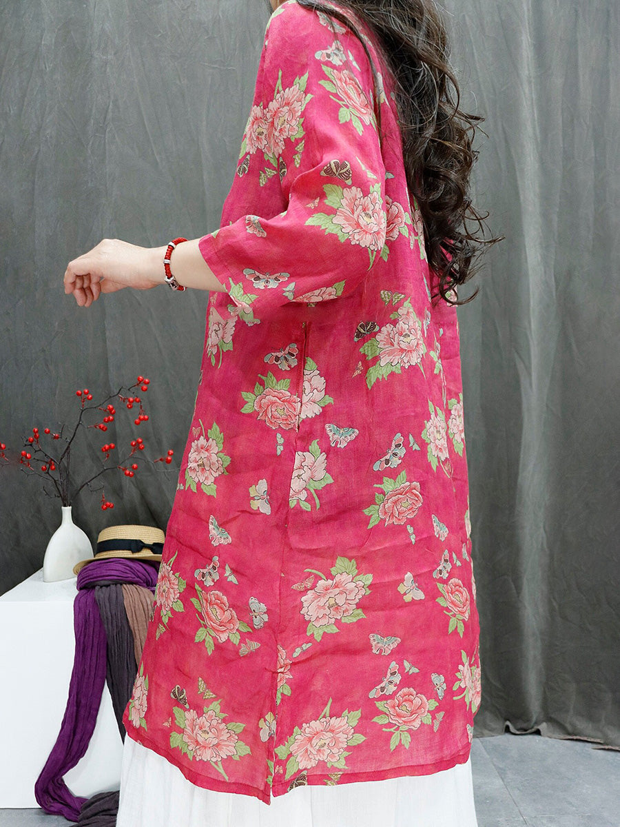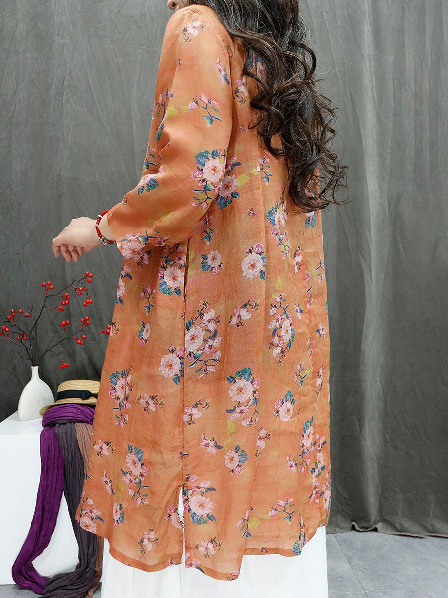 レディース 夏物 アーティスティック フラワー柄 100%ラミー Vネック ブラウス