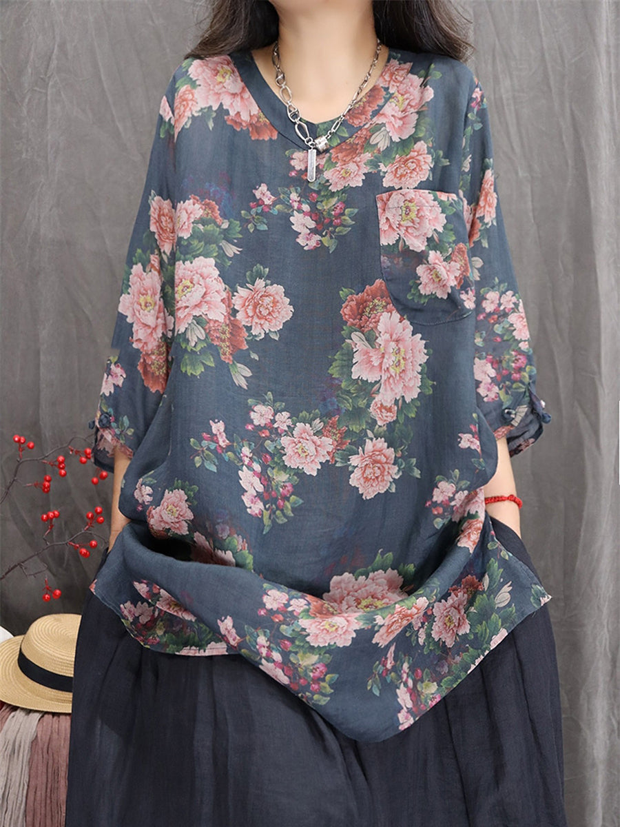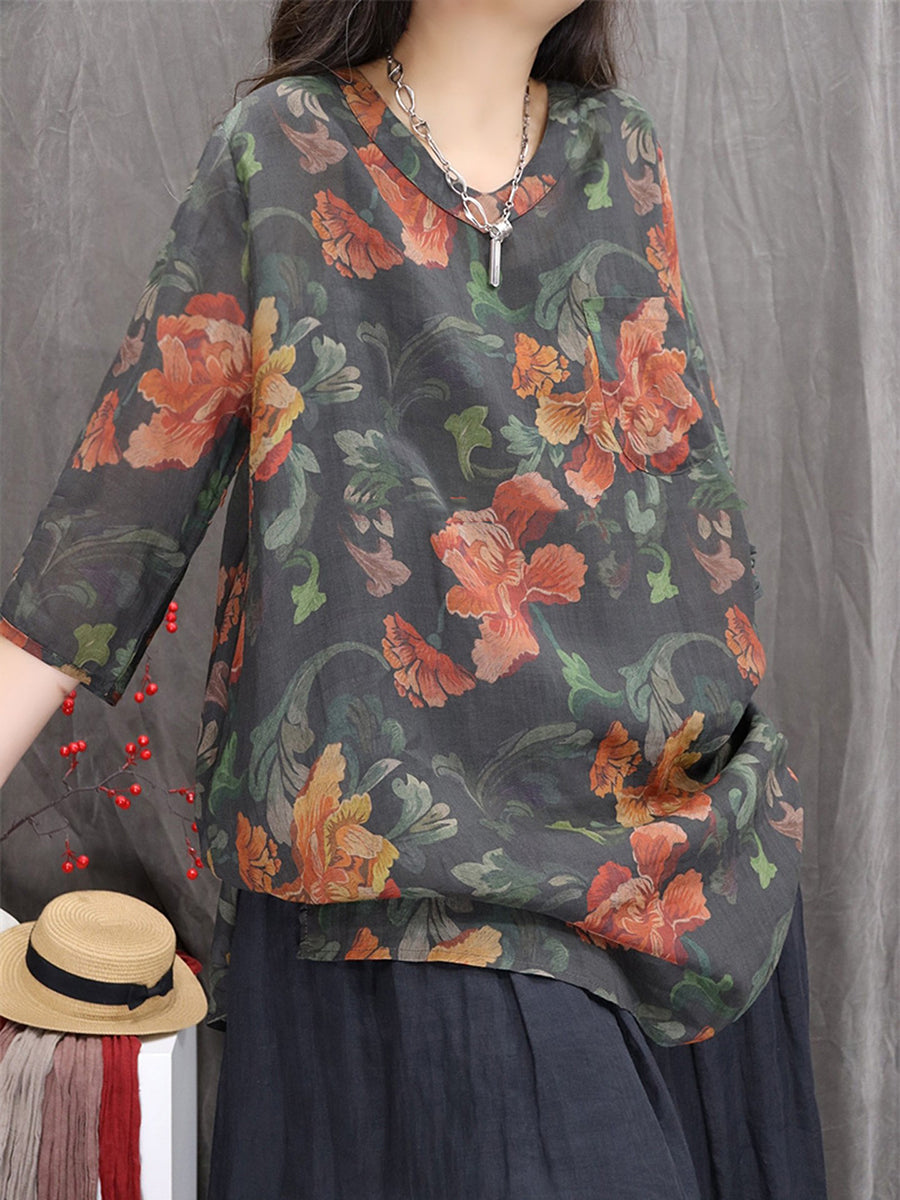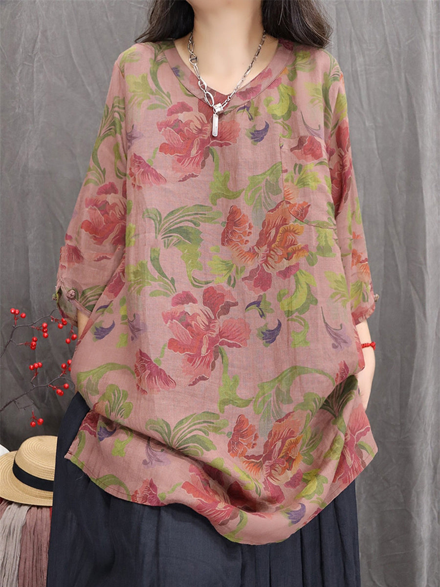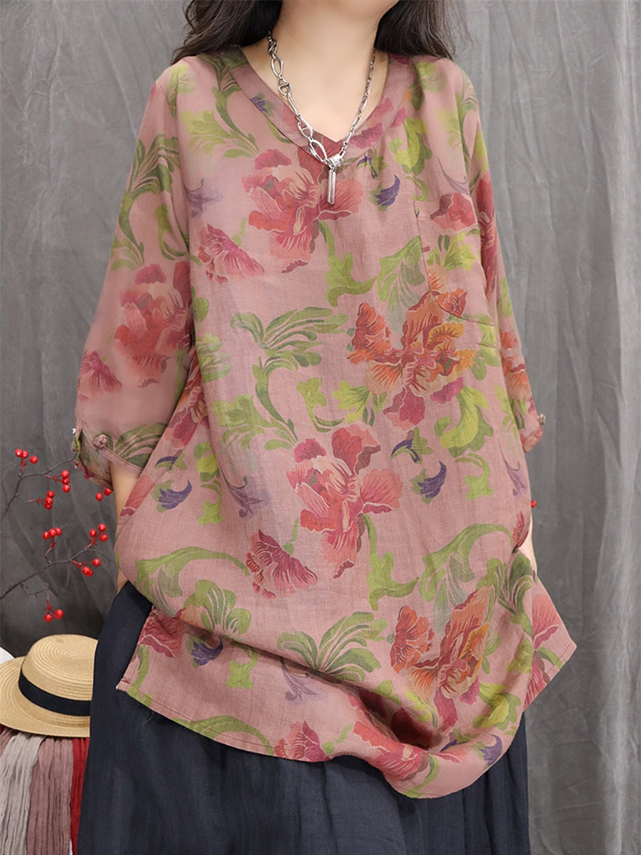 レディース アーティスティック スプリングフラワー Vネック 100%ラミー ブラウス