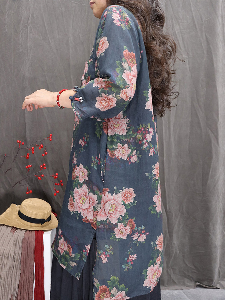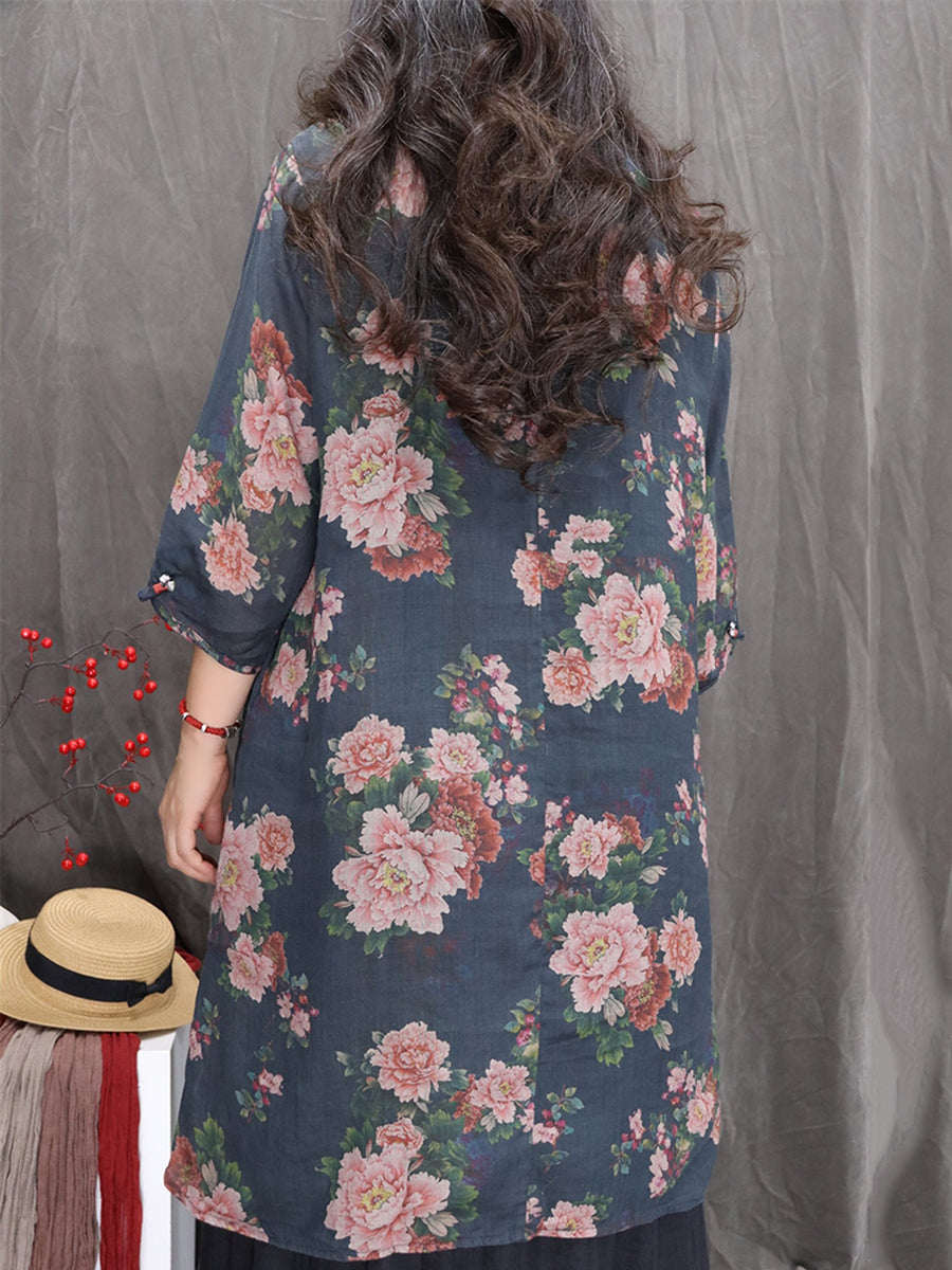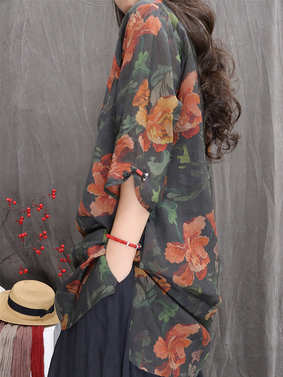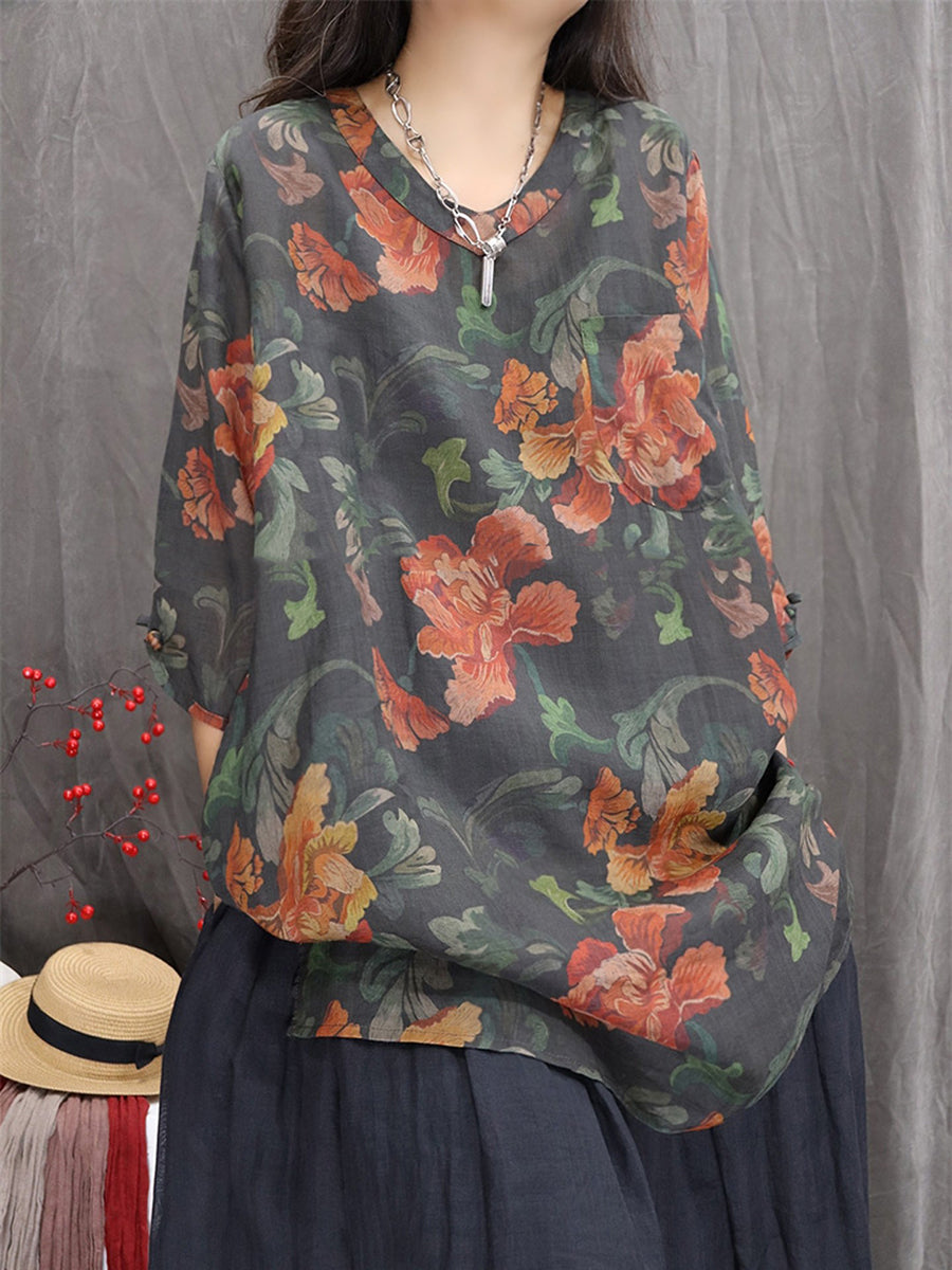 レディース アーティスティック スプリングフラワー Vネック 100%ラミー ブラウス
