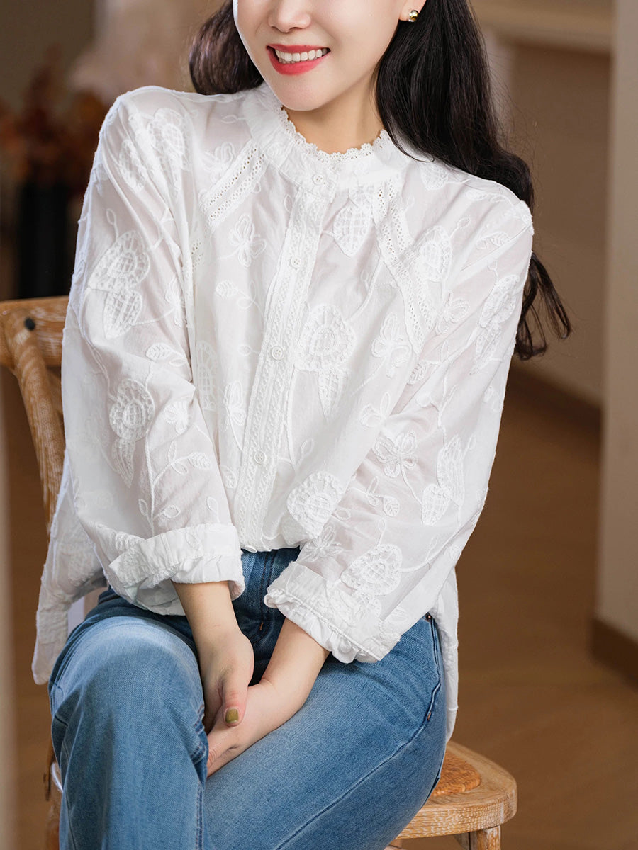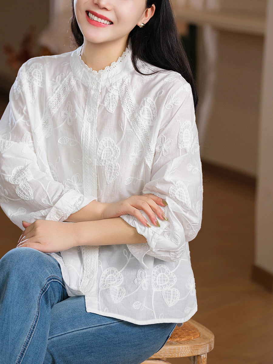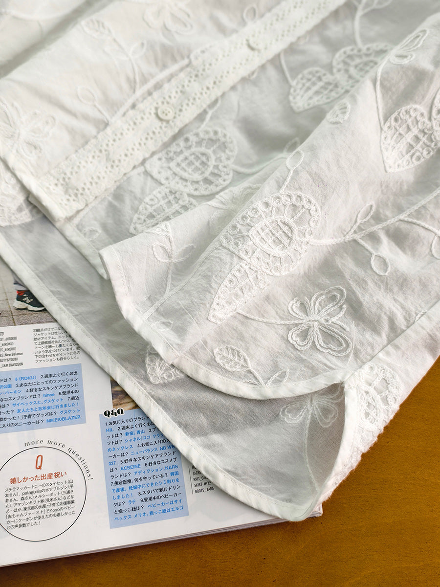 レディース 夏物 アーティスティック刺繍入りコットンシャツ