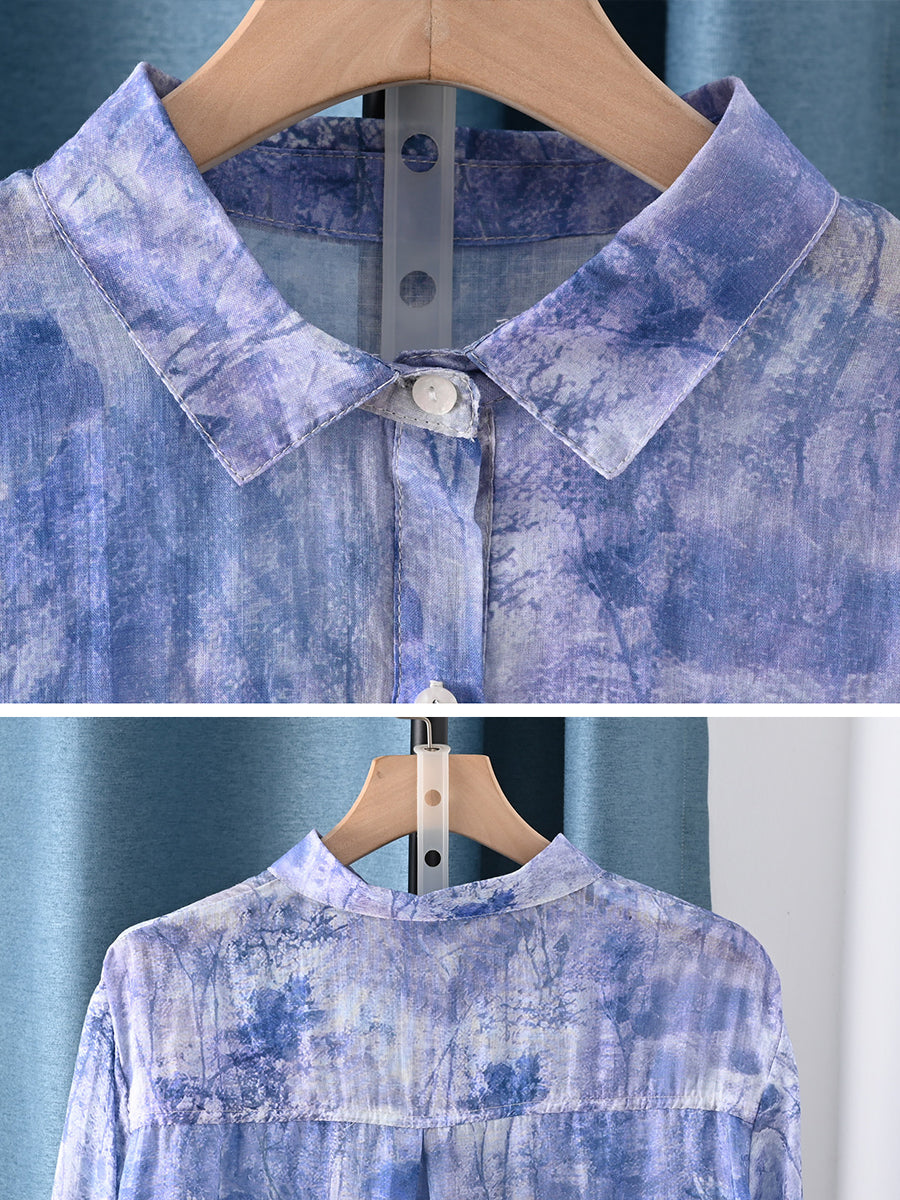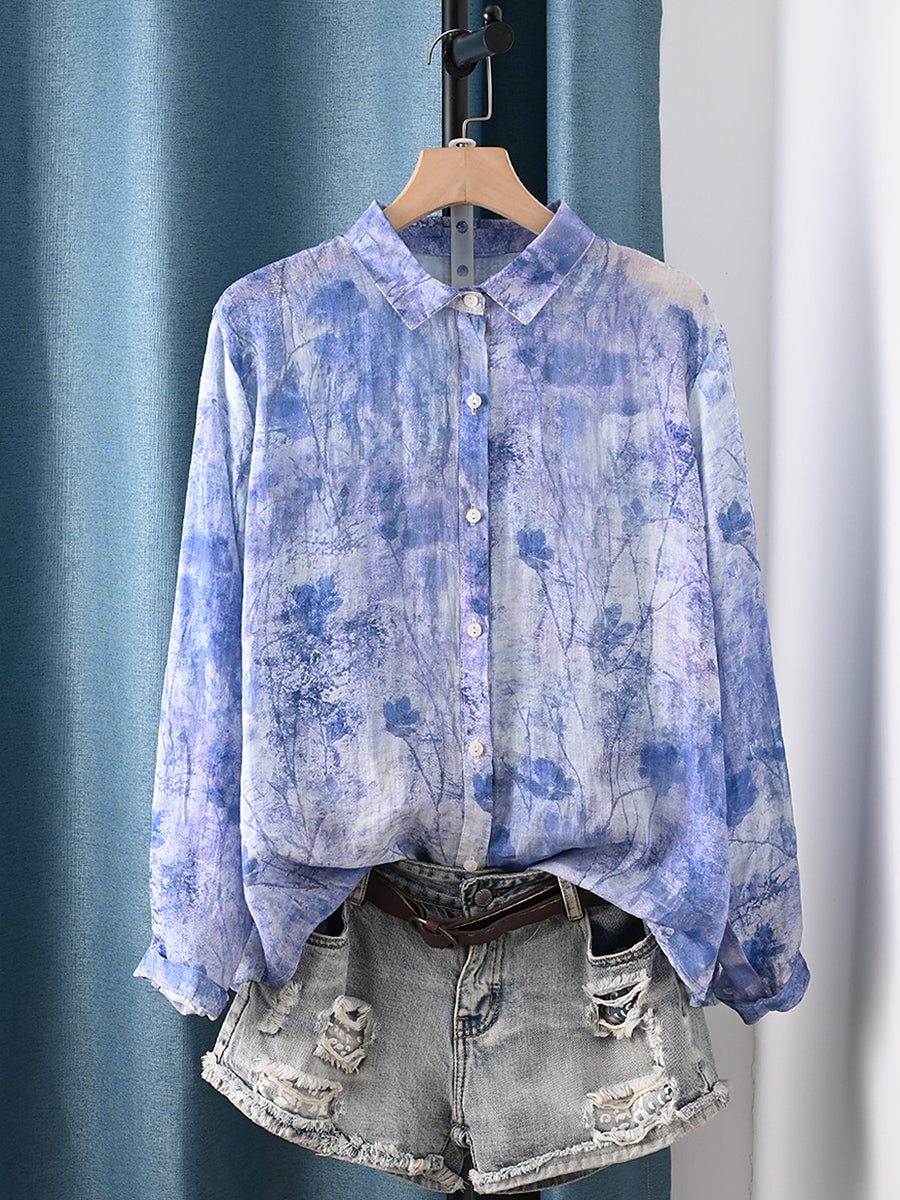 レディース サマー アーティスティックフラワー 100%ラミー ターンダウンカラー ブラウス