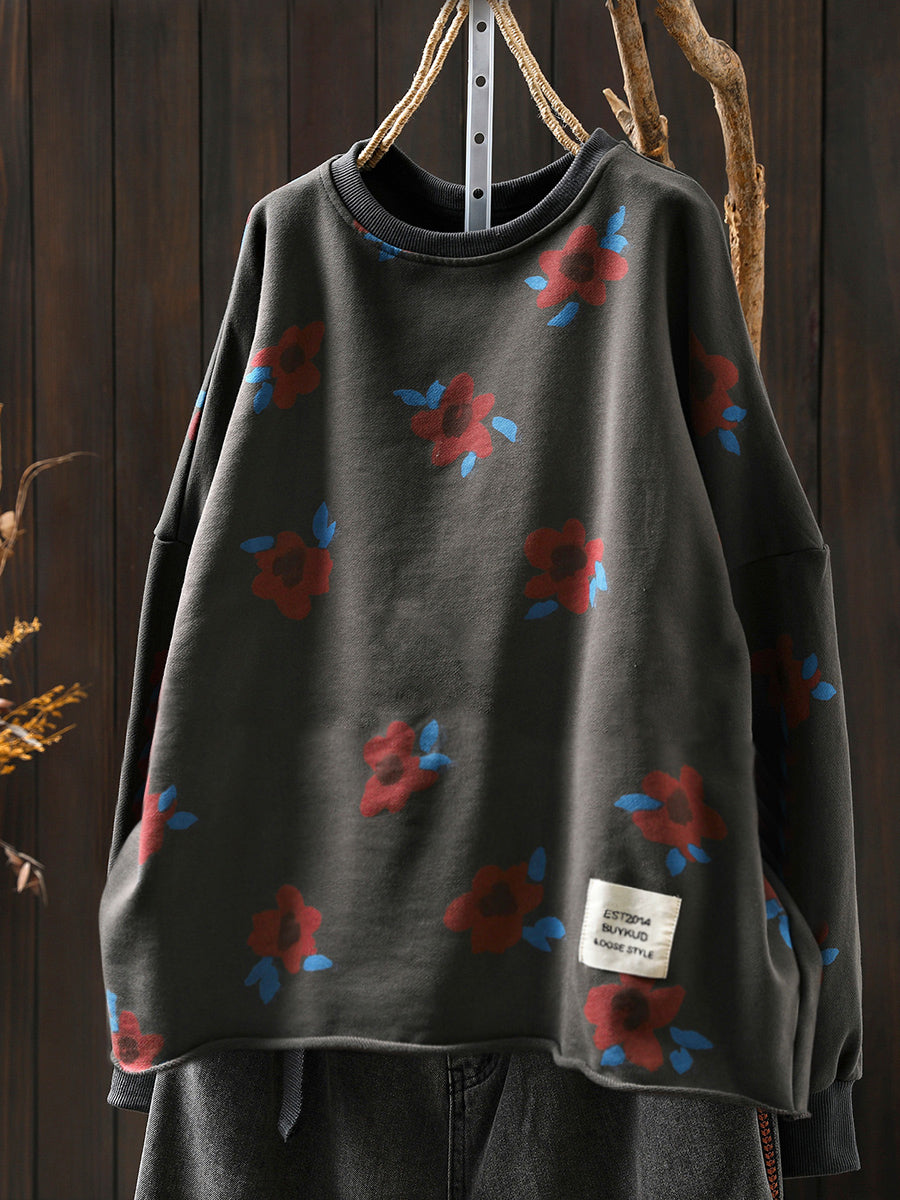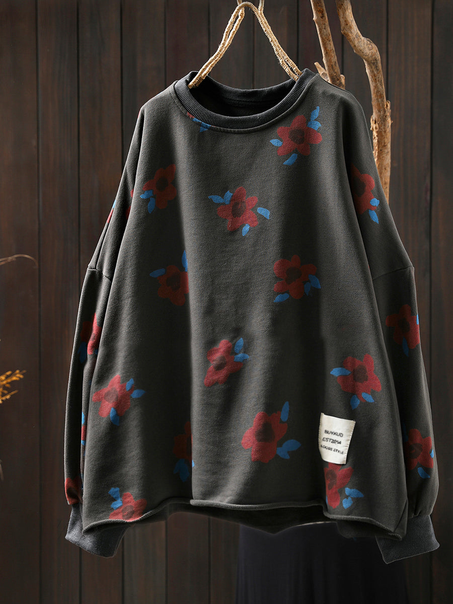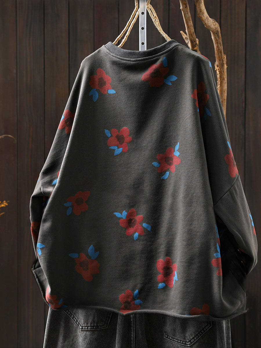 レディース 秋 アーティスティックフラワー Oネック コットンブラウス